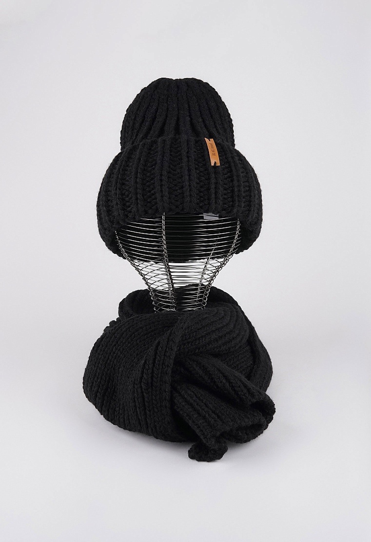 Однотонный комплект из новой коллекции изготовлен из мягкой ткани чёрного цвета, в составе которой нити натуральной шерсти и акрил. Классическая шапка выполнена в технике крупной вязки и дополнена отворотом. Объёмный шарф подарит высокий уровень комфорта в зимний сезон. Современный дизайн идеально сочетается с элементами базового гардероба.
