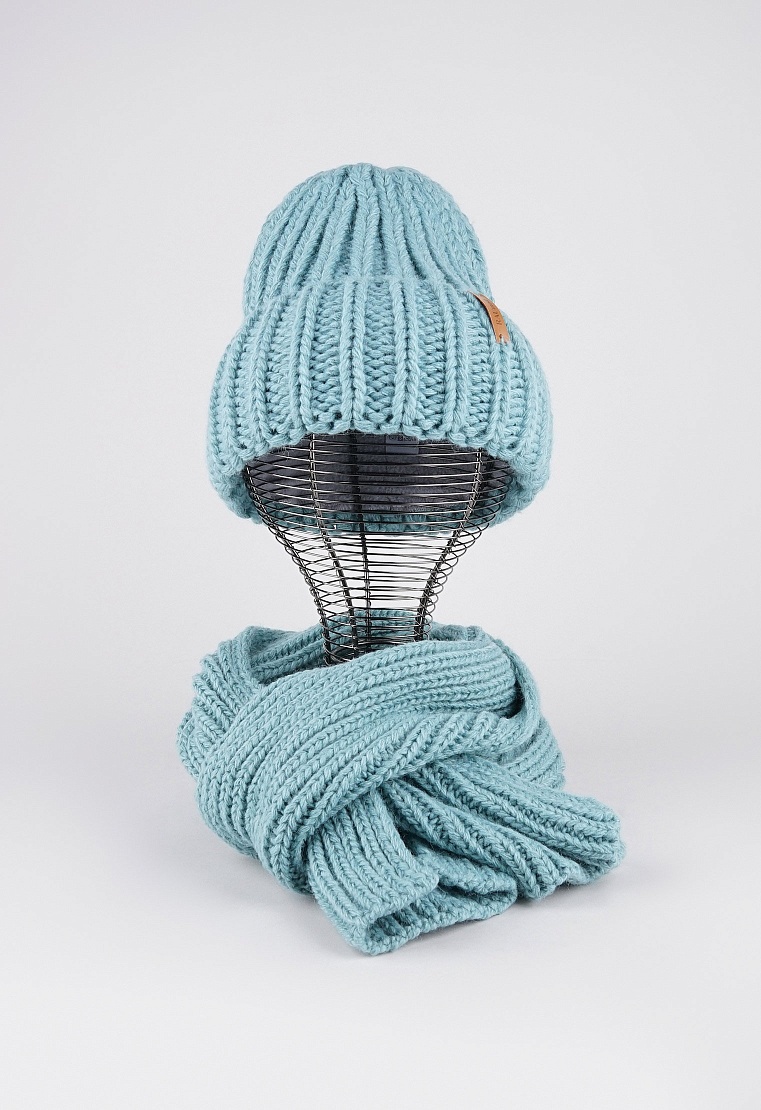 Однотонный комплект из новой коллекции изготовлен из мягкой ткани бирюзового оттенка, в составе которой нити натуральной шерсти и акрил. Классическая шапка выполнена в технике крупной вязки и дополнена отворотом. Объёмный шарф подарит высокий уровень комфорта в зимний сезон. Современный дизайн идеально сочетается с элементами базового гардероба.