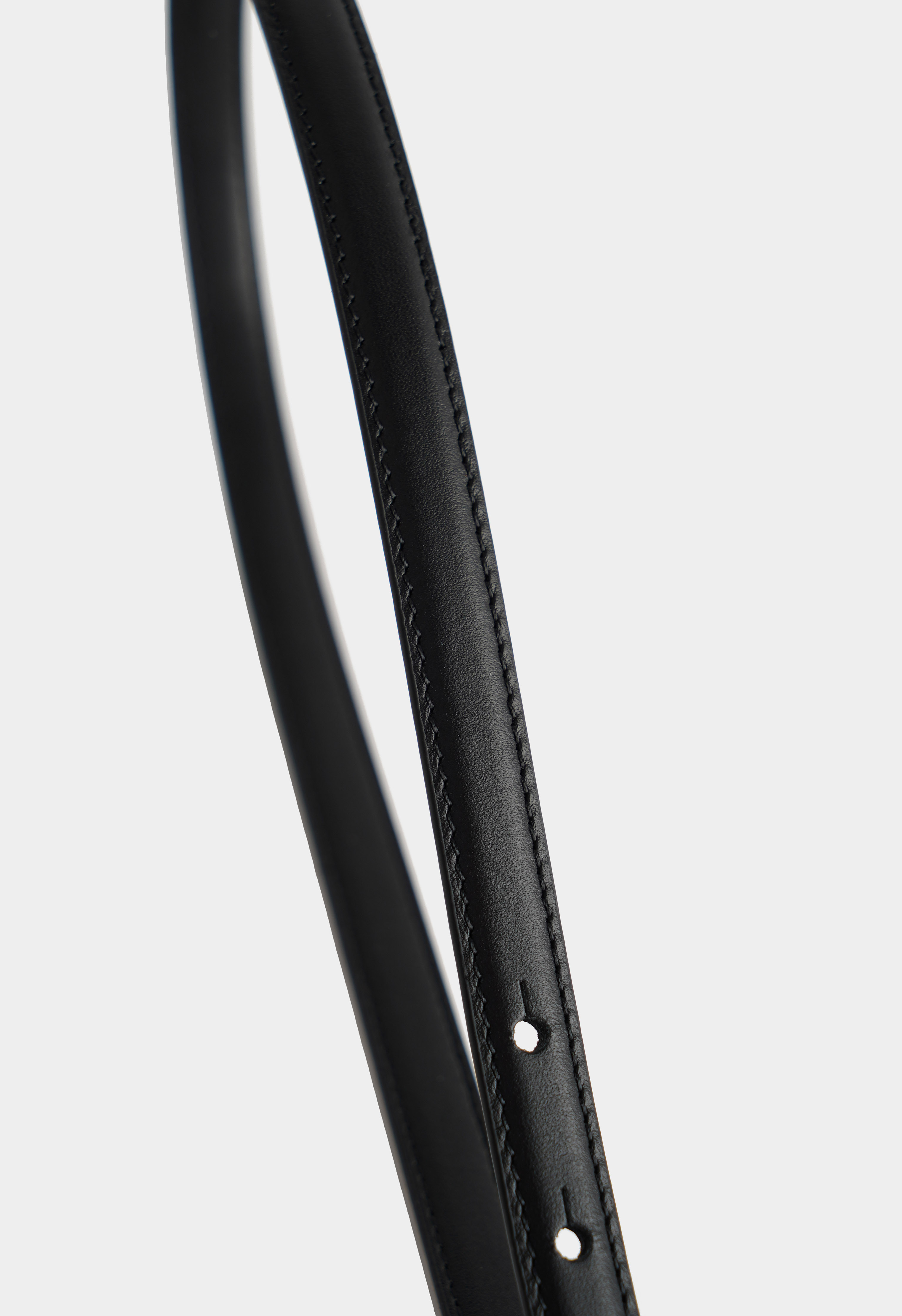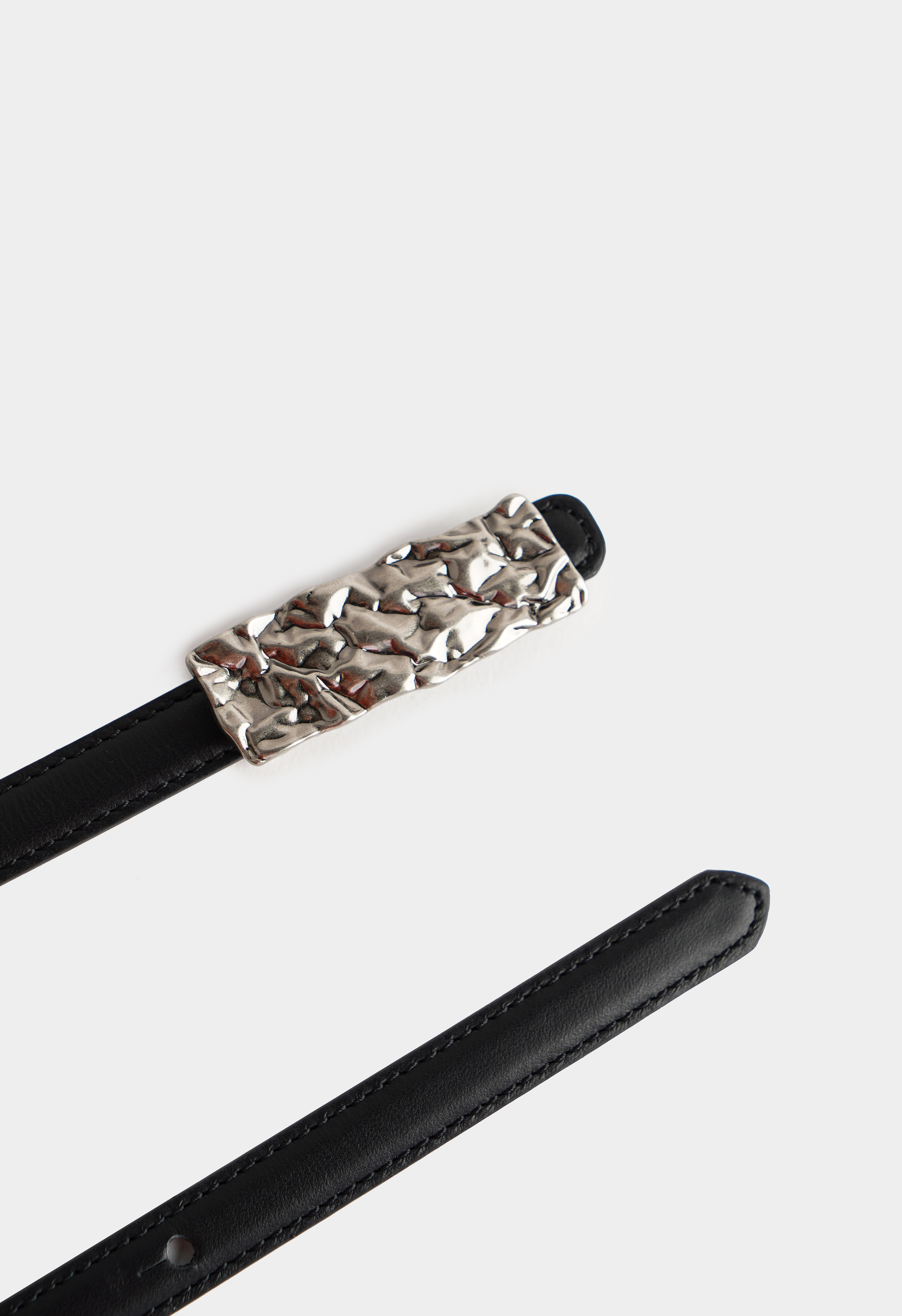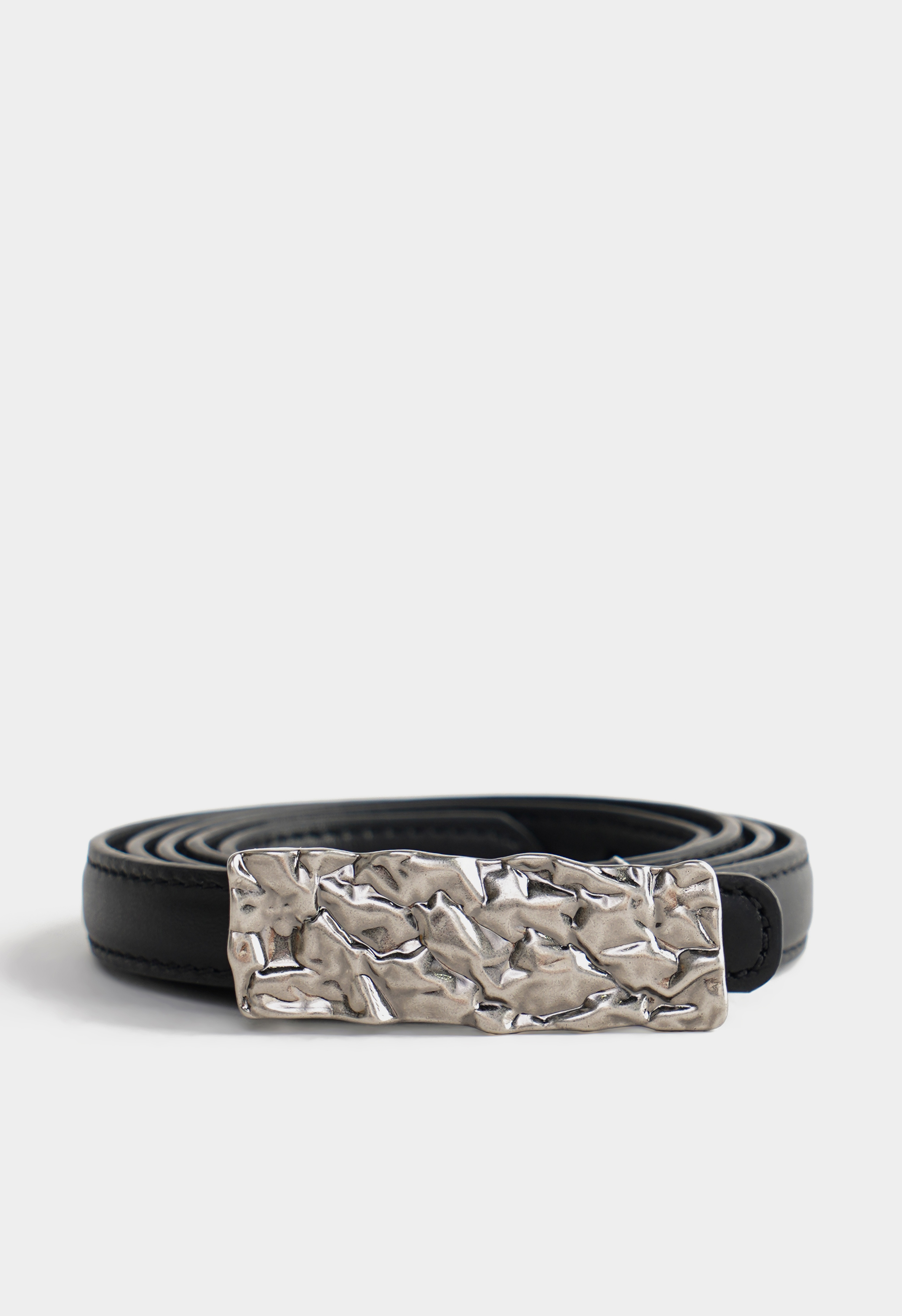 Черный ремень из натуральной кожи – строгая база с эффектной деталью, которая сразу делает образ более собранным. Акцентная серебряная пряжка с фактурной «мятой» поверхностью красиво ловит свет и смотрится как украшение, при этом остается универсальной.