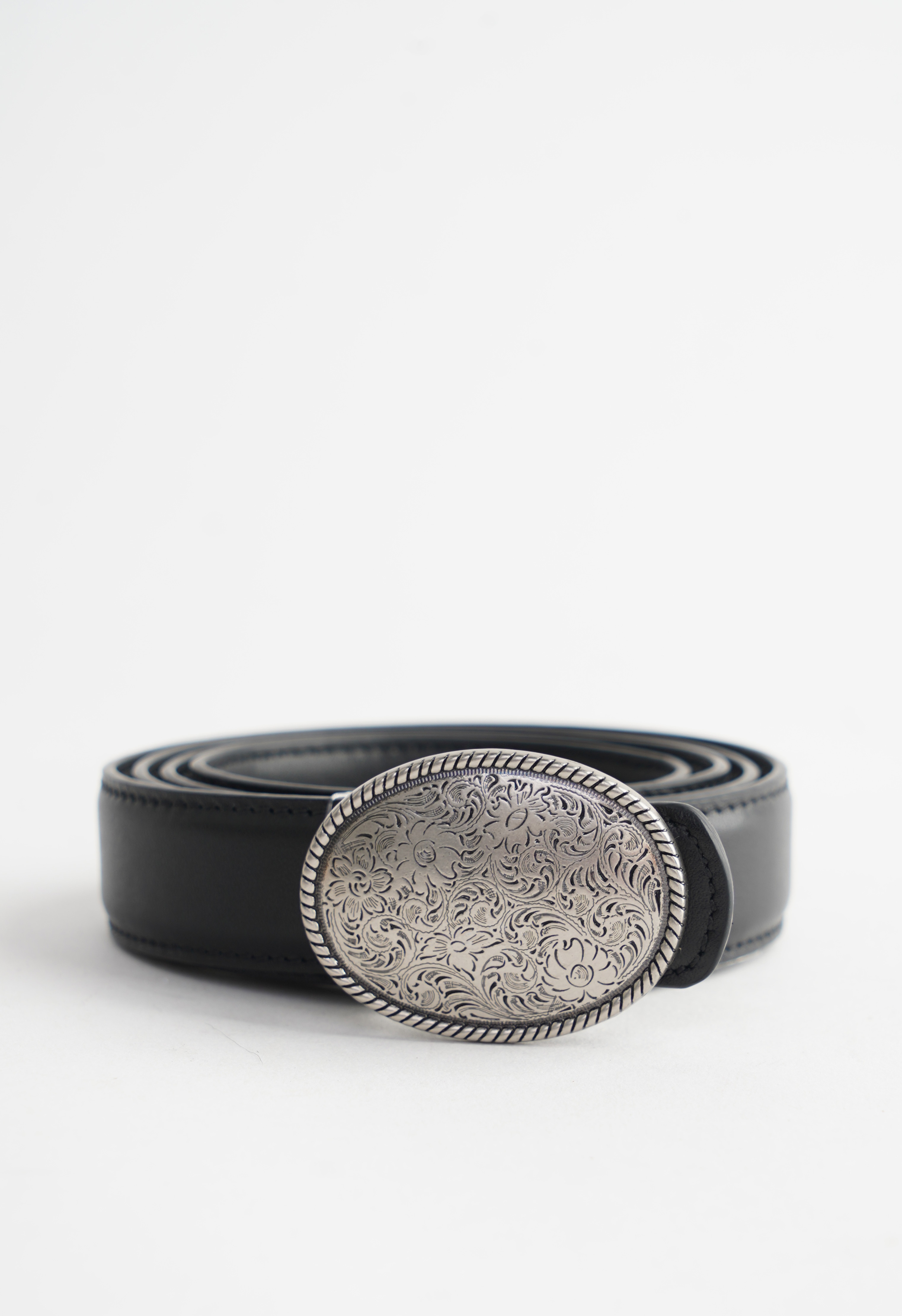 Акцент образа – ремень из черной натуральной кожи с выразительной серебряной пряжкой овальной формы. Тонкая гравировка и декоративный кант красиво ловят свет и смотрятся как украшение, а гладкая кожа с аккуратной строчкой добавляет ощущение дорогой, ухоженной базы.