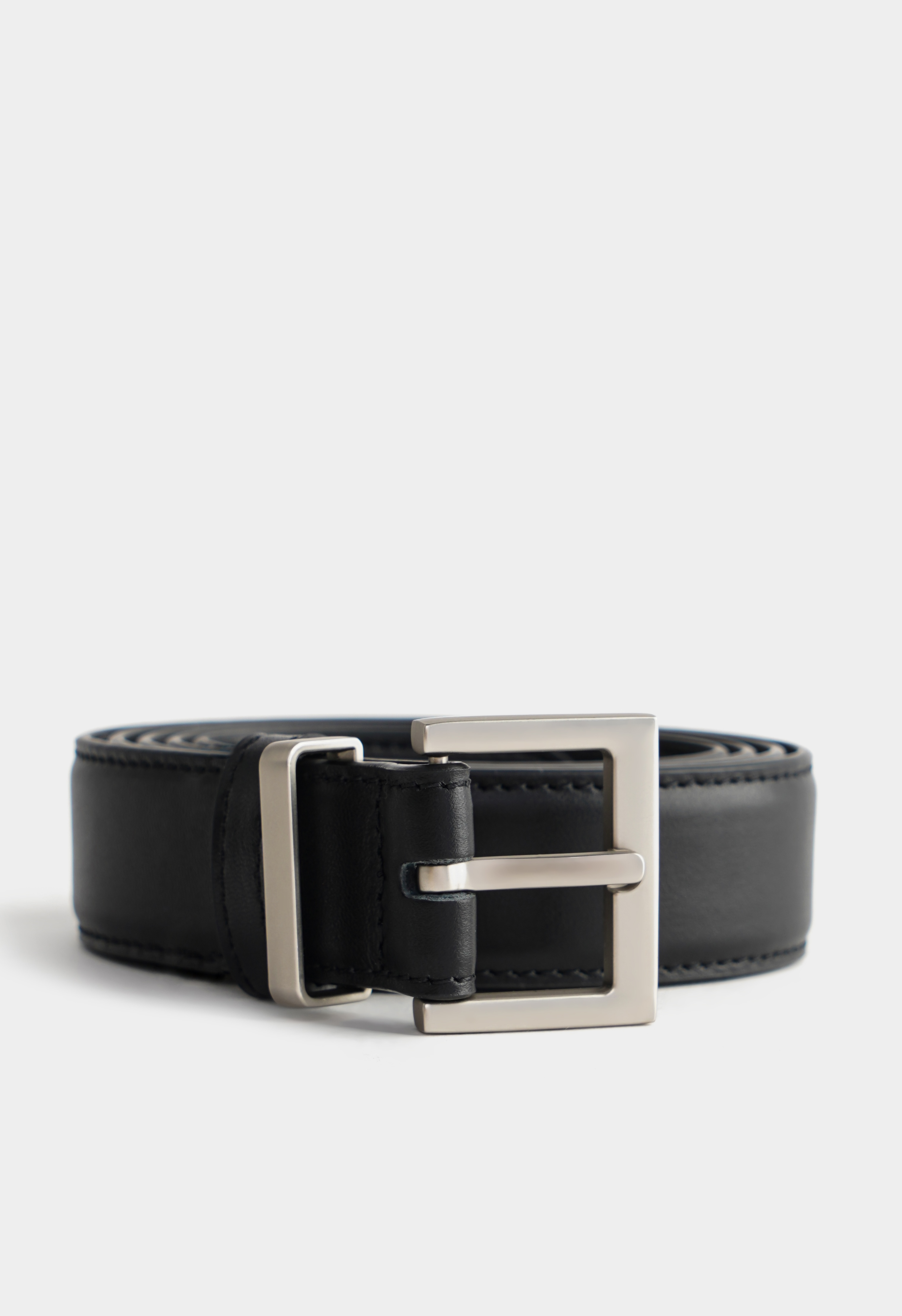 Классический черный ремень из натуральной кожи – аккуратная база, которая делает образ собранным и уверенным. Широкая прямоугольная серебряная пряжка выглядит строго и современно, подчеркивая строгие линии и минималистичный стиль.