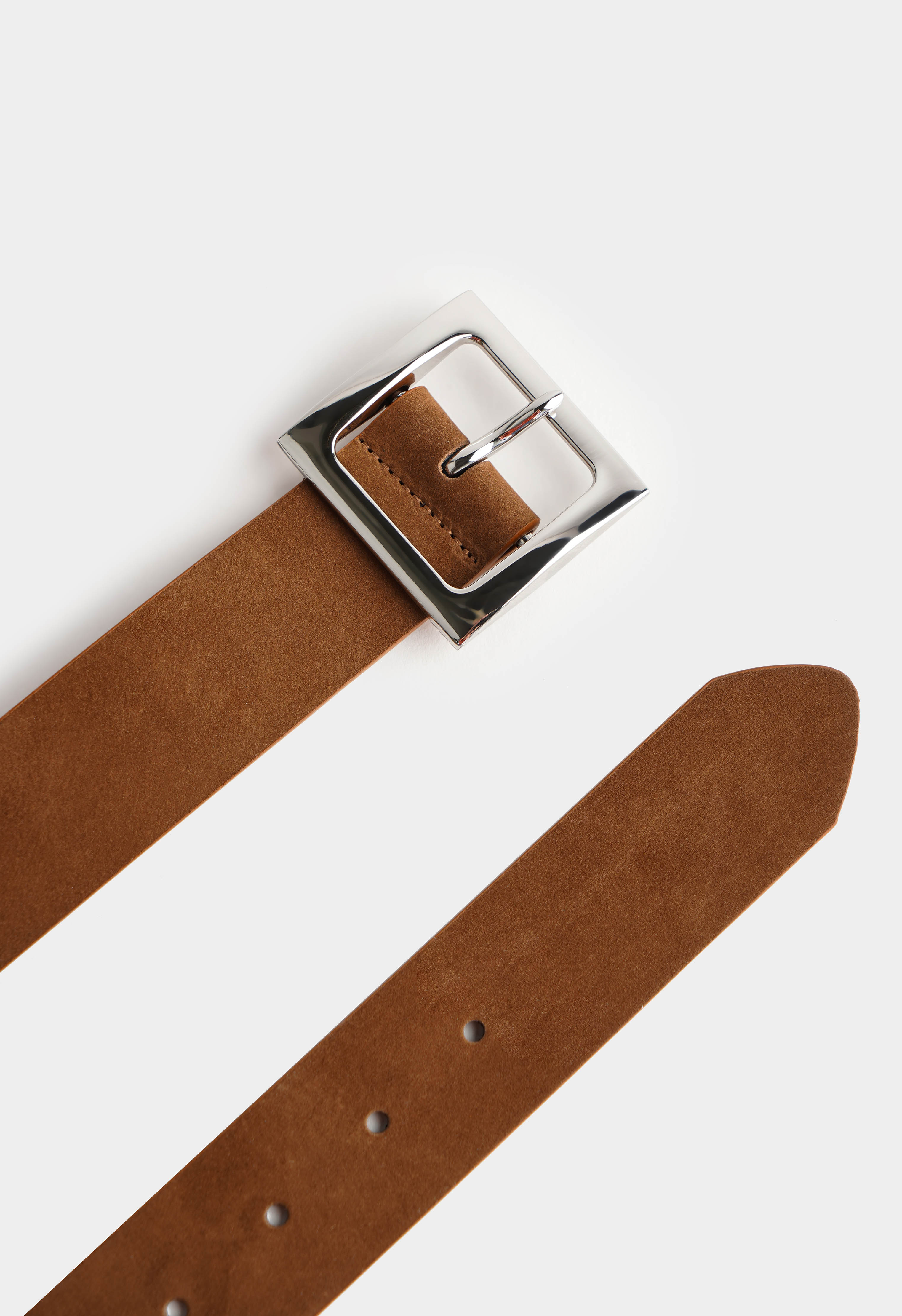 Коричневый ремень из натурального нубука – стильная деталь с мягкой бархатистой фактурой, которая добавляет образу настроения. Материал выглядит благородно и аккуратно, а широкая квадратная серебряная пряжка с зеркальным блеском превращает ремень в заметный акцент. Плотный ремешок хорошо держит форму и красиво подчеркивает талию.