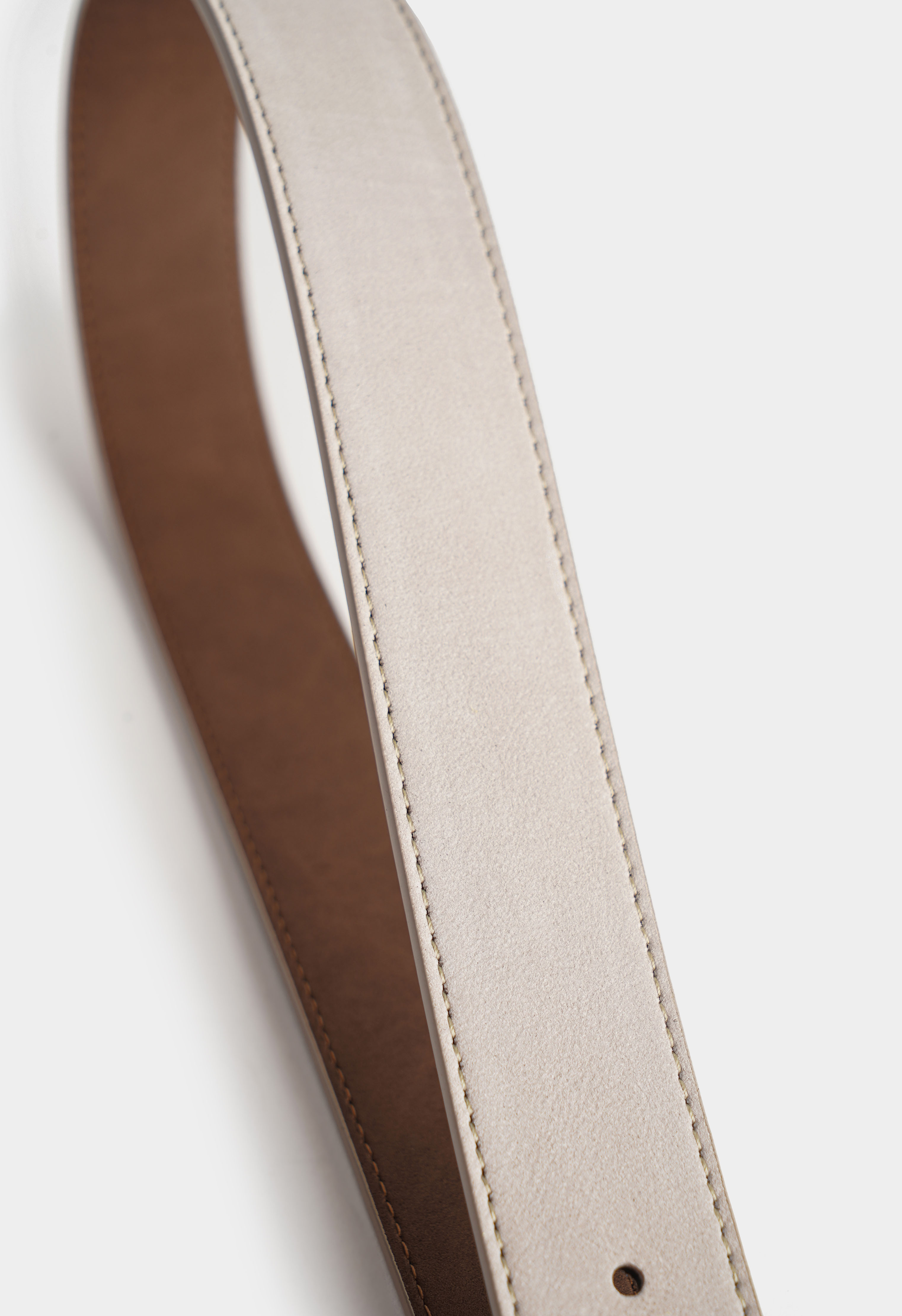 Серый ремень из натурального нубука – спокойная, благородная база с мягкой бархатистой фактурой, которая выглядит дорого и аккуратно. Матовая золотая пряжка прямоугольной формы добавляет акцент и красиво контрастирует с холодным оттенком нубука.