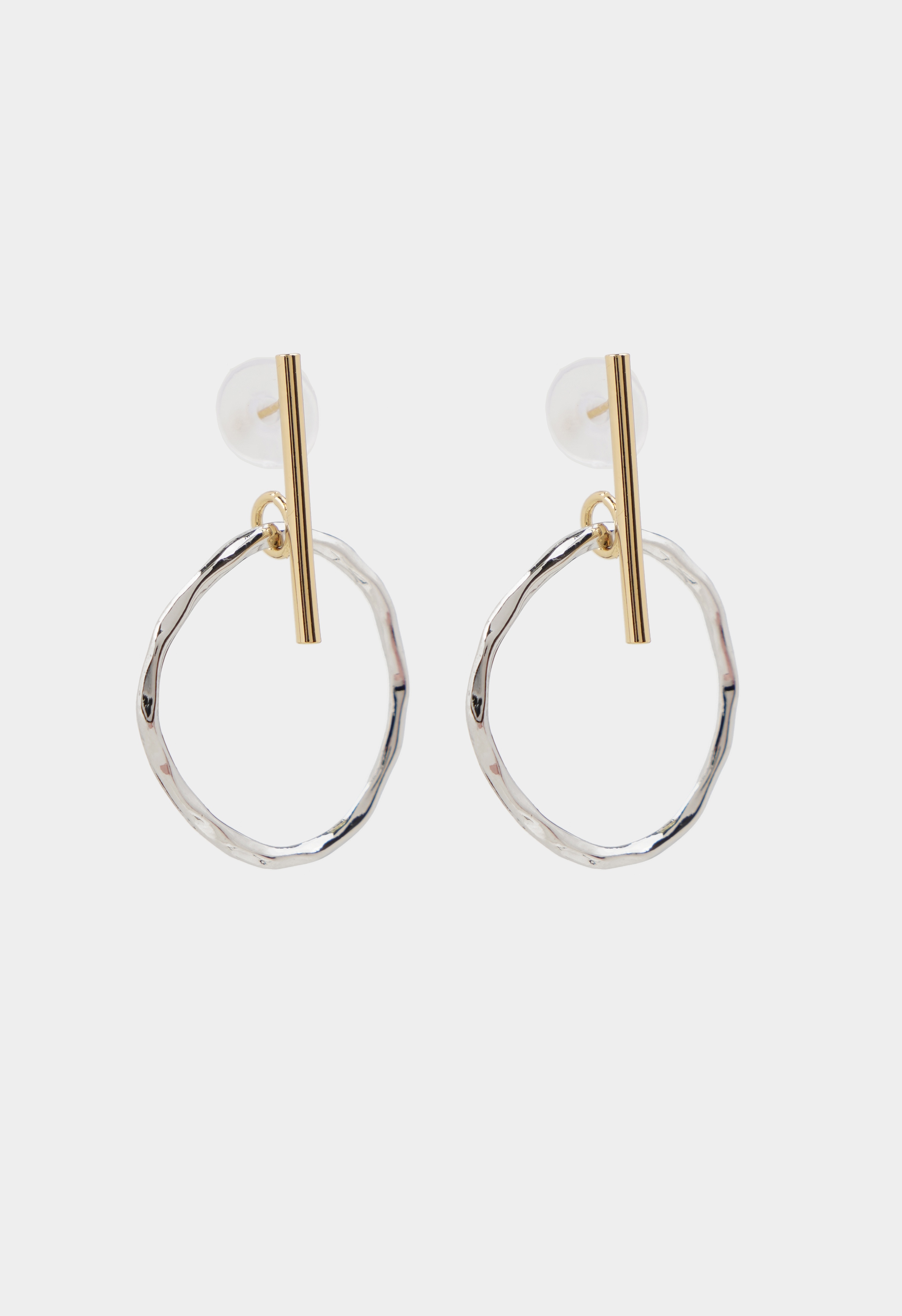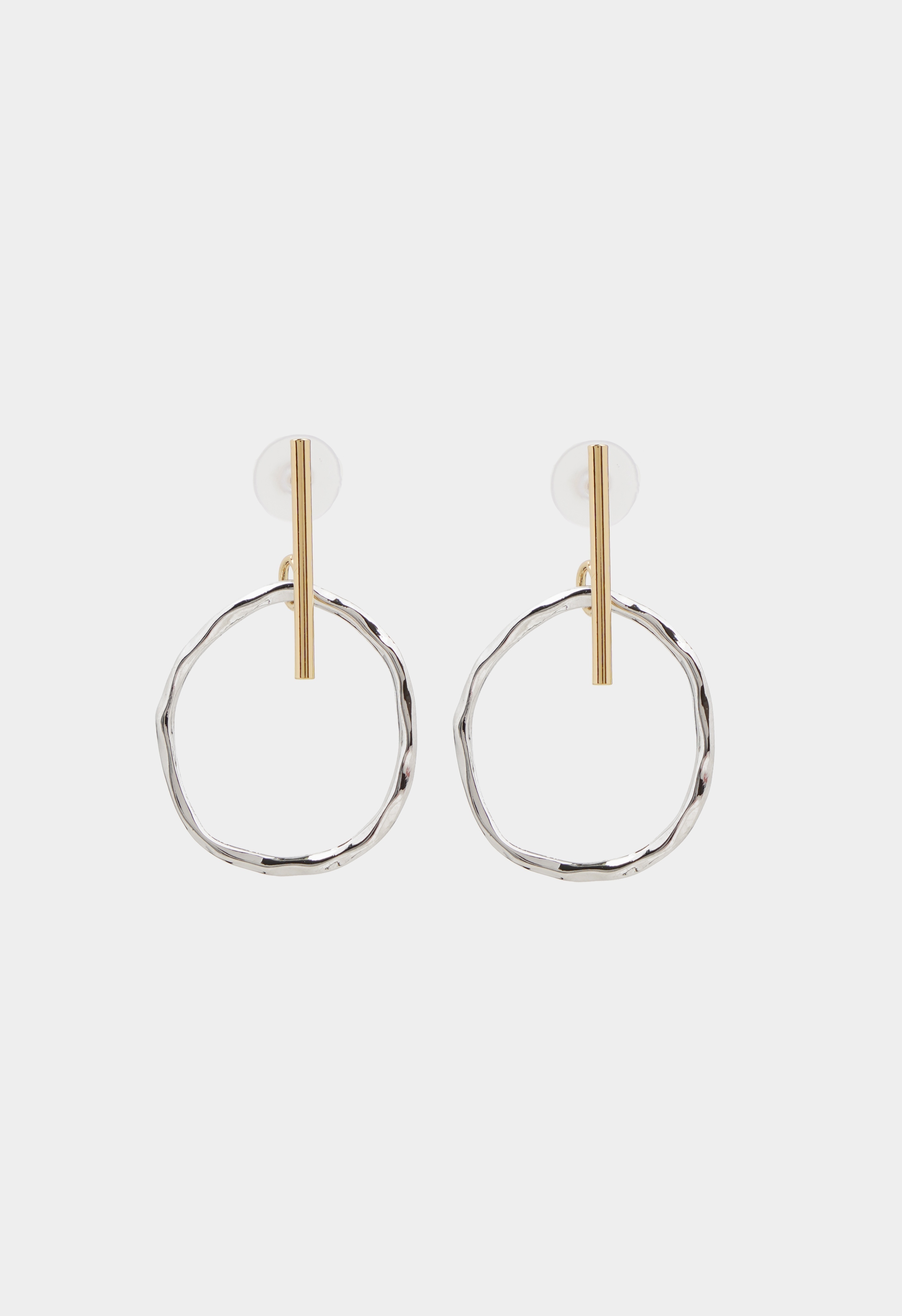 Геометрия и контраст в чистом виде: золотистый штрих и серебряное кольцо создают выразительную, но легкую композицию. Минимализм формы сочетается с текстурой, придавая сережкам характер. Удобная застежка-пусет фиксирует аксессуар надежно, не доставляя дискомфорта.