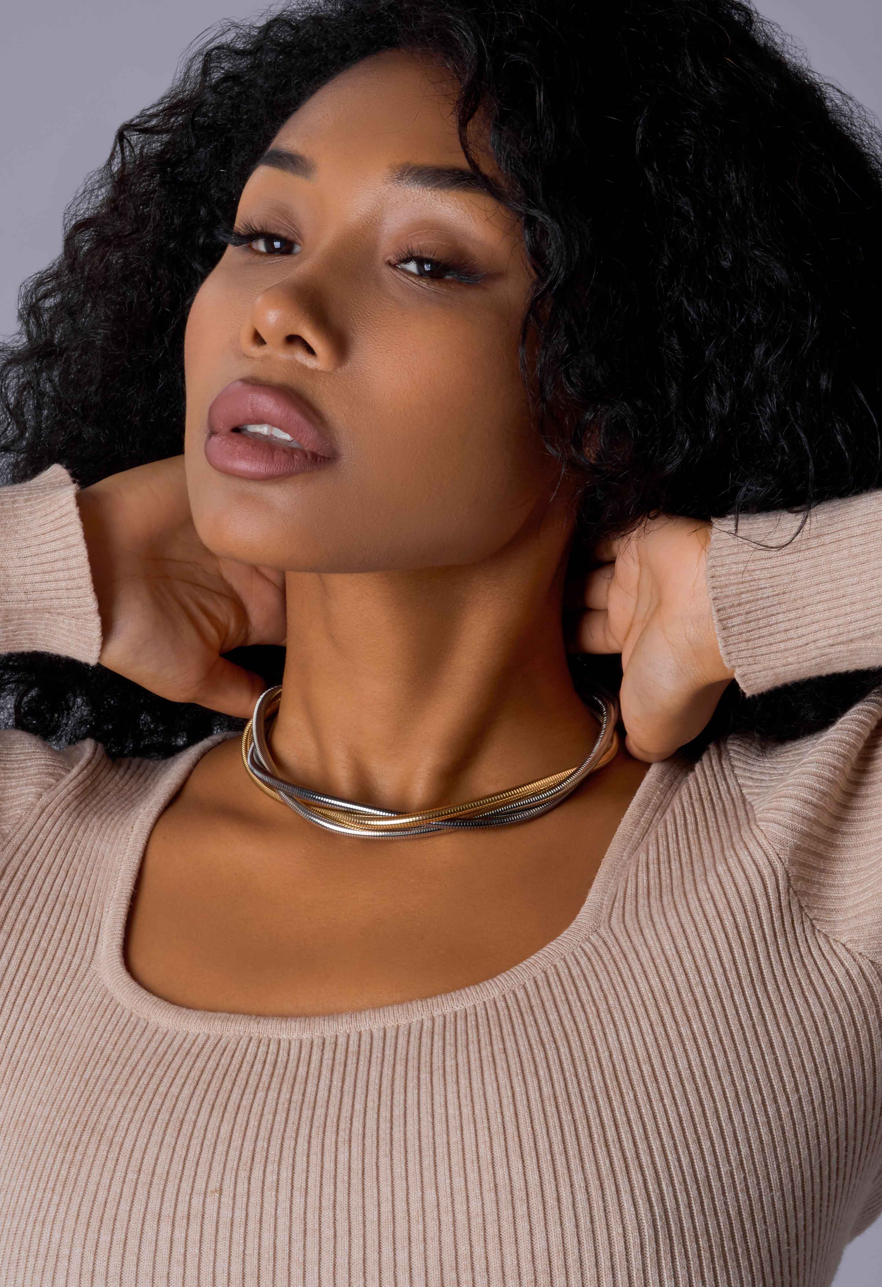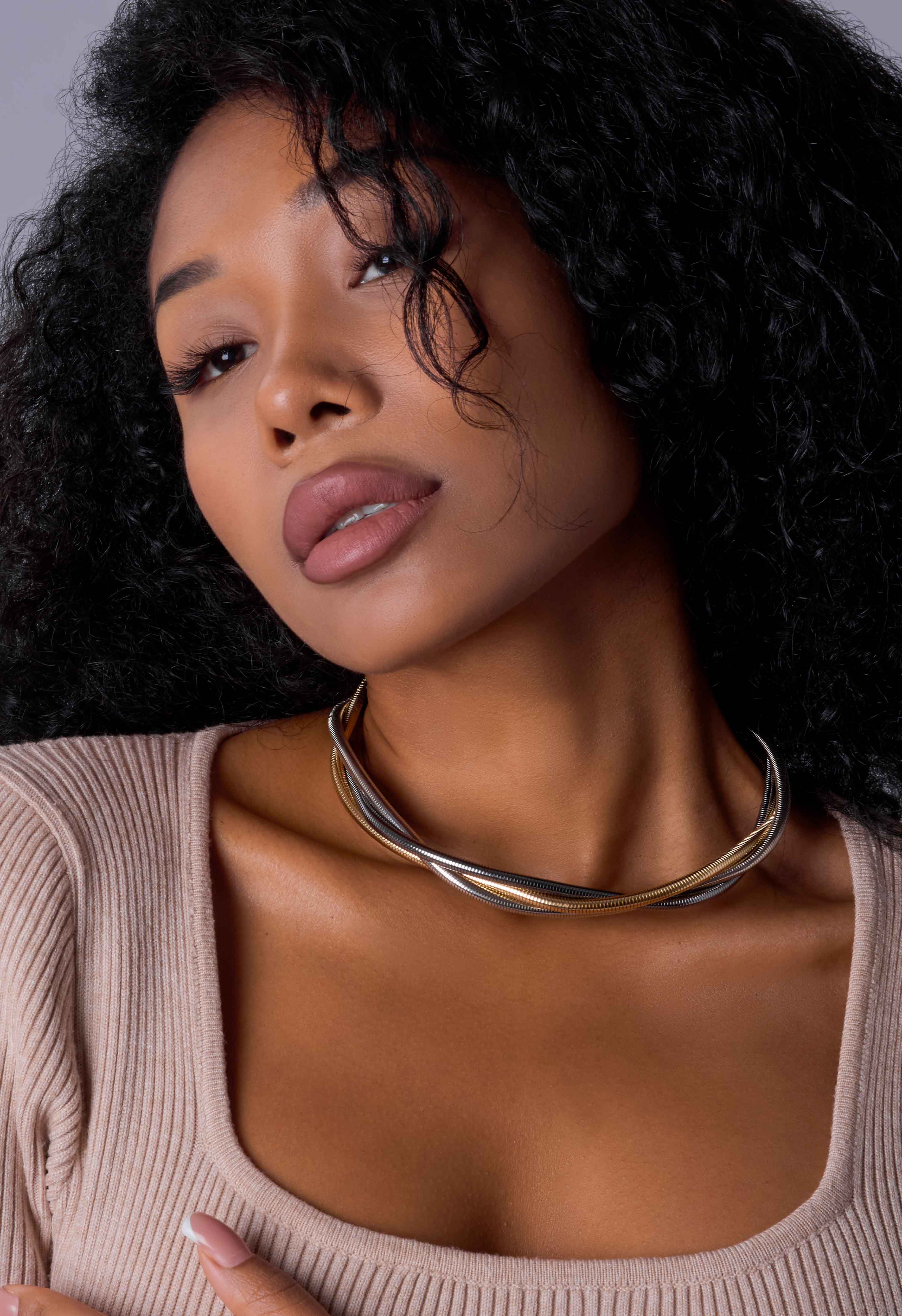 Ожерелье из ювелирного сплава с застежкой на карабине сочетает в себе три цвета: золотой, серебряный и черный. Украшение идеально подходит для вечерних мероприятий, торжественных случаев и для повседневной носки. Оно прекрасно подчеркивает красоту шеи и зоны декольте.