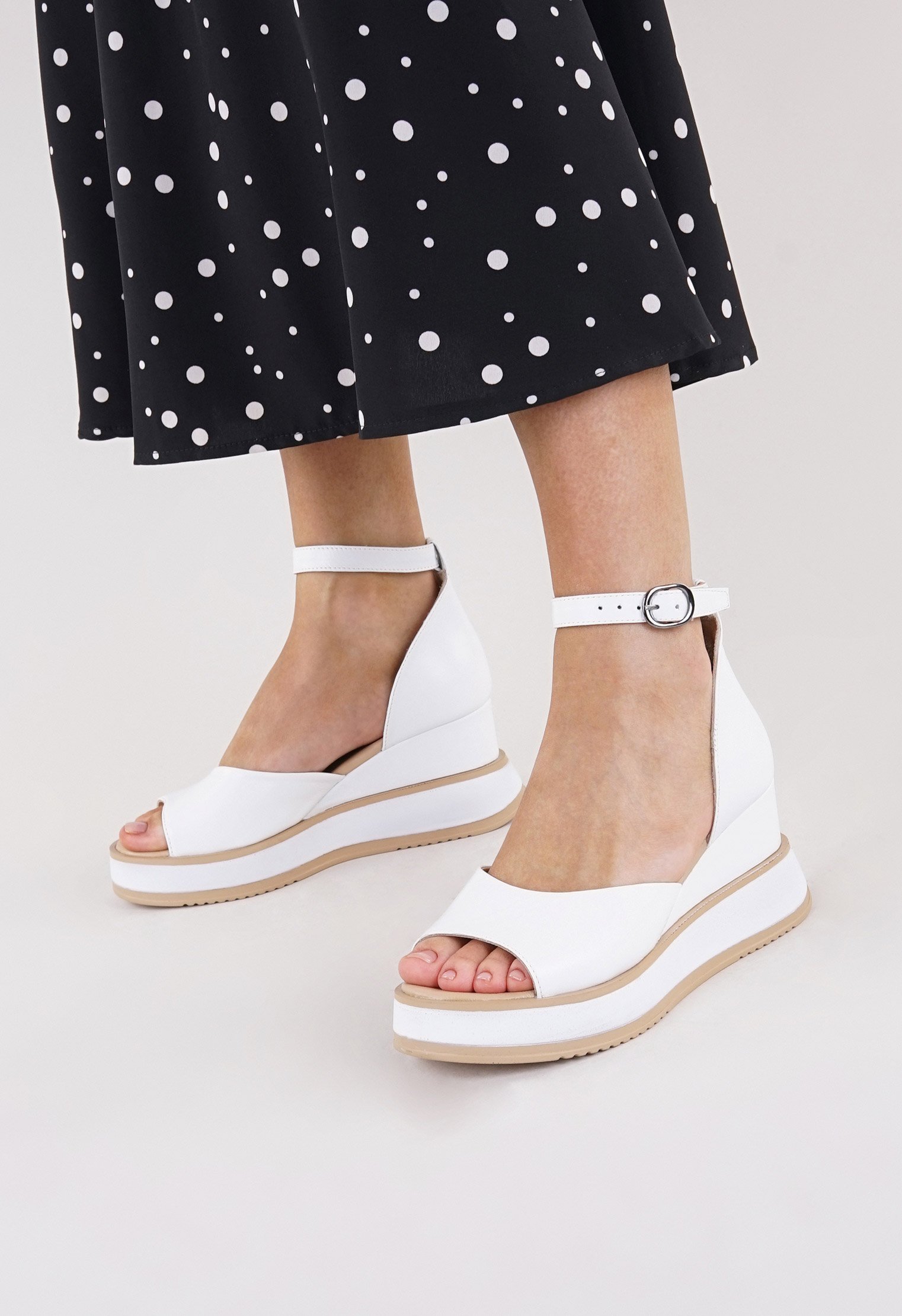 Обратите внимание: данная модель идёт в размер и отлично подходит для ног со средней и узкой полнотой и любым подъёмом стопы. Стильные босоножки из новой коллекции выполнены из натуральной кожи и представлены в белом цвете. Современный силуэт дополнен тонким ремешком с регулировкой длины и анатомической стелькой из кожи. Платформа из экологичного полимера позволяет равномерно распределить нагрузку во время ходьбы. Актуальная модель станет украшением летнего наряда.
