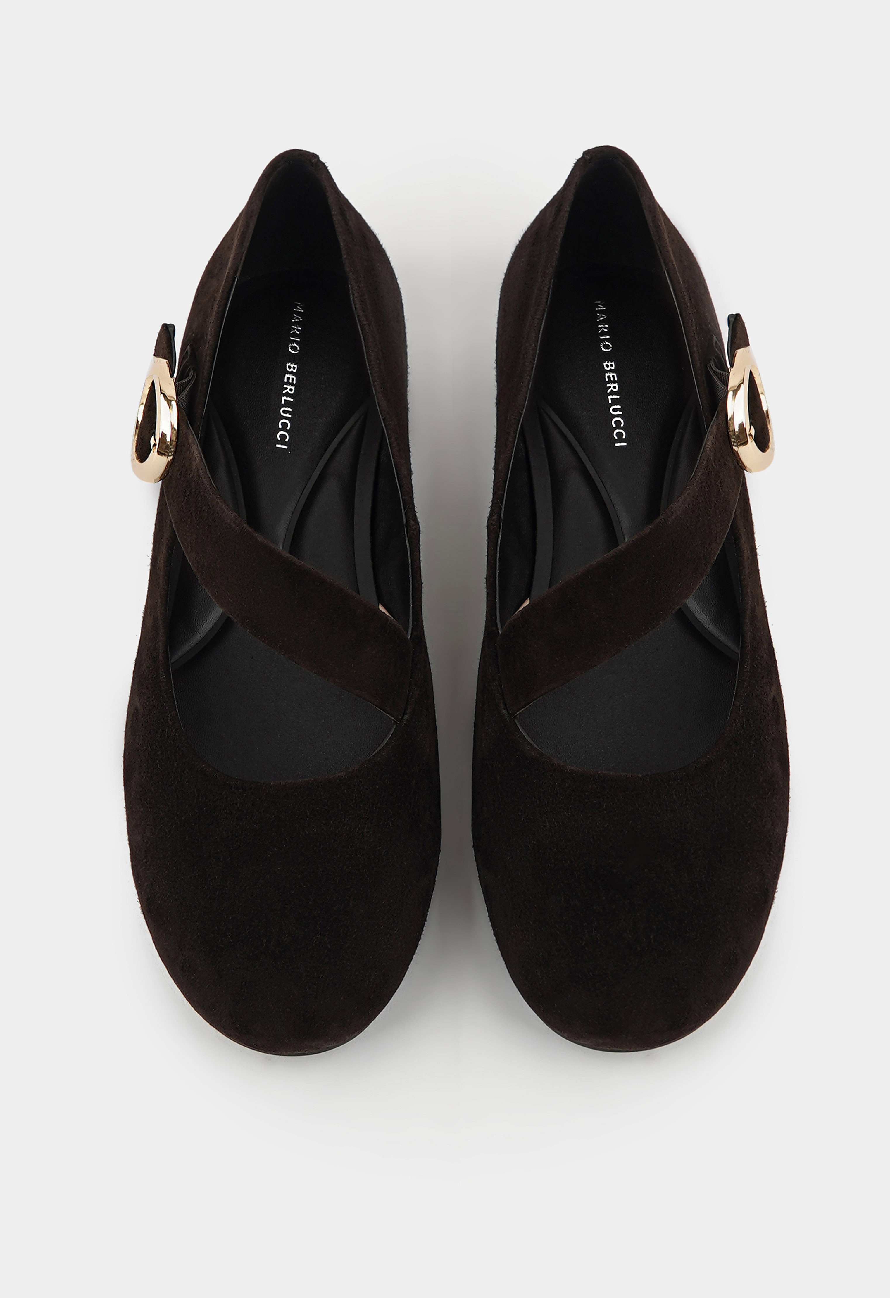 Коричневые балетки из натуральной замши – женственная пара с благородной бархатистой фактурой. Округлый мысок делает силуэт мягким и комфортным, а аккуратный венский каблук удобен для ежедневных дел. Ремешок с пряжкой и золотой фурнитурой работает как изящное украшение: красиво подчеркивает едва заметный подъем и делает модель более выразительной. Гибкая подошва приятно сгибается при ходьбе и поддерживает легкий шаг.