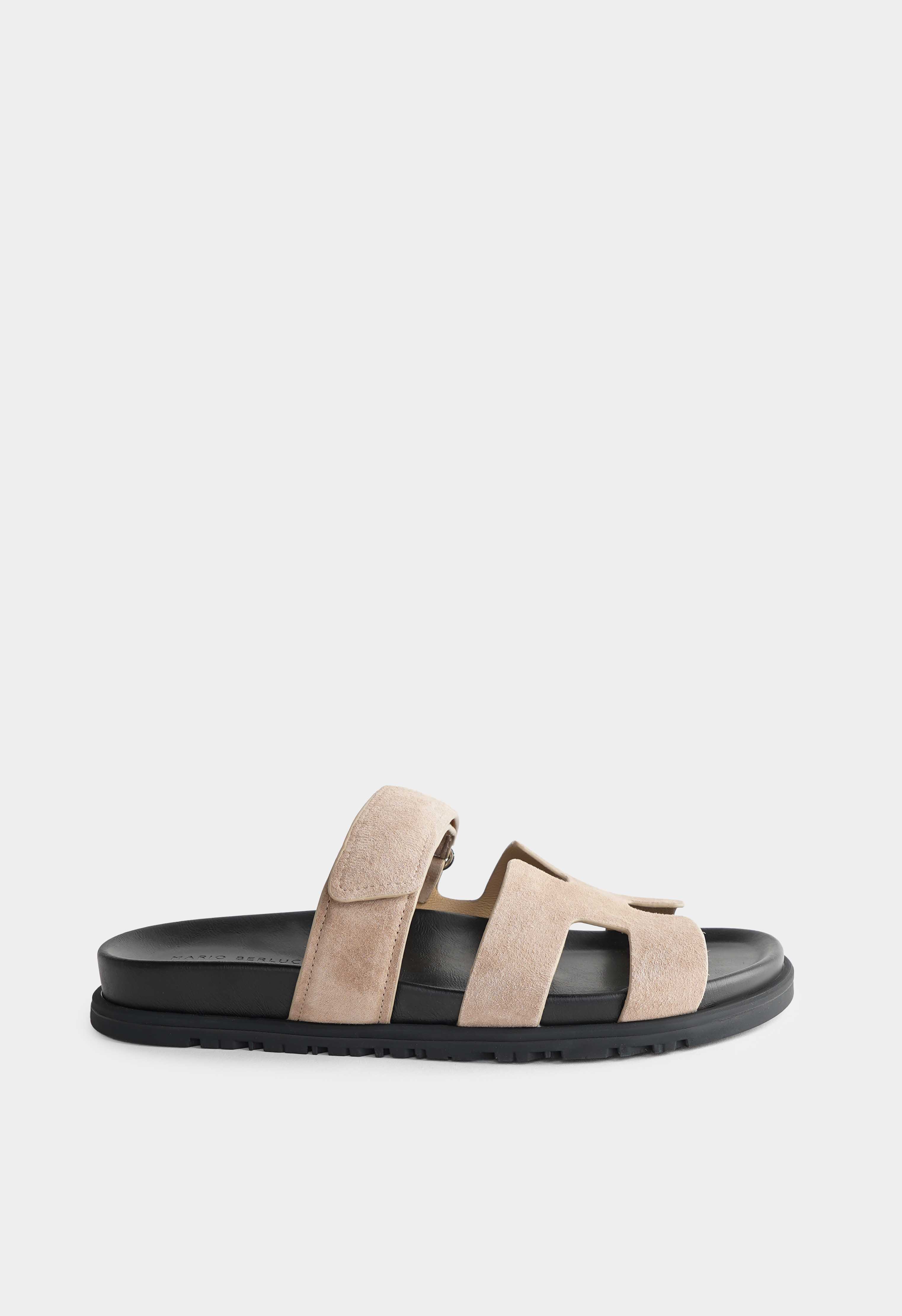 Стильные пантолеты в бежевом оттенке – идеальный выбор для комфорта и актуального повседневного образа. Модель выполнена из натуральной замши с мягкой текстурой. Открытый мысок добавляет легкости и делает пару отличным вариантом для летнего сезона, а удобная застежка на липучке с серебряной фурнитурой позволяет легко регулировать посадку. Платформа визуально вытягивает силуэт и обеспечивает дополнительную поддержку, в то время как гибкая черная подошва дарит свободу движения и комфорт в течение всего дня.