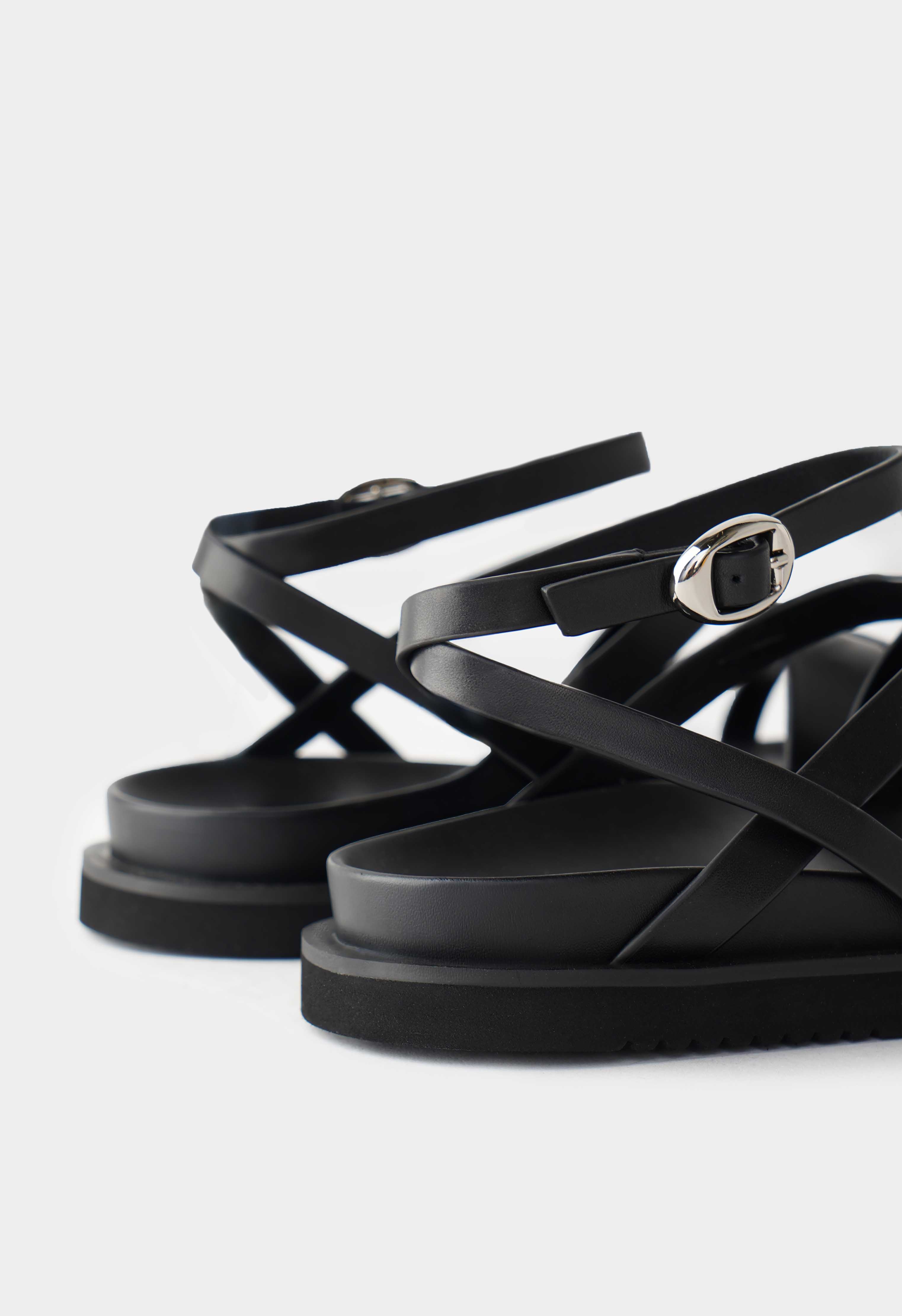 Черные сандалии из натуральной кожи – пара с выразительными ремешками, которая делает летний образ аккуратным и собранным. Открытый мысок добавляет легкости, а переплетение кожаных ремешков красиво фиксирует стопу и смотрится особенно эффектно на контрастной подошве. Серебряная фурнитура и пряжка на ремешке дают сдержанный акцент и позволяют точно отрегулировать посадку. Платформа визуально вытягивает силуэт и добавляет рост, жесткая подошва держит форму и обеспечивает стабильную опору.