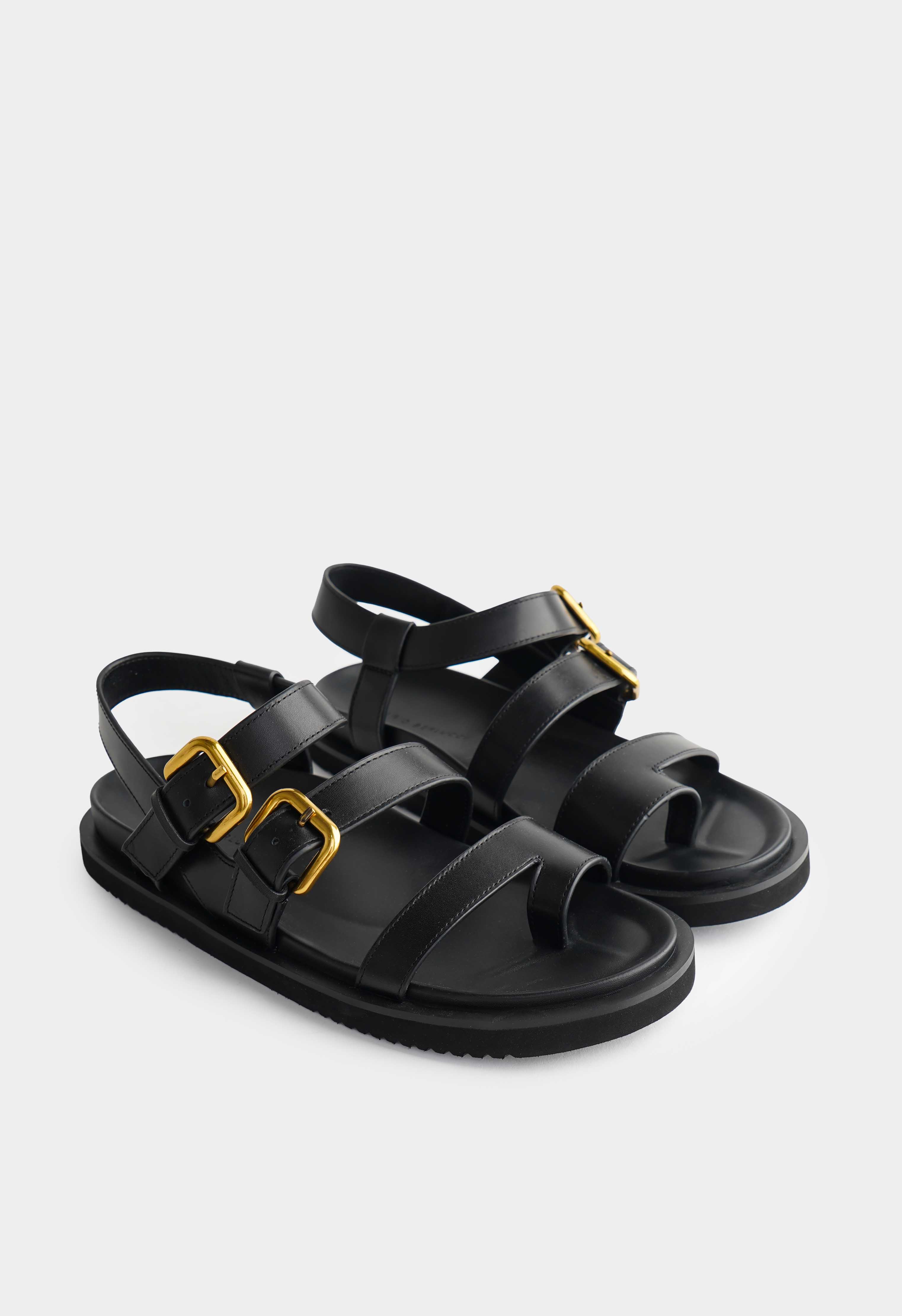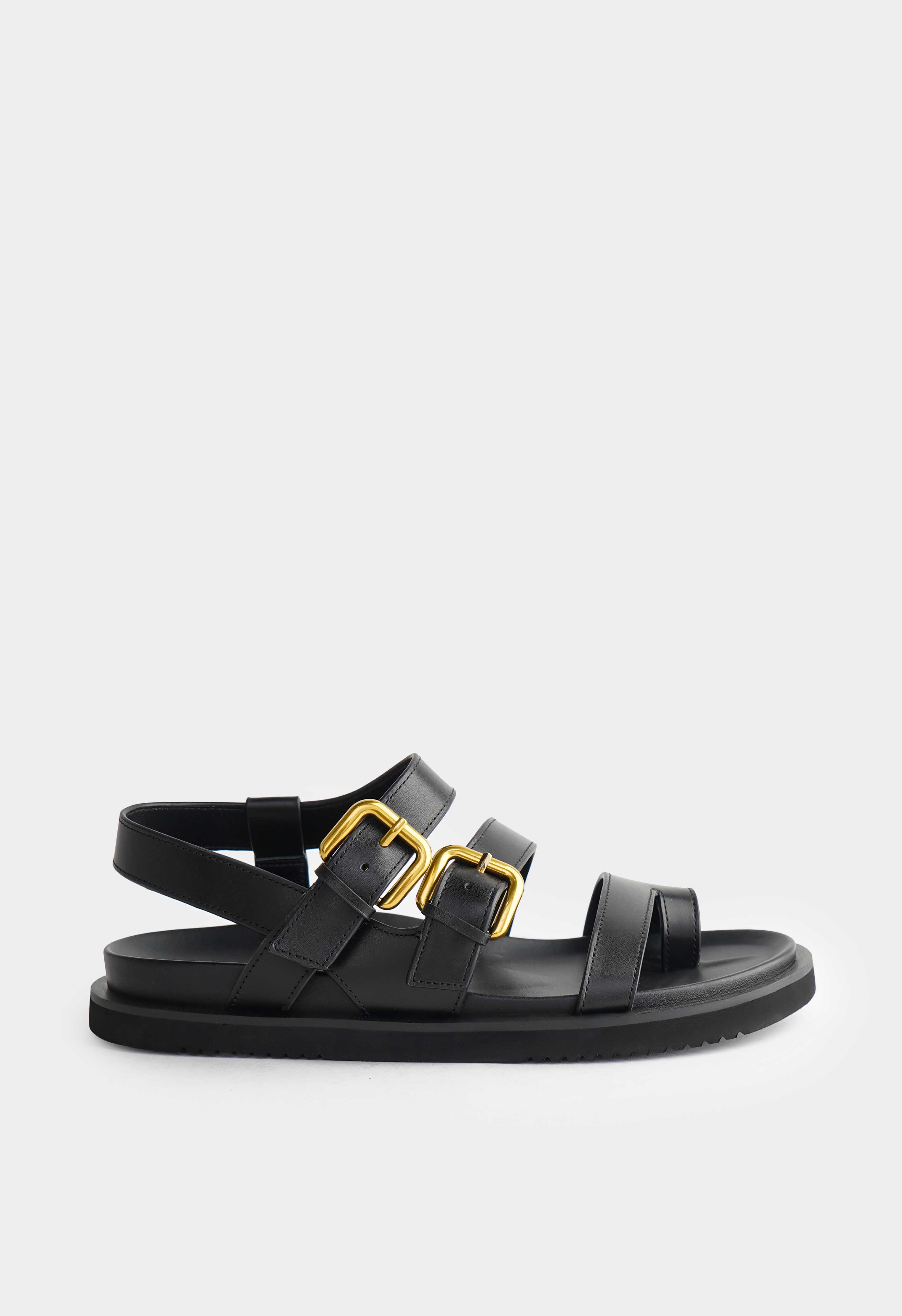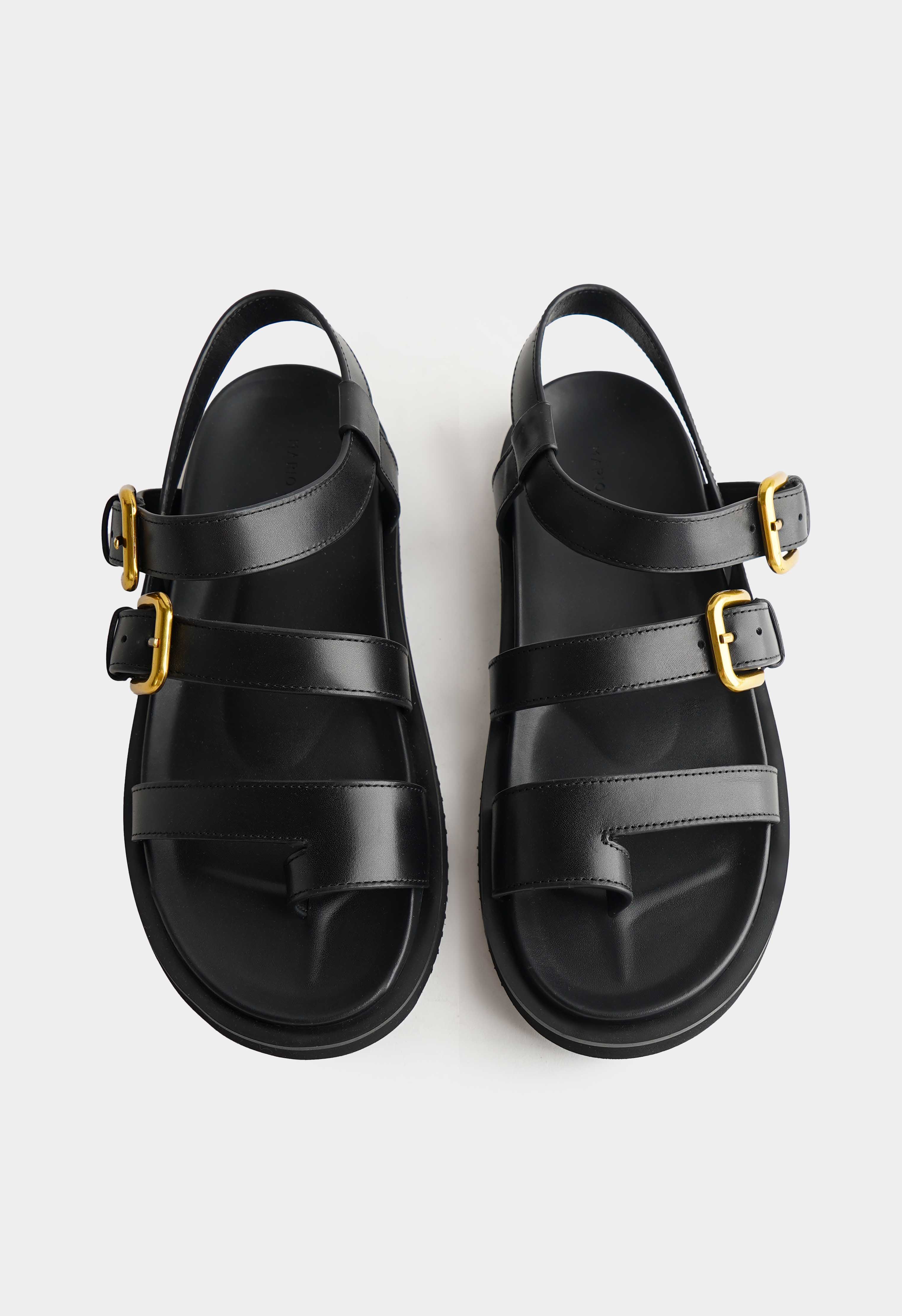 Черные сандалии из натуральной кожи – выразительное сочетание практичности и трендового дизайна: открытый мысок добавляет легкости, а массивная платформа делает силуэт современным и уверенным. Золотые пряжки становятся ярким акцентом и позволяют удобно отрегулировать посадку, подчеркивая стиль каждой детали. Жесткая подошва обеспечивает устойчивость и надежность, делая эту модель идеальной для динамичных городских образов.