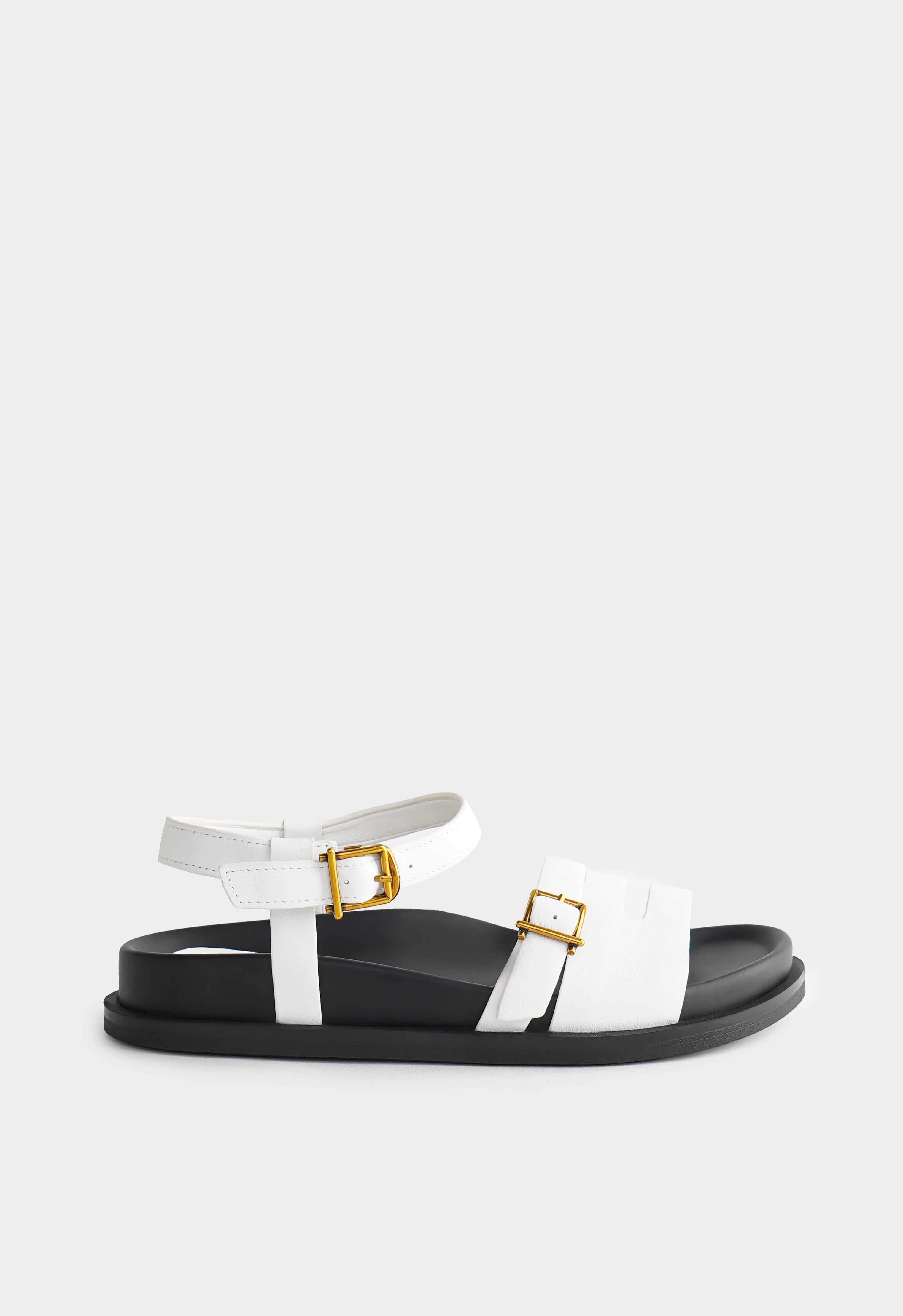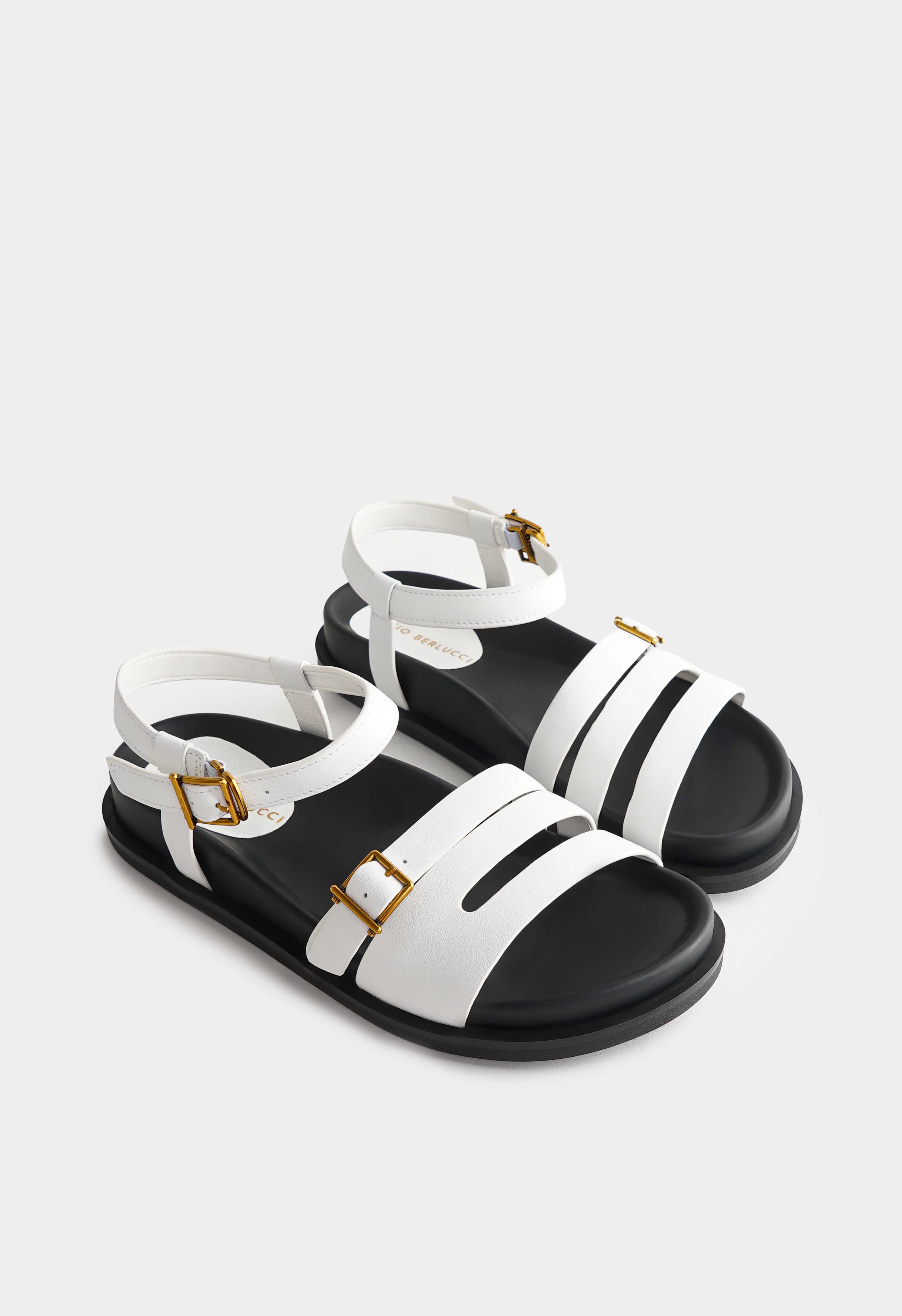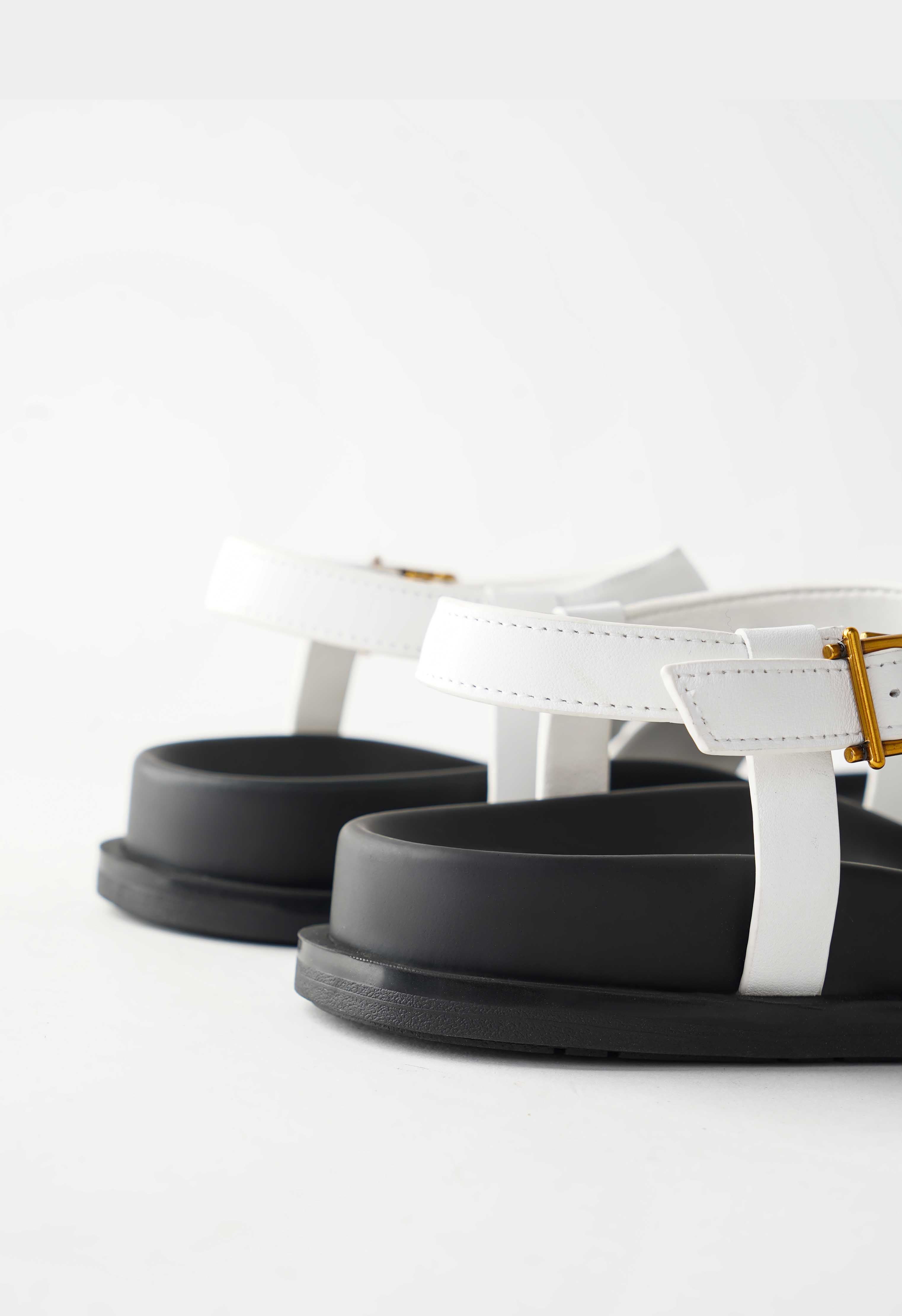 Базовые белые сандалии из натуральной кожи – идеальное сочетание минимализма и выразительных деталей. Открытый мысок добавляет легкости образу, а золотые пряжки создают эффектный акцент и подчеркивают премиальность модели. Удобная контрастная черная платформа визуально вытягивает силуэт и обеспечивает комфорт на каждый день, в то время как гибкая подошва дарит свободу движений и мягкость шага.