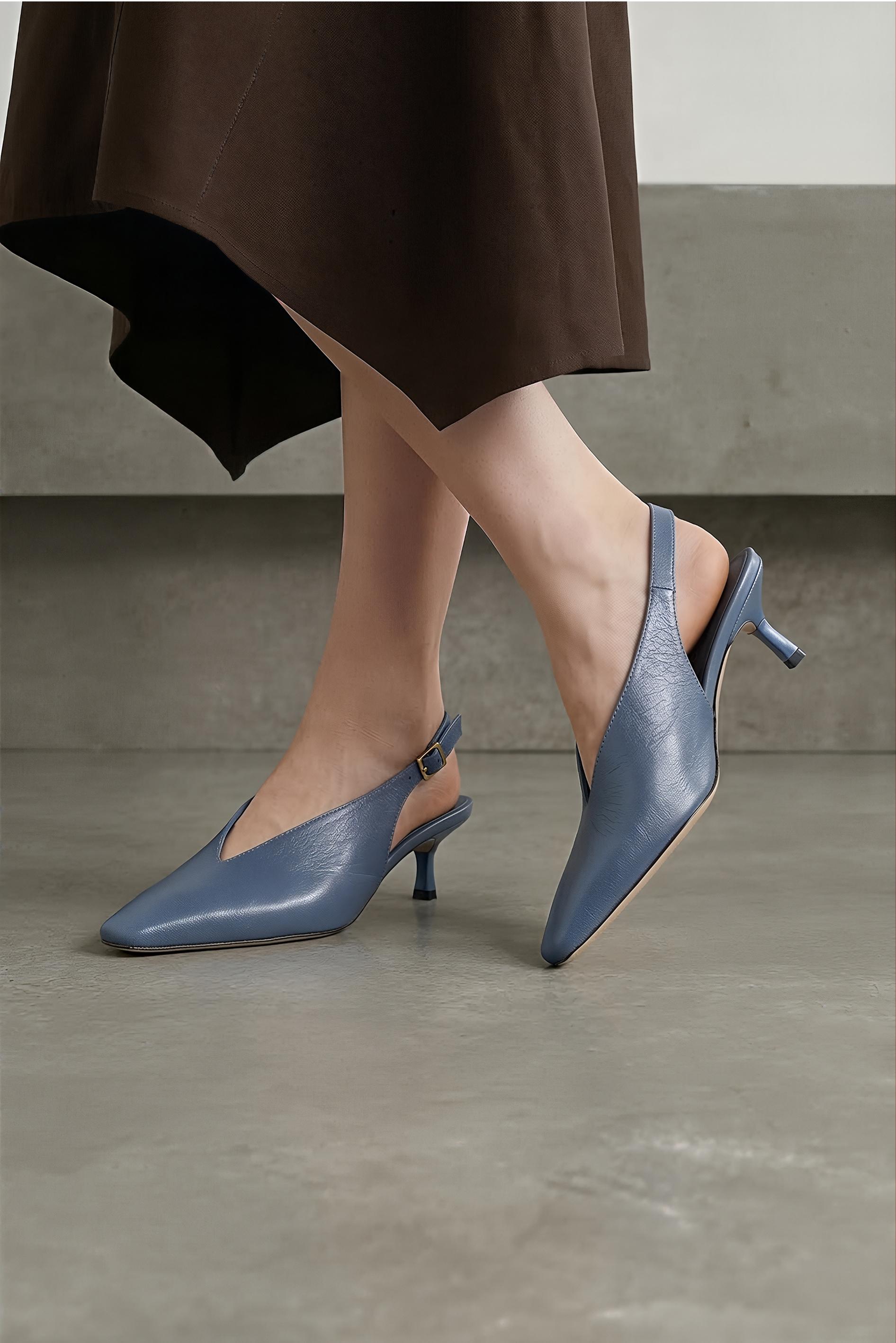 Туфли в синем оттенке из натуральной кожи выглядят элегантно и очень аккуратно благодаря силуэту и открытому заднику. Квадратный мысок добавляет современную геометрию и подчеркивает ухоженный вид, а тонкая шпилька делает линию ноги более изящной. Ремешок с золотой пряжкой красиво фиксирует пятку и добавляет акцент, который смотрится дорого, в то время как гибкая подошва поддерживает комфортный шаг.