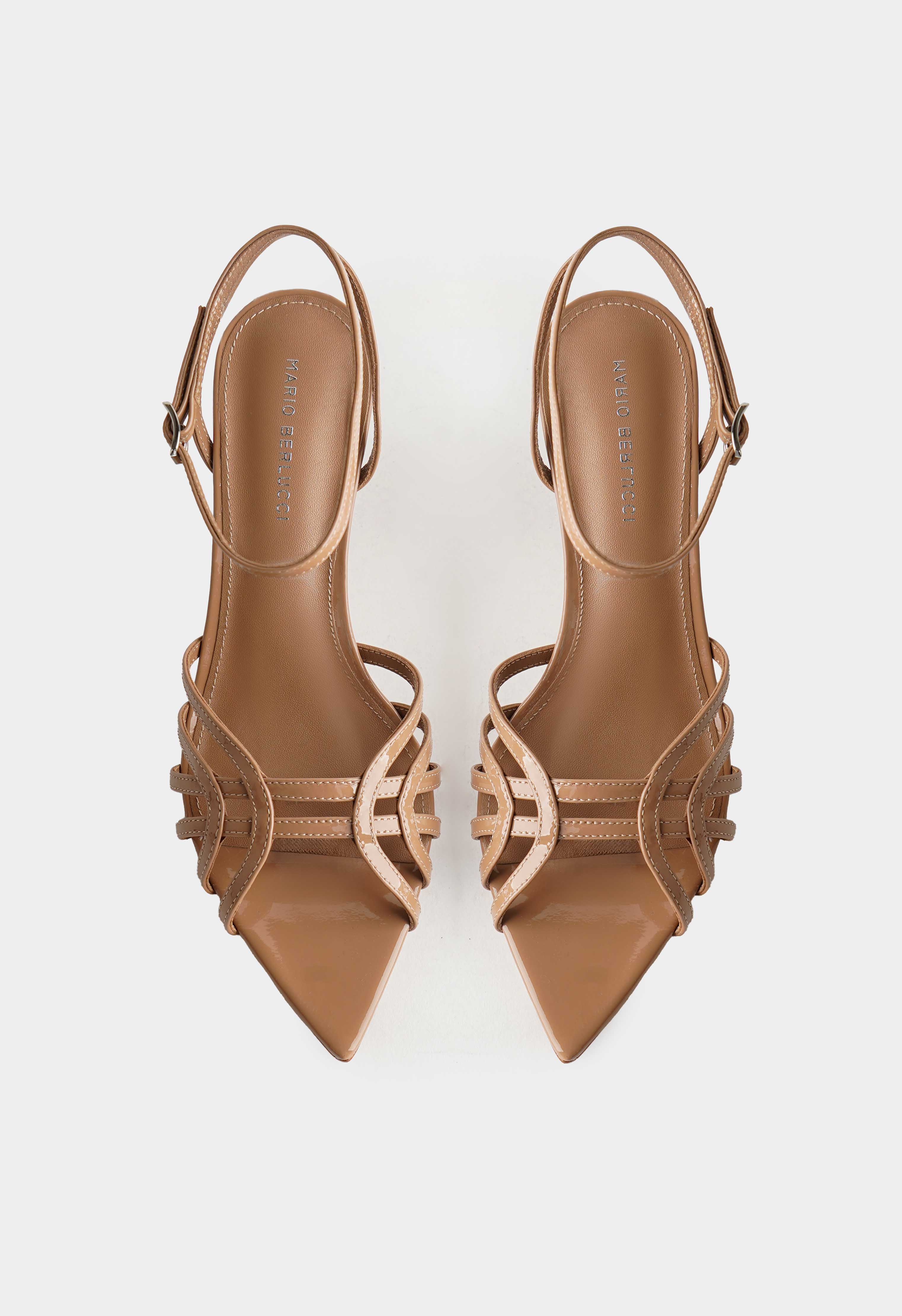 Бежевые босоножки из натуральной лаковой кожи выглядят очень эффектно за счет зеркального блеска и изящного переплетения ремешков. Открытый мысок добавляет легкости, а тонкая шпилька делает ноги визуально длиннее и придает образу уверенную женственность. Регулируемая пряжка фиксирует посадку, металлик-фурнитура добавляет аккуратный акцент и подчеркивает женственные линии. Жесткая подошва сохраняет форму и обеспечивает стабильный шаг – отличная пара для коктейльных образов, вечеринок и торжественных выходов.