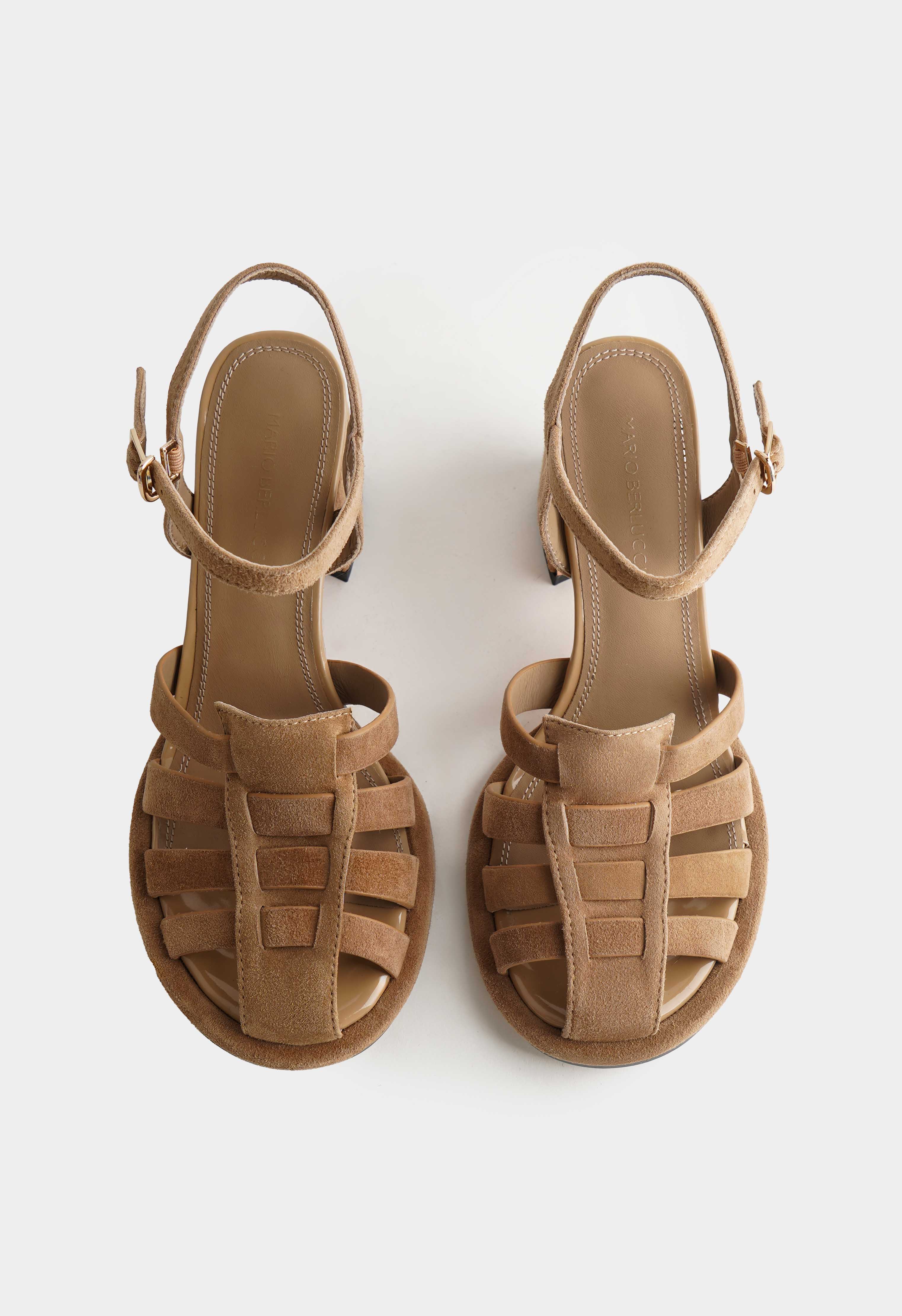Эти бежевые босоножки из натуральной замши сочетают элегантность и комфорт: округлый мысок обеспечивает удобную посадку, а трапециевидный каблук – устойчивую и грациозную походку. Золотая пряжка добавляет изысканный акцент, в то время как жесткая подошва гарантирует надежность на каждом шаге, делая их идеальным выбором для выходов и вечерних прогулок.