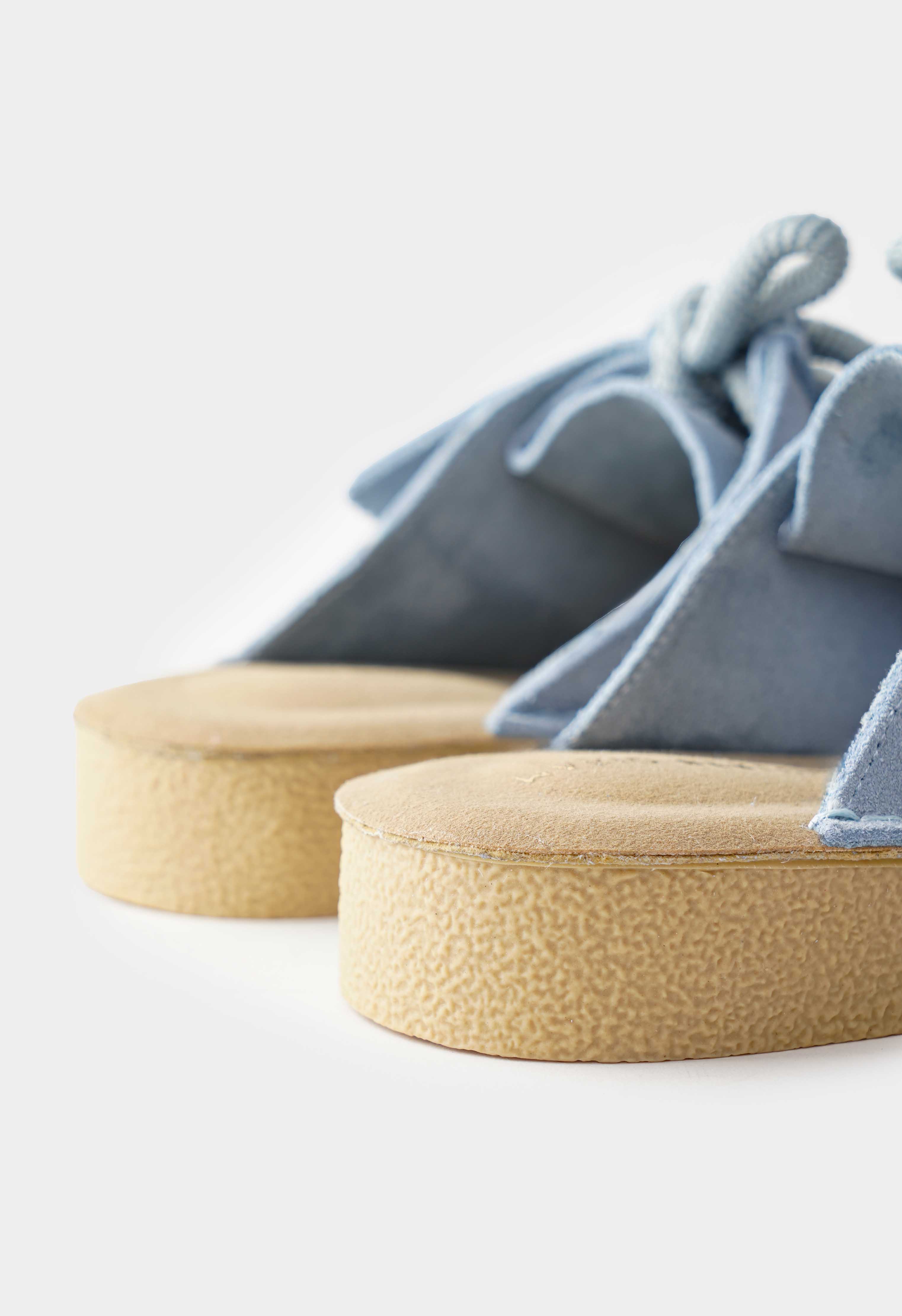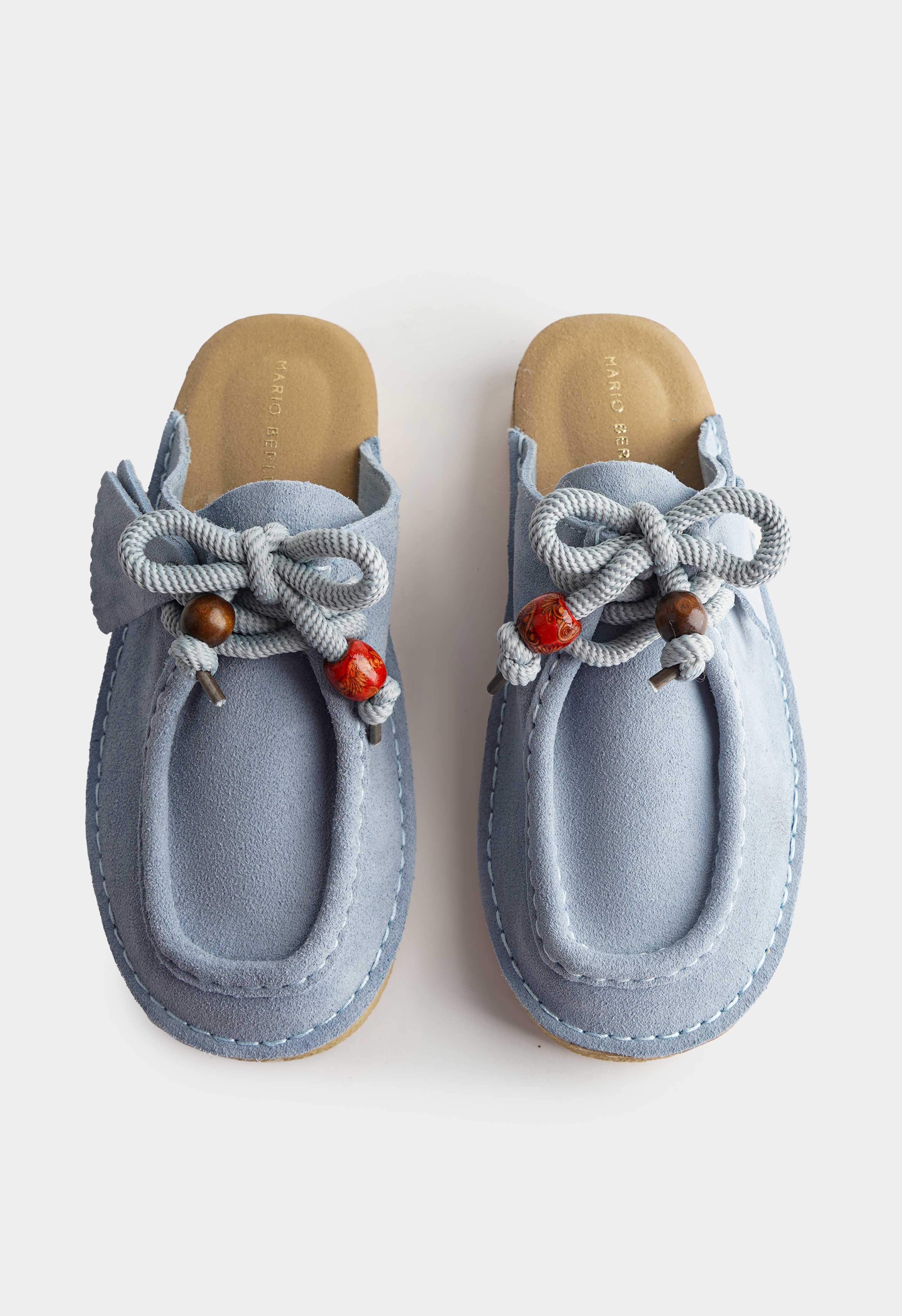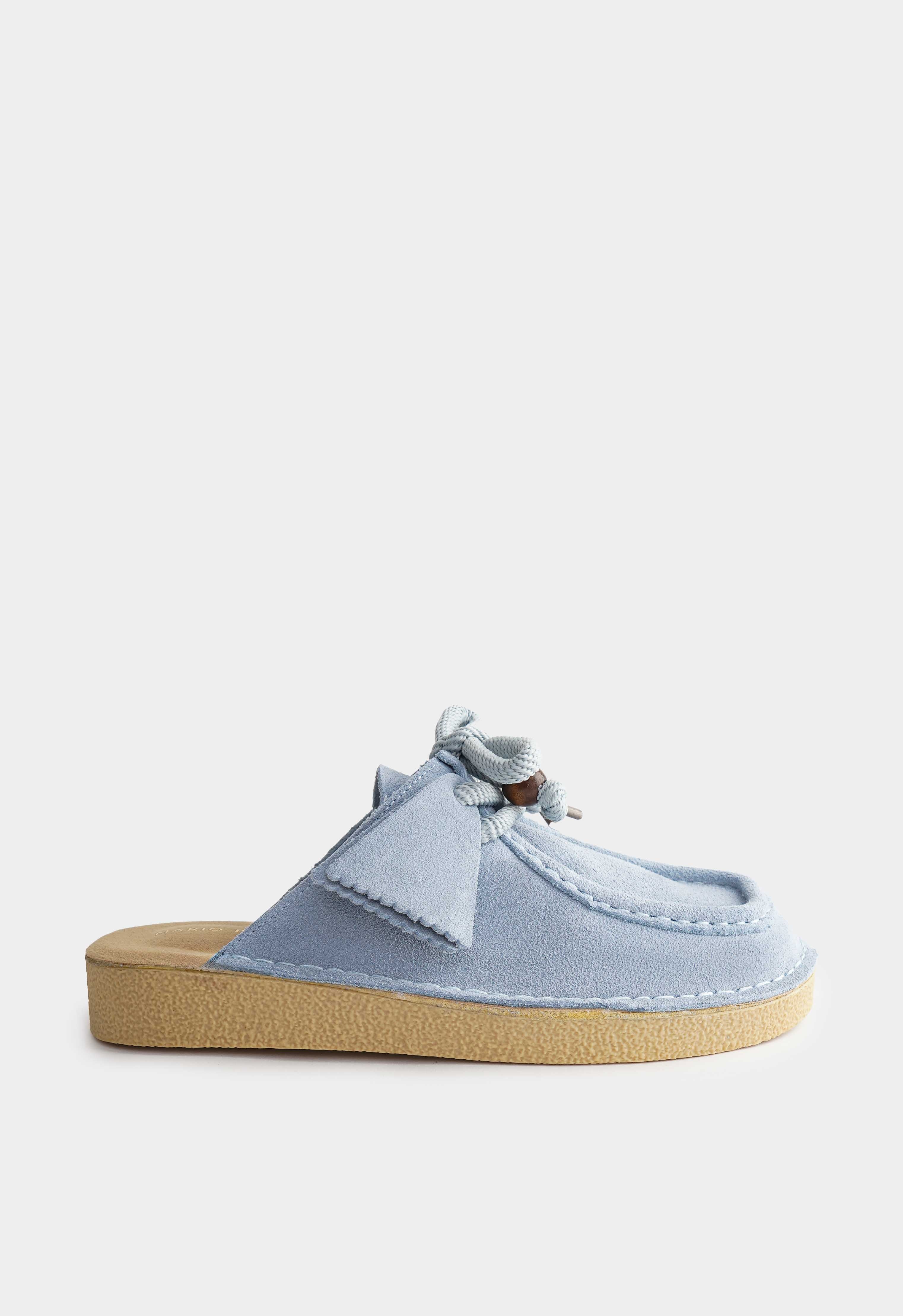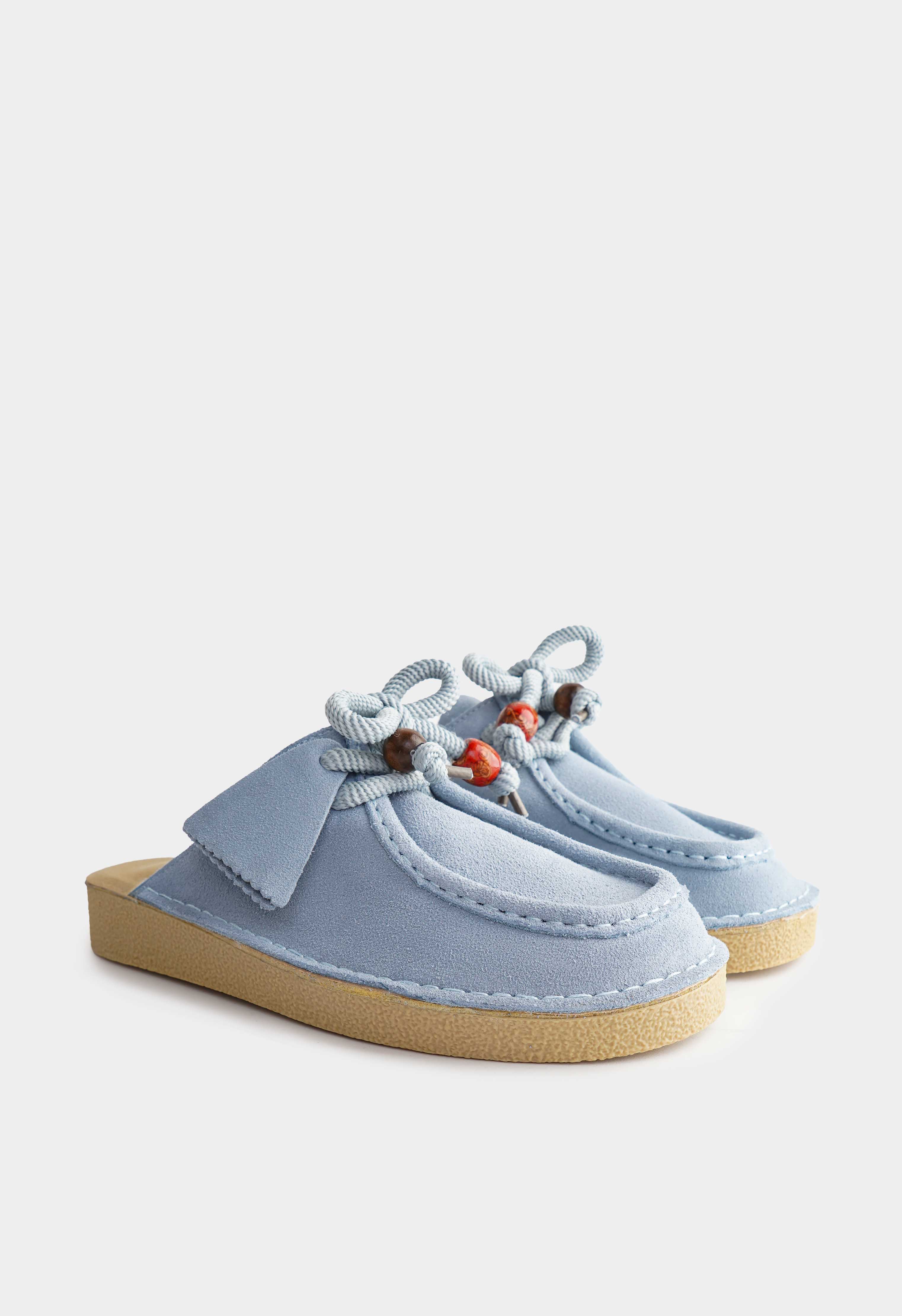 Голубые пантолеты из натуральной замши – уютная пара с мягким пастельным оттенком и выразительными деталями. Бархатистая замша смотрится нежно и аккуратно, округлый мысок создает комфортный мягкий силуэт. Декоративная шнуровка с объемным узлом и яркими бусинами добавляет игривый акцент и делает модель заметной даже в простом образе. Платформа приподнимает и визуально вытягивает силуэт, а жесткая подошва держит форму и дает стабильную опору.