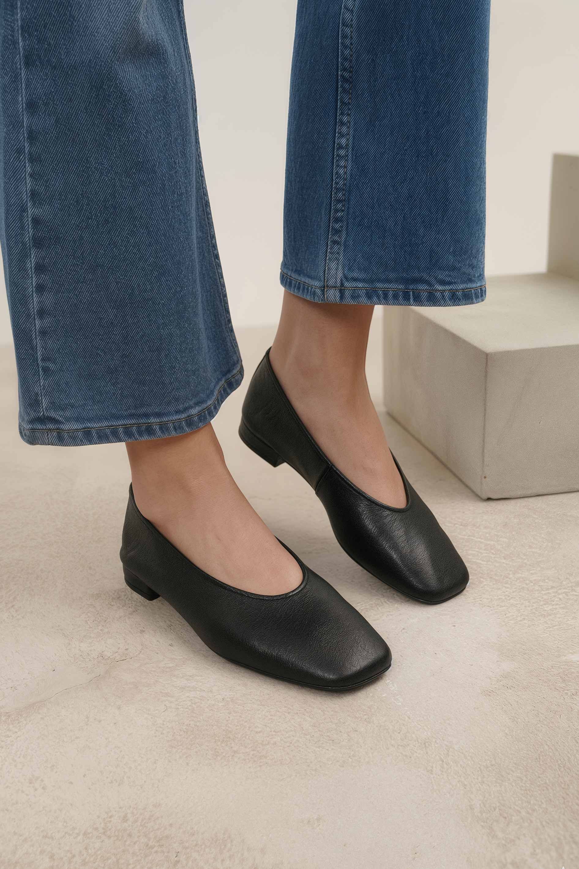Минималистичные черные балетки из натуральной кожи – универсальная пара, которая выглядит аккуратно и дорого в любом гардеробе. Квадратный мысок делает силуэт более собранным, а гладкая кожа красиво смотрится и легко сочетается с брюками, джинсами, юбками и платьями. Лаконичный дизайн без лишнего декора подчеркивает стиль и уместен и в офисе, и на прогулке. Гибкая подошва мягко сгибается при шаге и дарит комфорт на весь день.