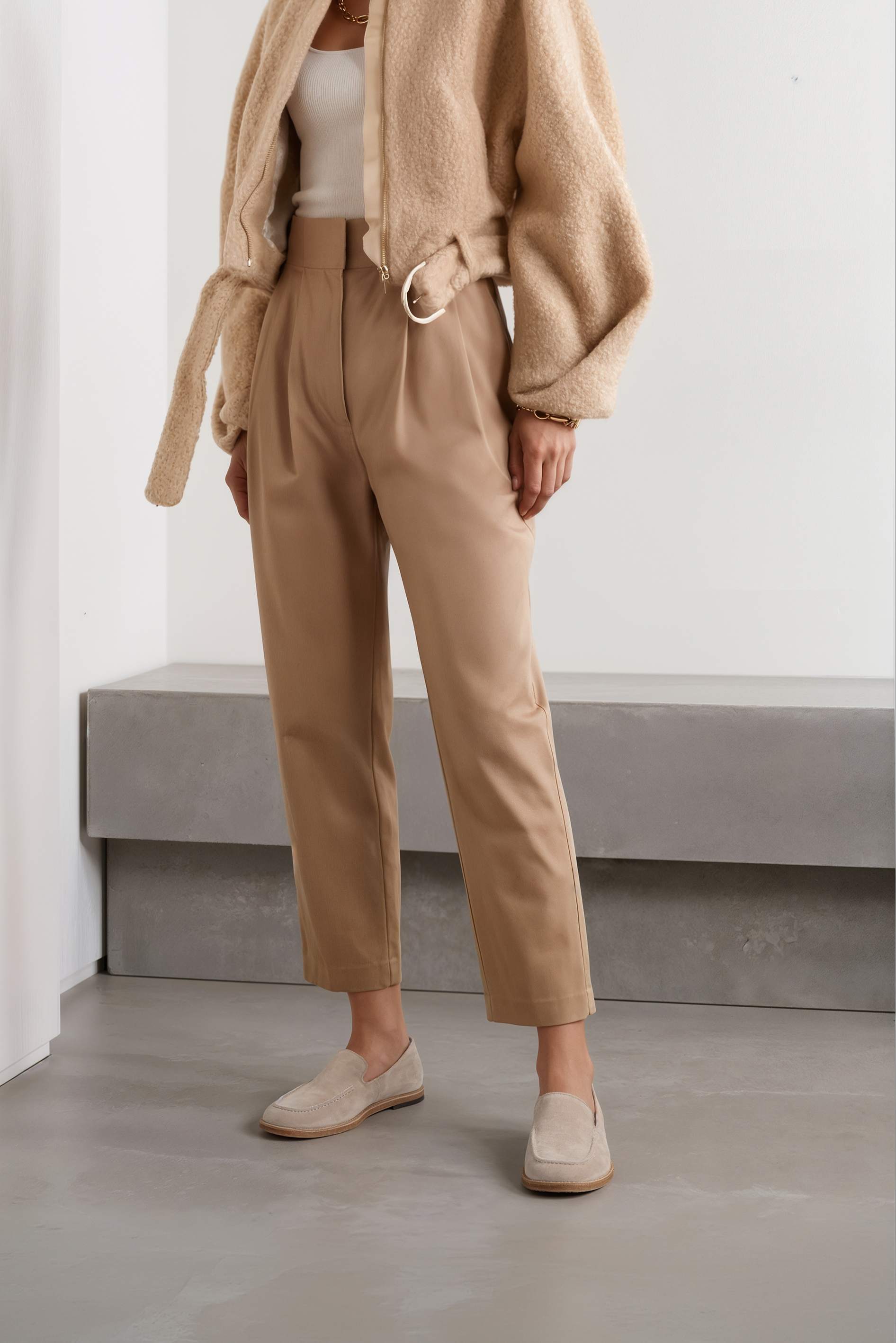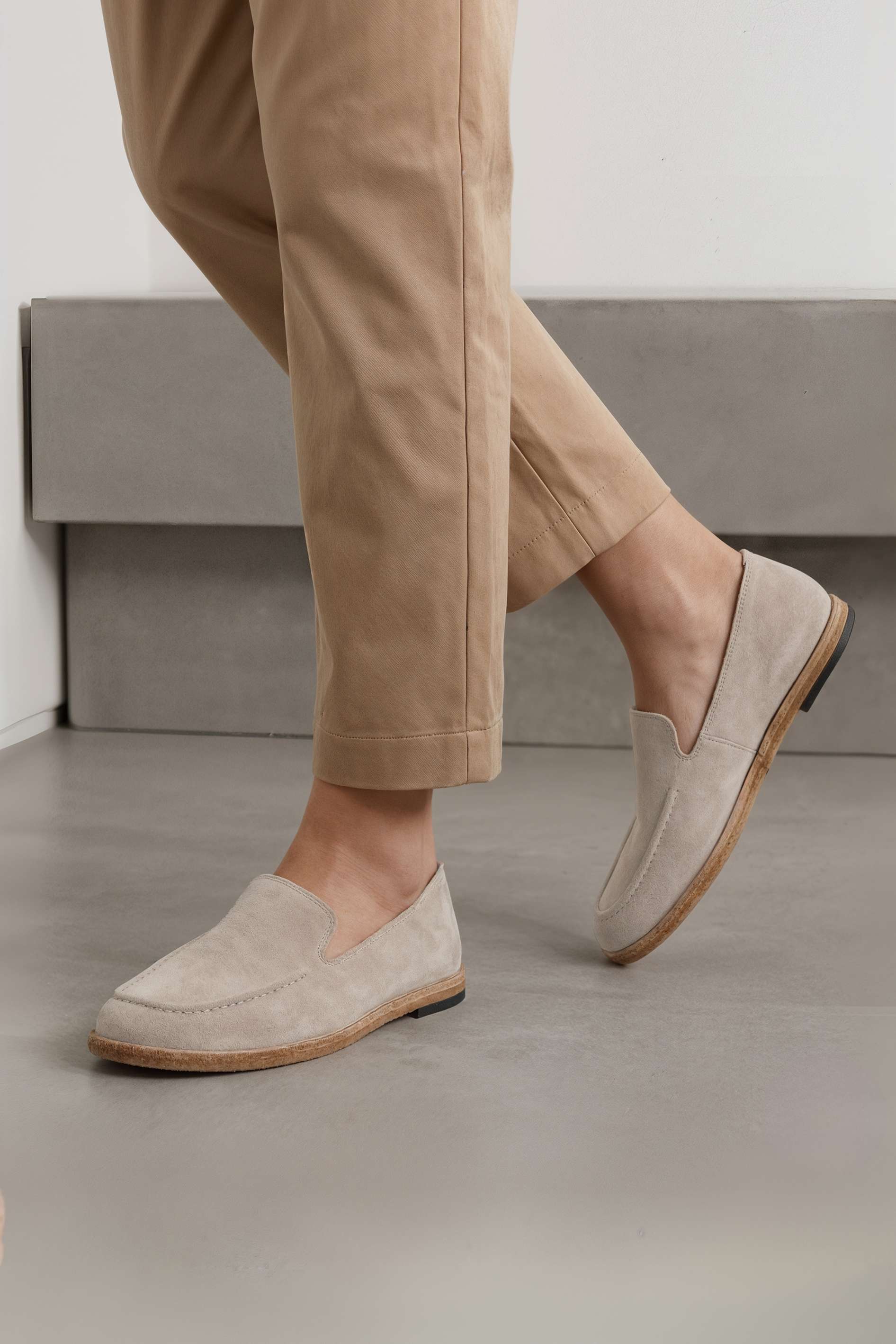 Бежевые лоферы из натуральной замши – спокойная, благородная пара с аккуратным дизайном и уютной фактурой. Бархатистая замша выглядит аккуратно и дорого, а квадратный мысок добавляет современную геометрию и делает силуэт более собранным. Невысокий венский каблук удобен для активного дня и сохраняет элегантный вид без лишней высоты. Жесткая подошва держит форму и даёт стабильную опору – отличный вариант для офиса, прогулок и образов в светлой базовой палитре.