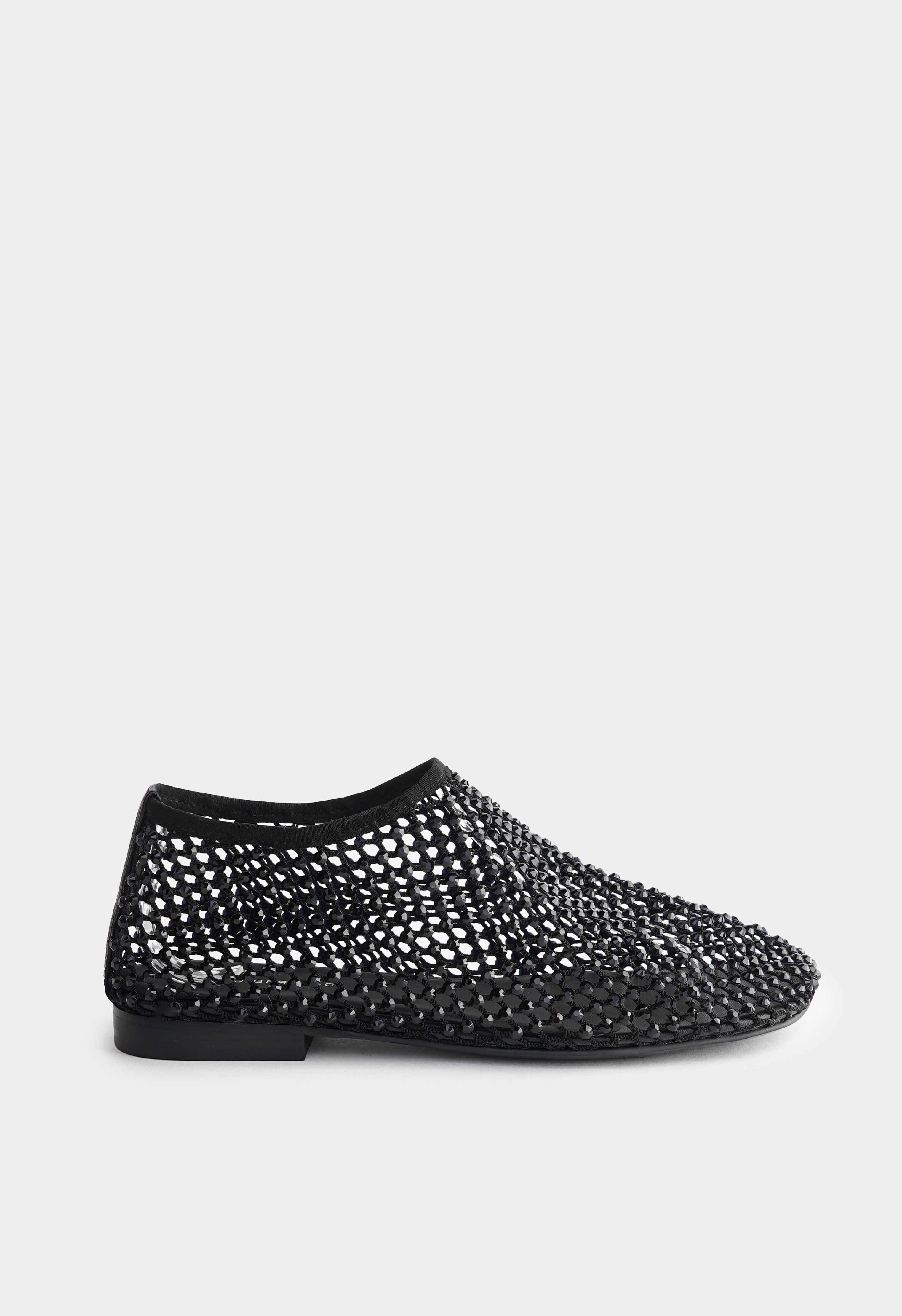Черные балетки с эффектной сетчатой фактурой – пара, которая выглядит легкой, но сразу притягивает взгляд благодаря сиянию черных страз. Текстильный верх создаёт воздушный силуэт, квадратный мысок добавляет современную геометрию и делает образ более собранным. Стразы красиво мерцают при движении и превращают балетки в заметный акцент даже в простом комплекте. Жесткая подошва держит форму и обеспечивает стабильную опору.