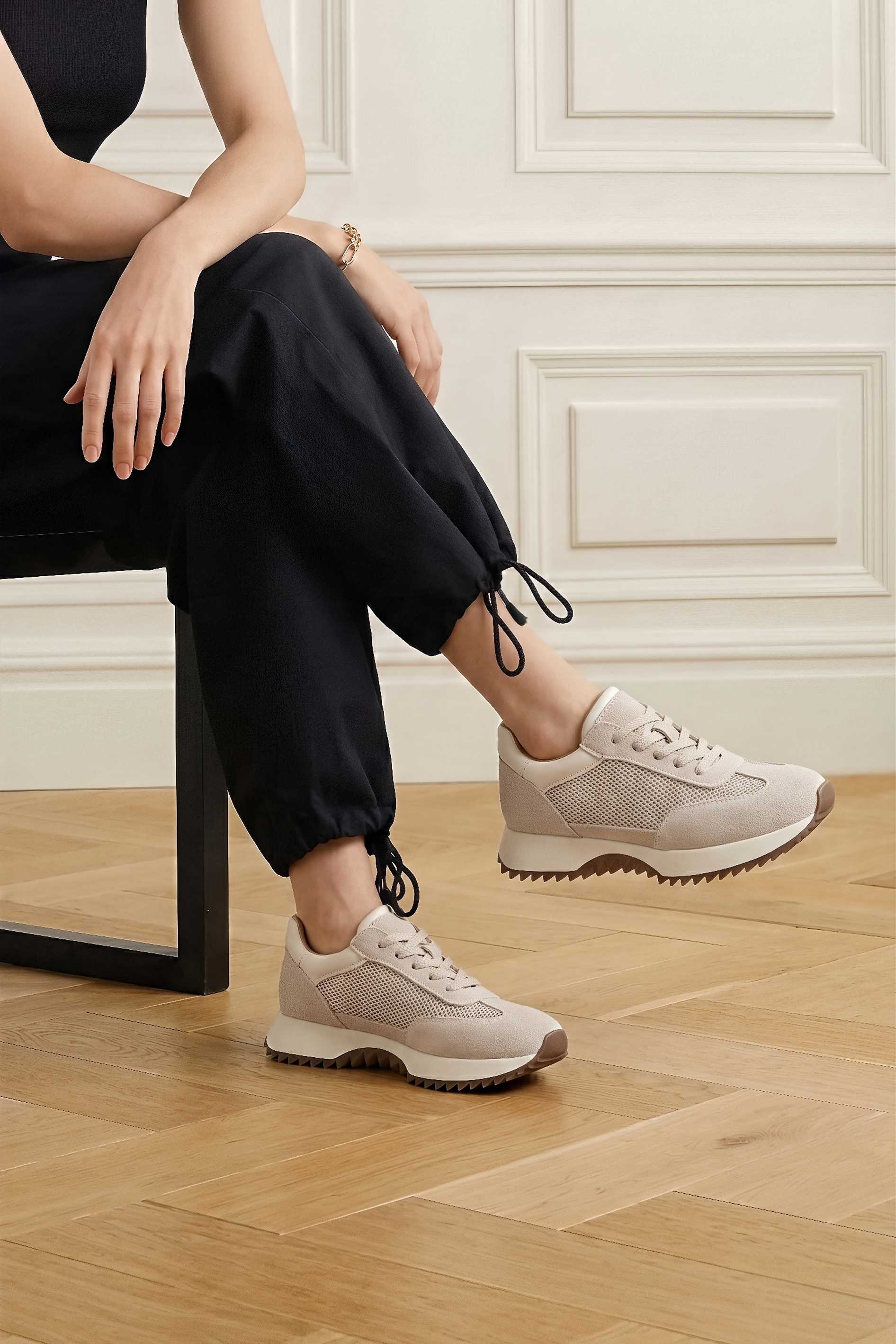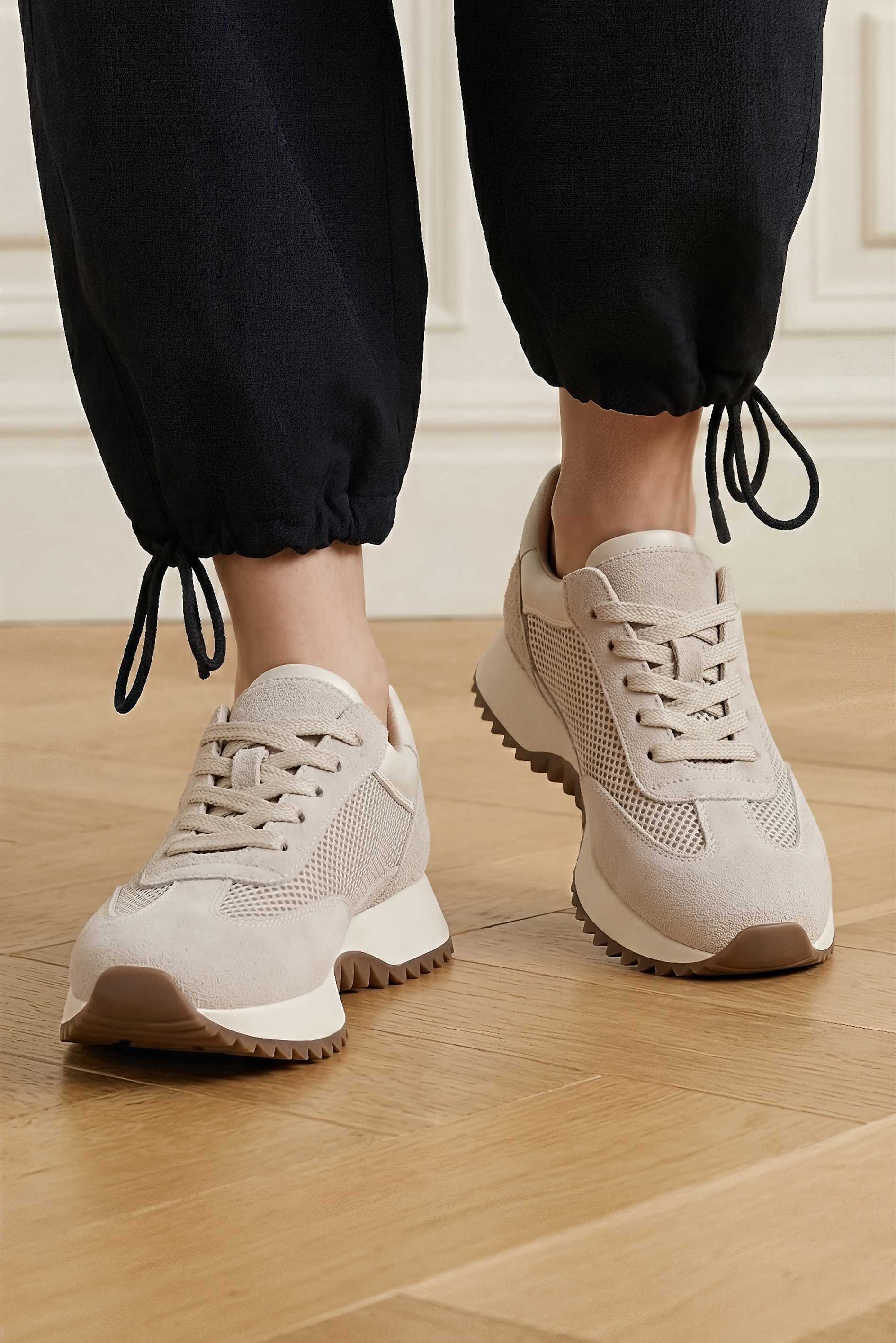 Бежевые кроссовки из натуральной замши выглядят аккуратно благодаря бархатистой фактуре и светлым оттенкам. Округлый мысок обеспечивает комфортную посадку и универсальный силуэт, который легко сочетается с повседневным гардеробом. Шнуровка в тон подчеркивает чистые линии модели и позволяет точно отрегулировать фиксацию по стопе. Выраженная платформа добавляет рост и делает образ современнее, а жесткая подошва с рельефным протектором дает стабильную опору и уверенный шаг в городском ритме.