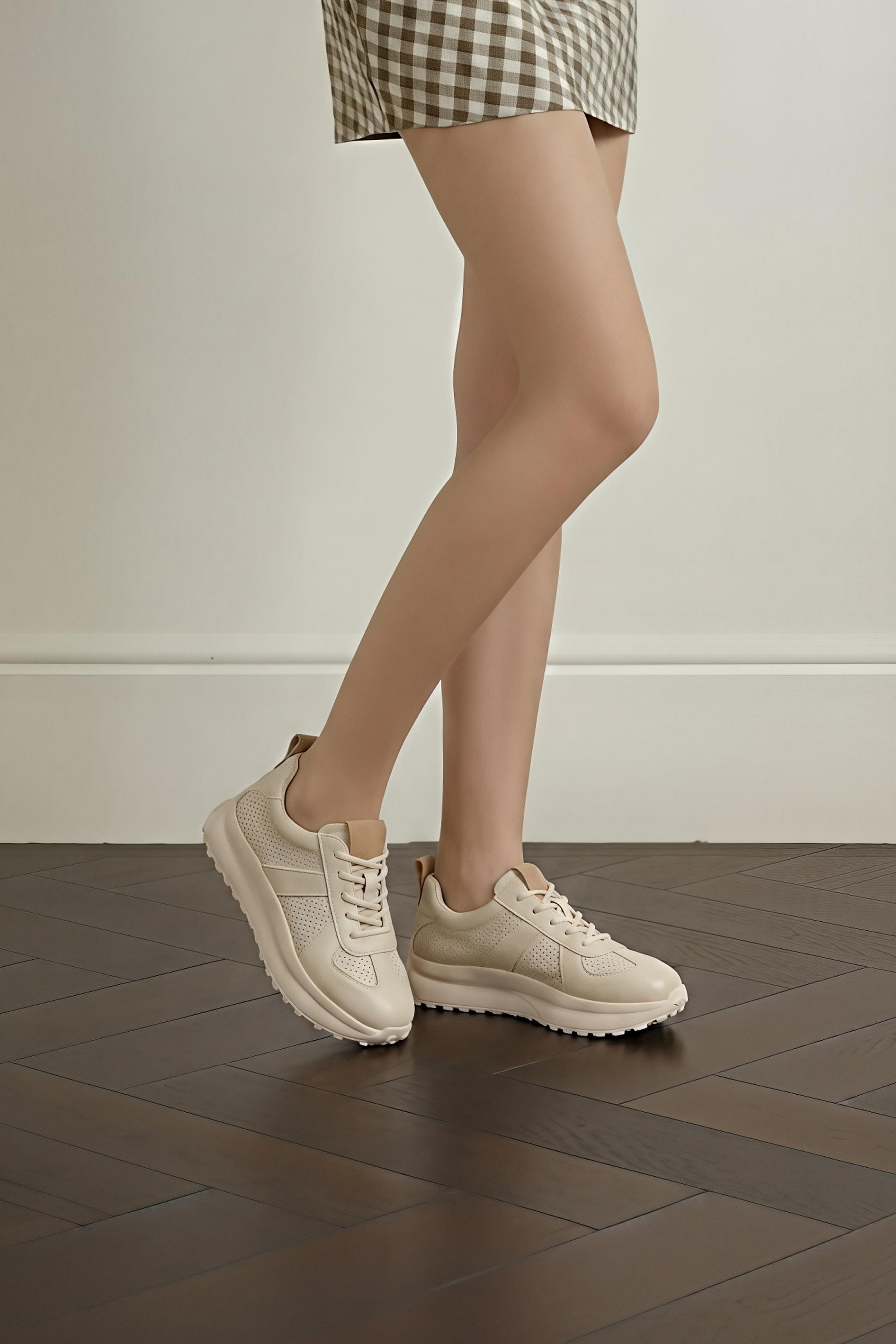 Бежевые кроссовки из натуральной кожи – идеальная база для гардероба, которая выглядит свежо, дорого и подходит почти ко всему. Аккуратная перфорация добавляет легкости и делает модель комфортной в течение дня, а округлый мысок обеспечивает удобную посадку без давления. Классическая шнуровка помогает точно подогнать кроссовки по стопе и дает надежную фиксацию. Выраженная платформа визуально вытягивает силуэт, добавляет рост и делает образ более современным. Гибкая подошва мягко пружинит при ходьбе и поддерживает легкий шаг.