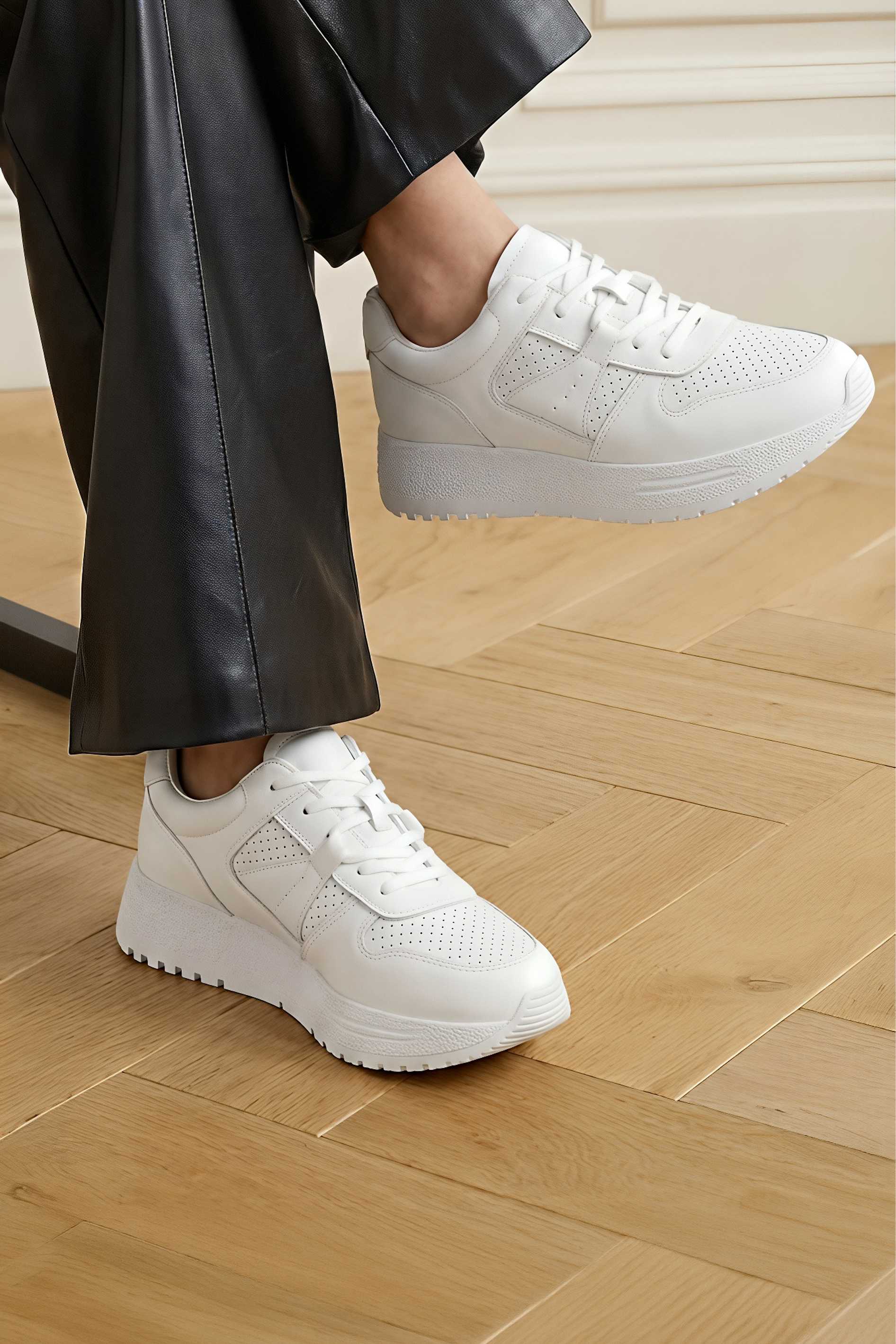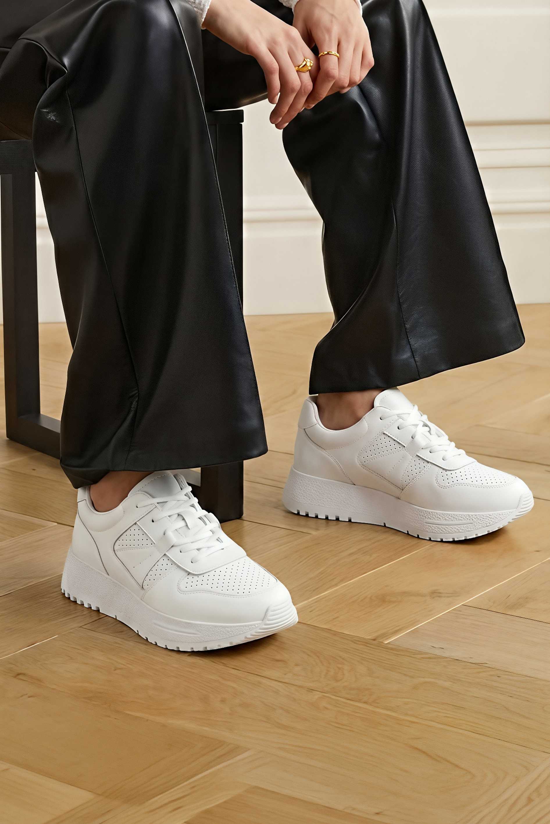 Базовые белые кроссовки из натуральной кожи – аккуратная, универсальная пара с выразительным силуэтом и современным настроением. Гладкий кожаный верх с перфорацией выглядит свежо и помогает сохранить комфорт в течение дня, а округлый мысок обеспечивает удобную посадку без лишнего давления. Классическая шнуровка надежно фиксирует стопу и подчеркивает лаконичный дизайн. Платформа добавляет рост и визуально вытягивает силуэт, делая образ более собранным. Жесткая подошва дает стабильную опору и уверенный шаг.