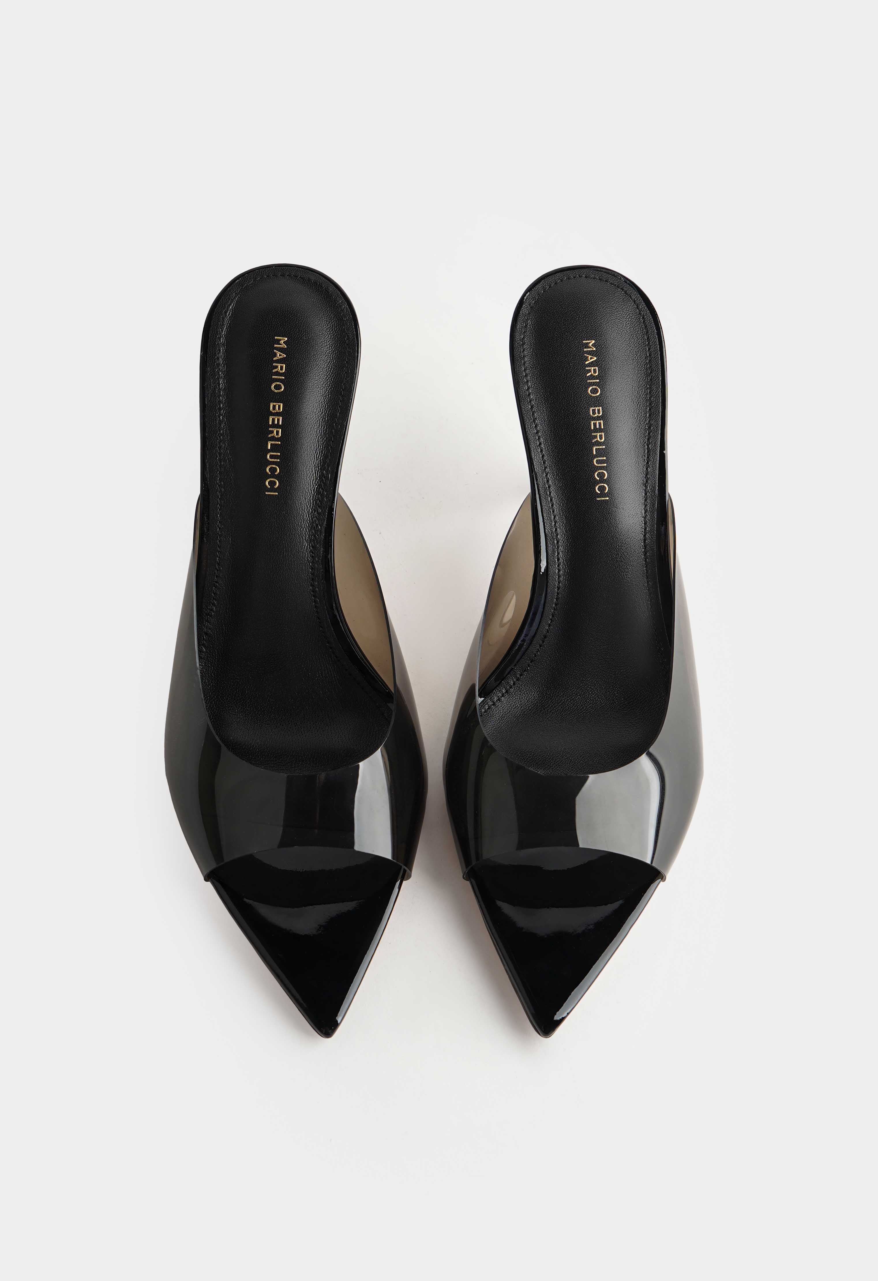 Черные мюли из плексигласа и натуральной кожи выглядят легко и очень эффектно за счет полупрозрачного верха и чистого оттенка. Открытый мысок добавляет летнего настроения и красиво подчеркивает педикюр, а гладкая кожаная отделка делает силуэт аккуратным. Тонкая шпилька придает изящную высоту и визуально вытягивает ноги, сохраняя легкость образа. Жесткая подошва держит форму и обеспечивает стабильную опору – идеальная пара для мероприятий, вечера и стильных выходов.