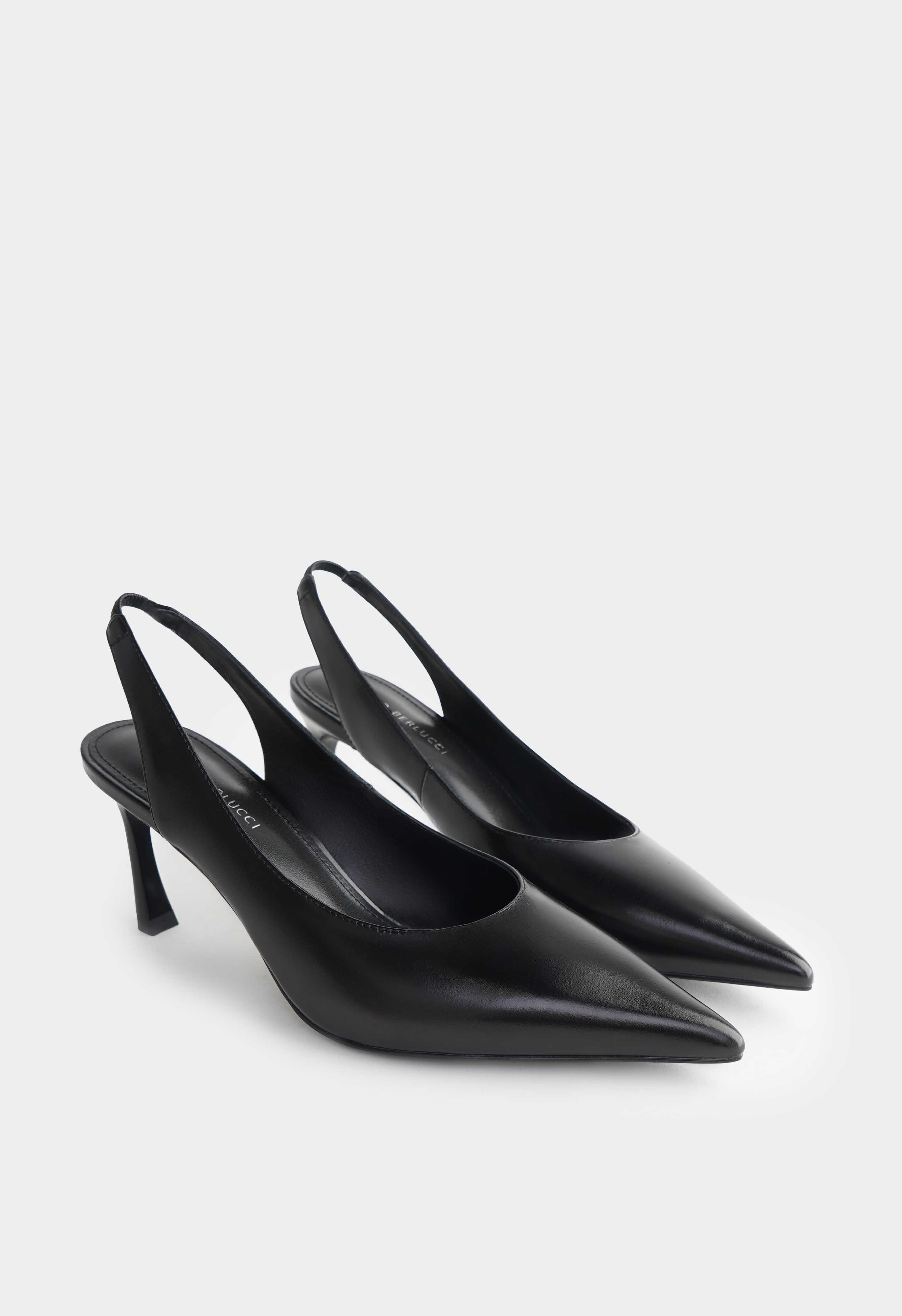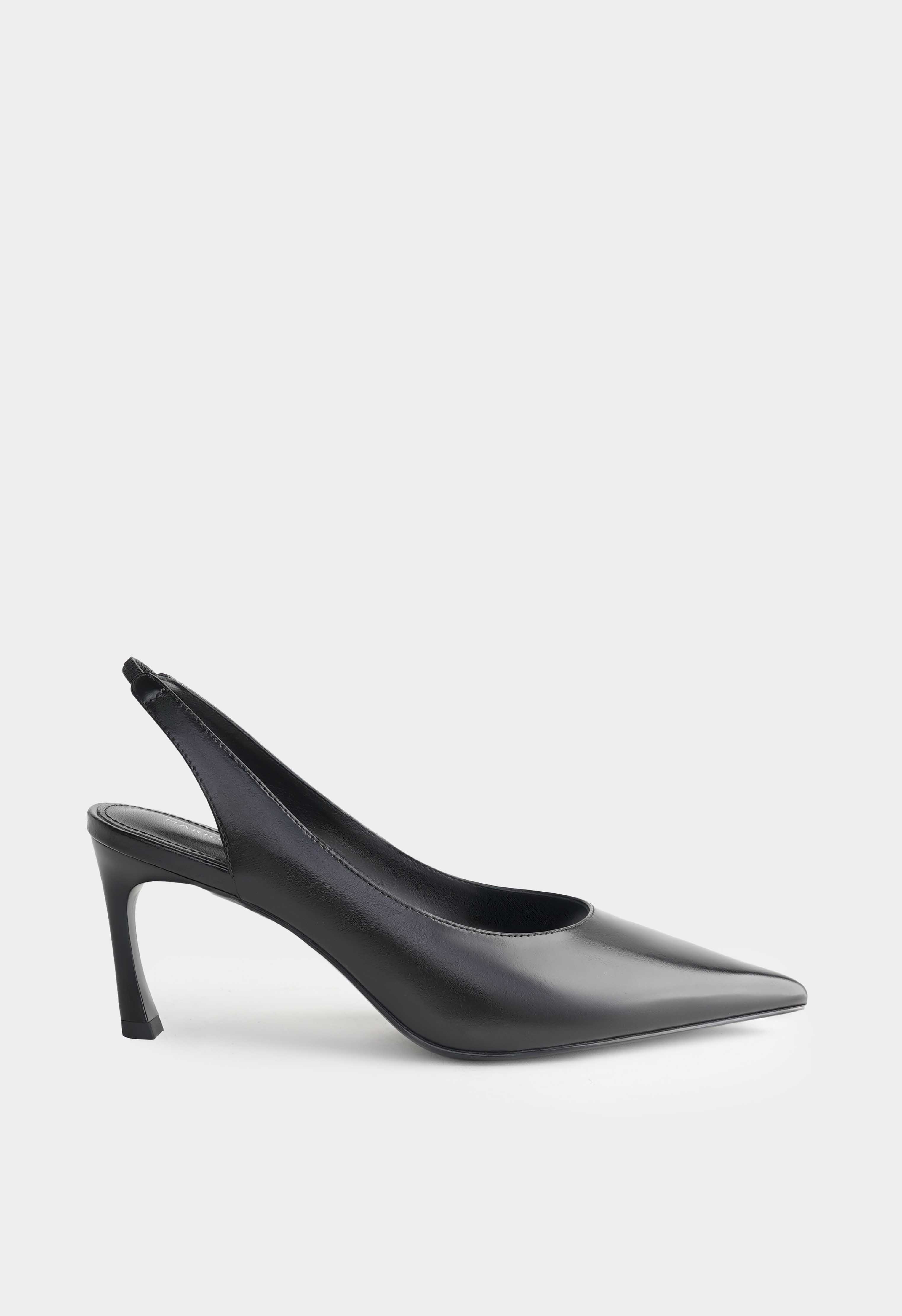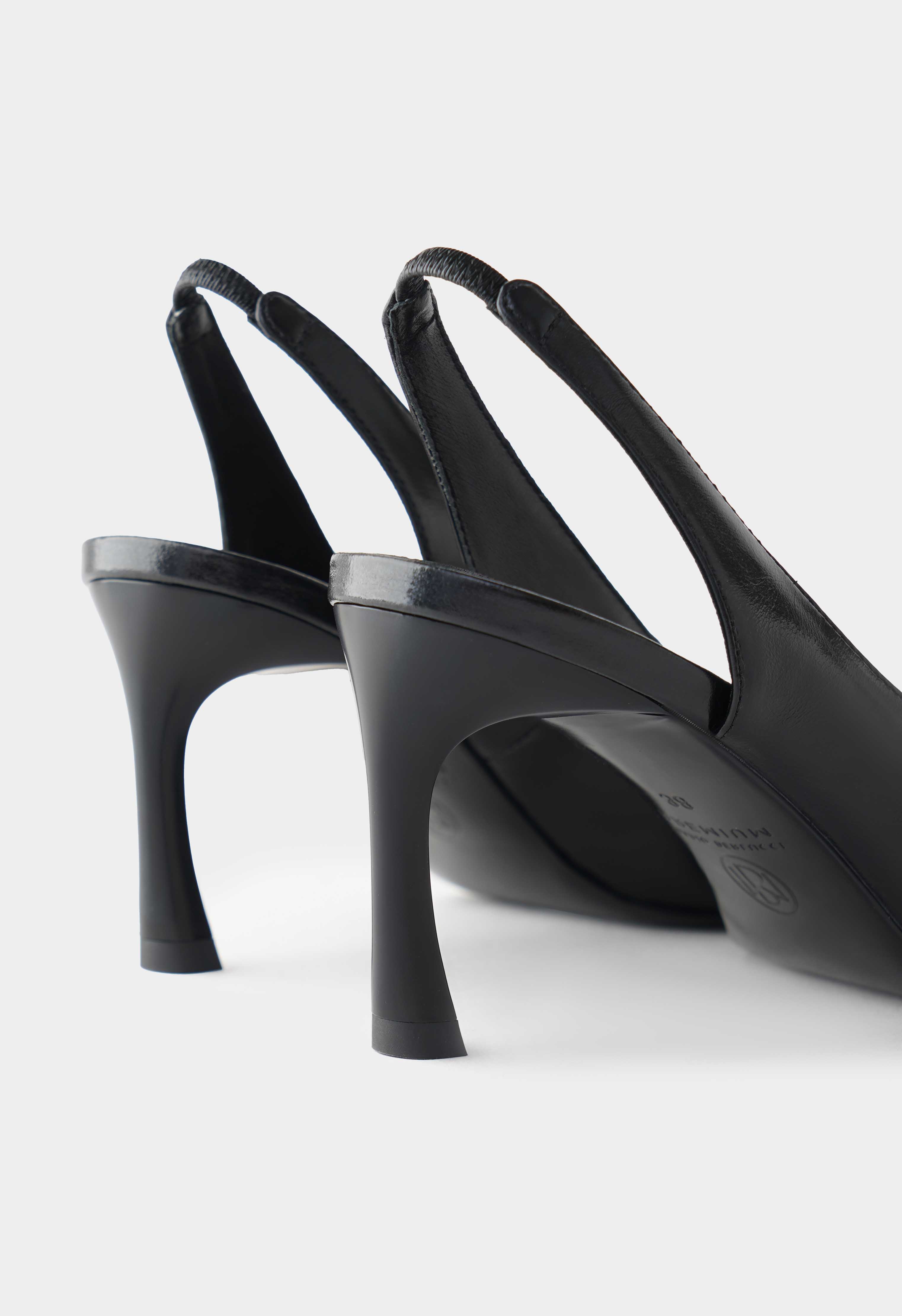 Черные туфли из натуральной кожи – воплощение утонченной строгости с модным акцентом: заостренный мысок визуально вытягивает силуэт, а оригинальный каблук «запятая» добавляет выразительности. Втачная резинка обеспечивает удобную посадку и легкость при надевании, в то время как гибкая подошва дарит комфорт и свободу движений в течение всего дня – идеальный выбор для стильных и уверенных образов.