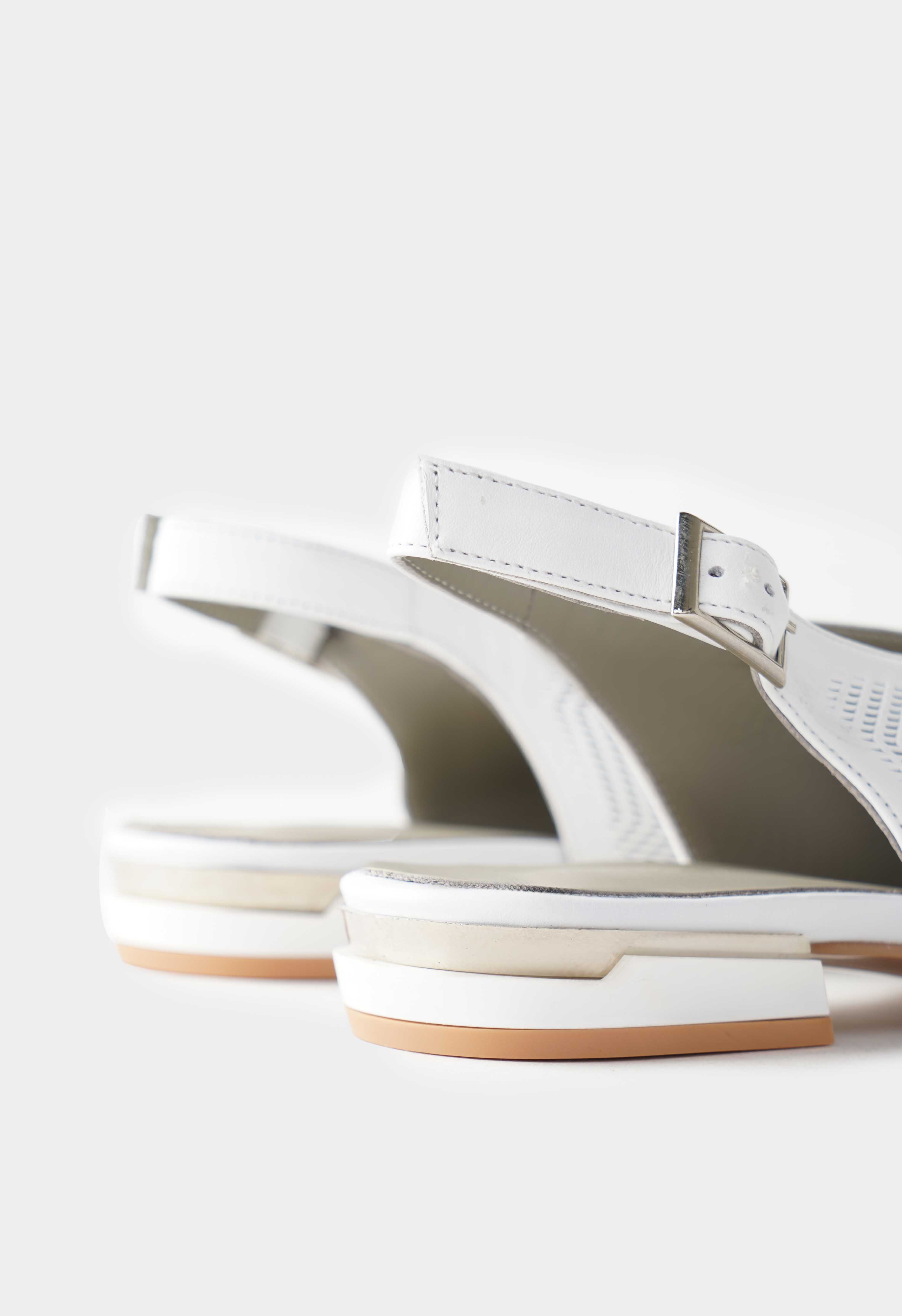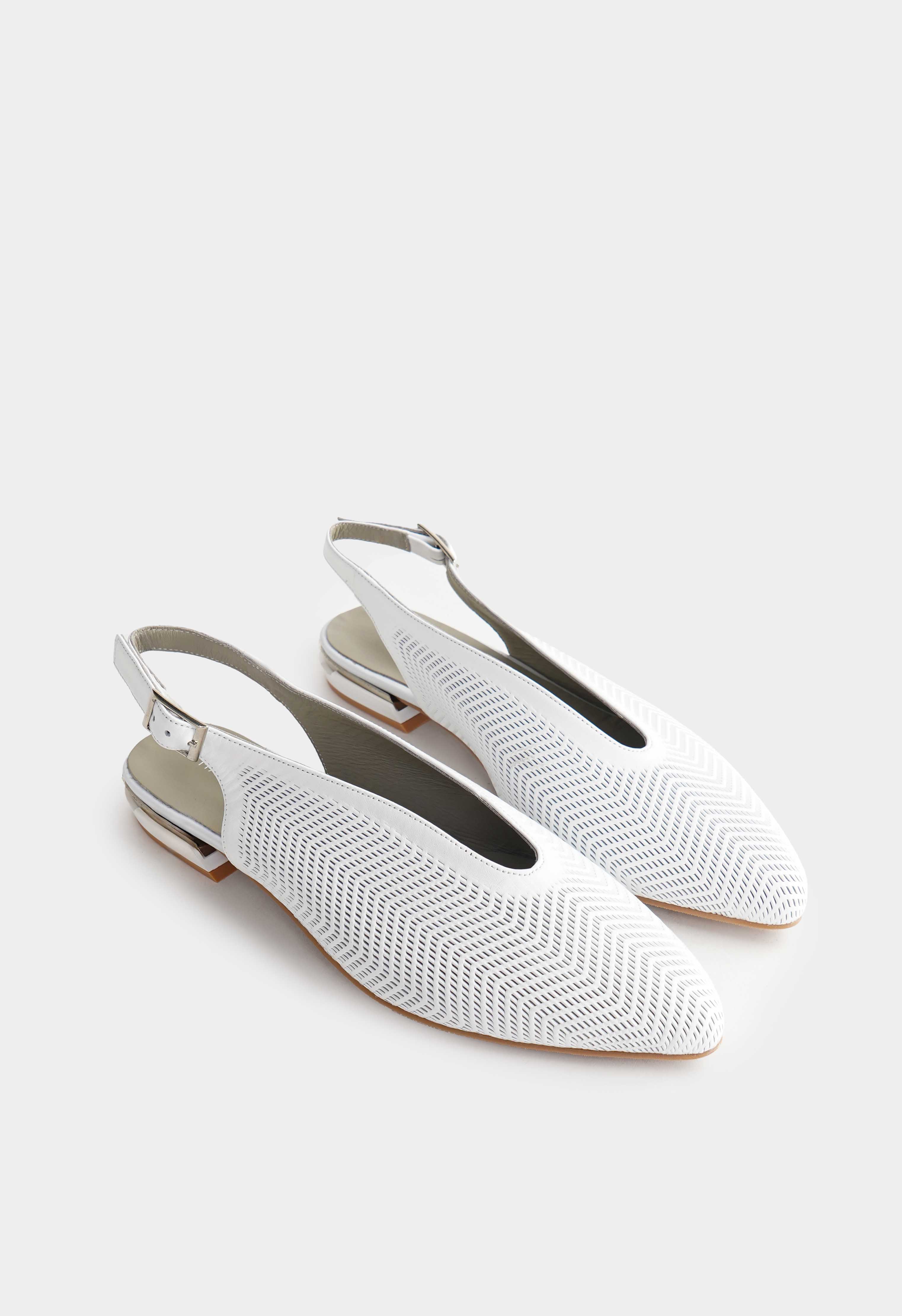 Белые туфли из натуральной кожи – изящное сочетание легкости и утонченного стиля: перфорация создает эффект воздушности, а заостренный мысок делает силуэт элегантным и визуально стройнит ногу. Аккуратная серебряная пряжка подчеркивает современный характер модели, венский каблук обеспечивает комфорт и устойчивость, в то время как жесткая подошва дарит уверенность в каждом шаге.