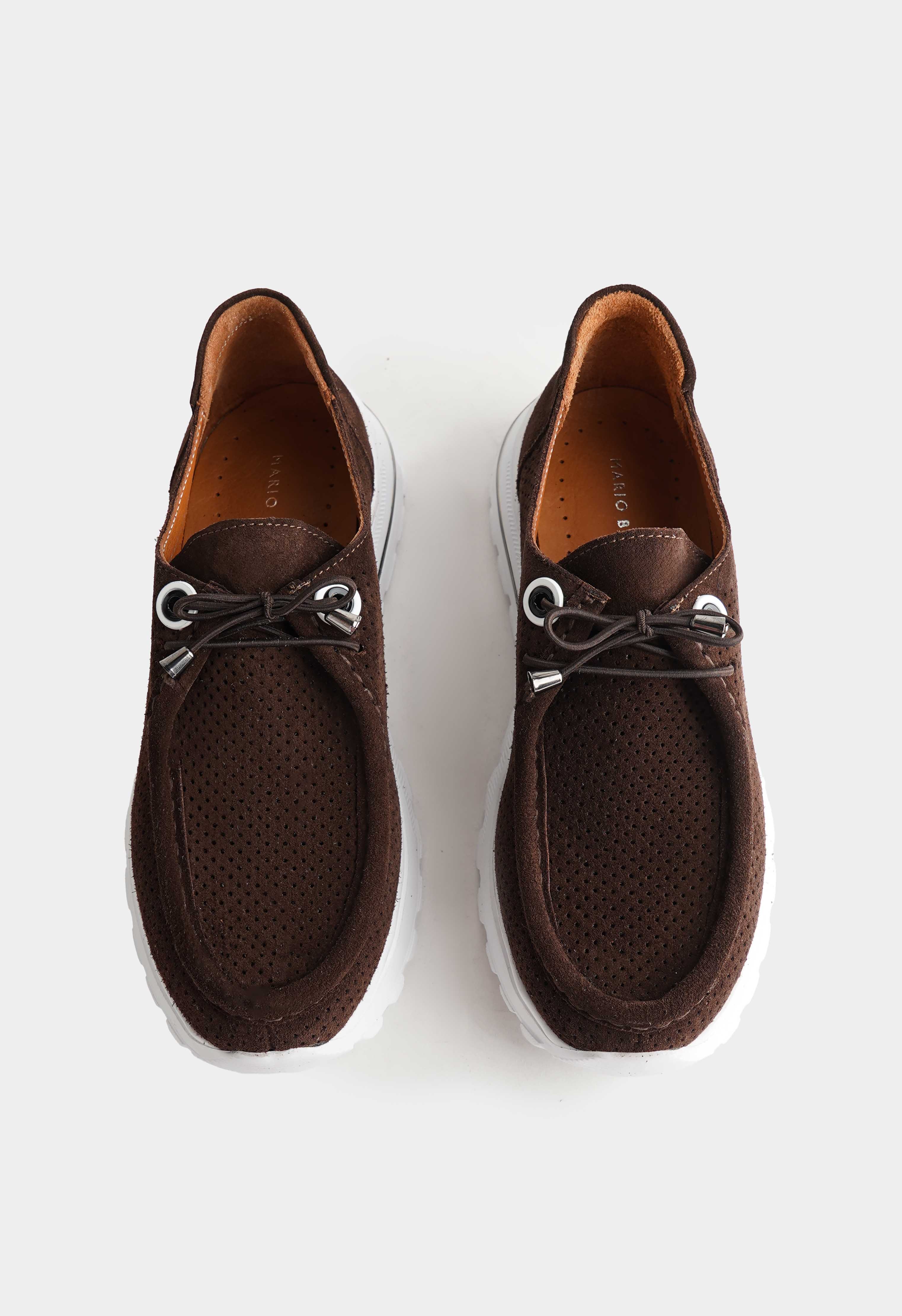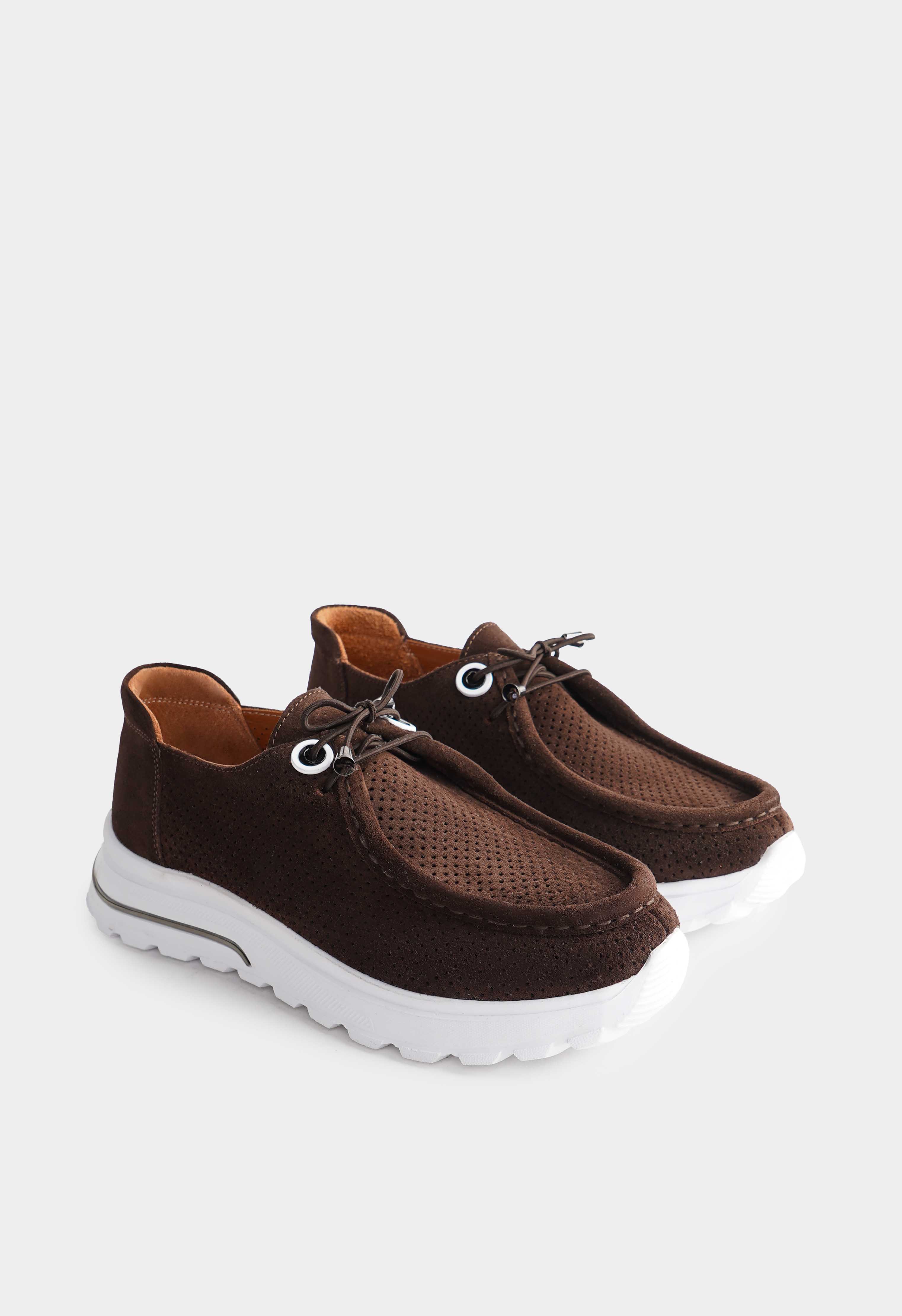 Коричневые кроссовки из натуральной замши – идеальное сочетание комфорта и современного стиля: мягкий оттенок делает модель универсальной, а перфорированная фактура добавляет легкости и обеспечивает дополнительную воздухопроницаемость. Округлый мысок дарит комфорт при носке, шнуровка с аккуратной металлической фурнитурой позволяет легко регулировать посадку, в то время как платформа визуально вытягивает силуэт. Гибкая подошва обеспечивает мягкость и свободу движений.