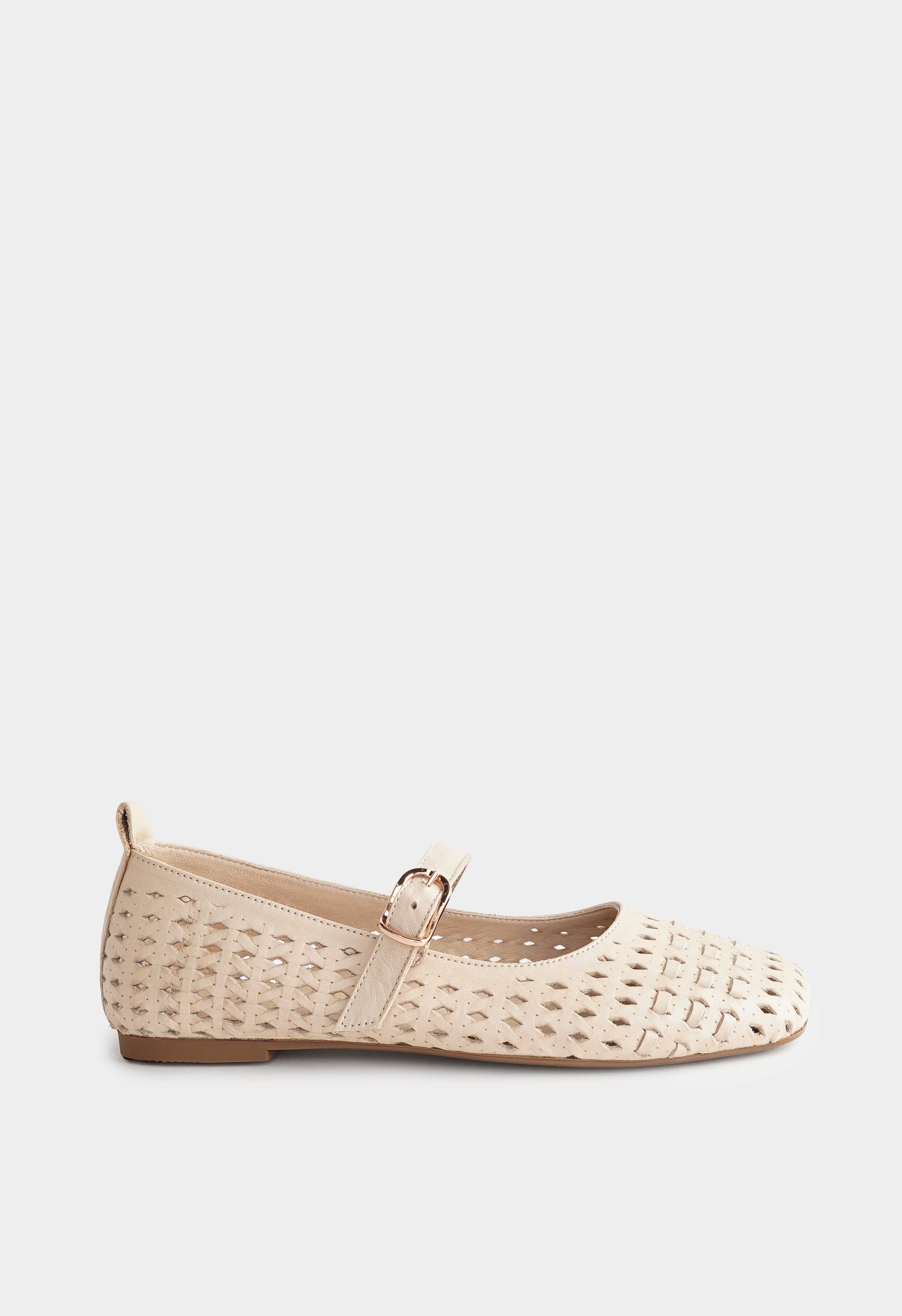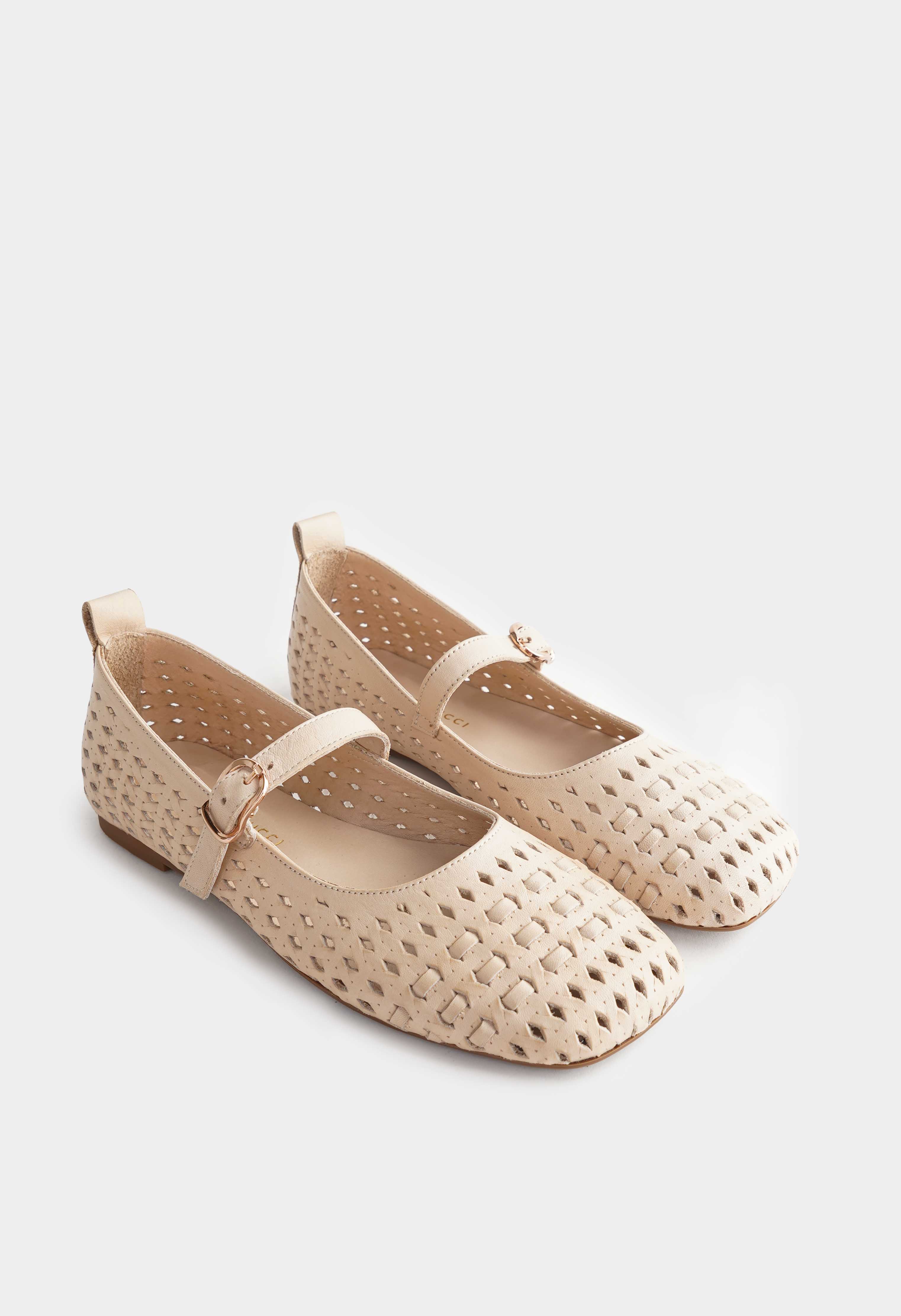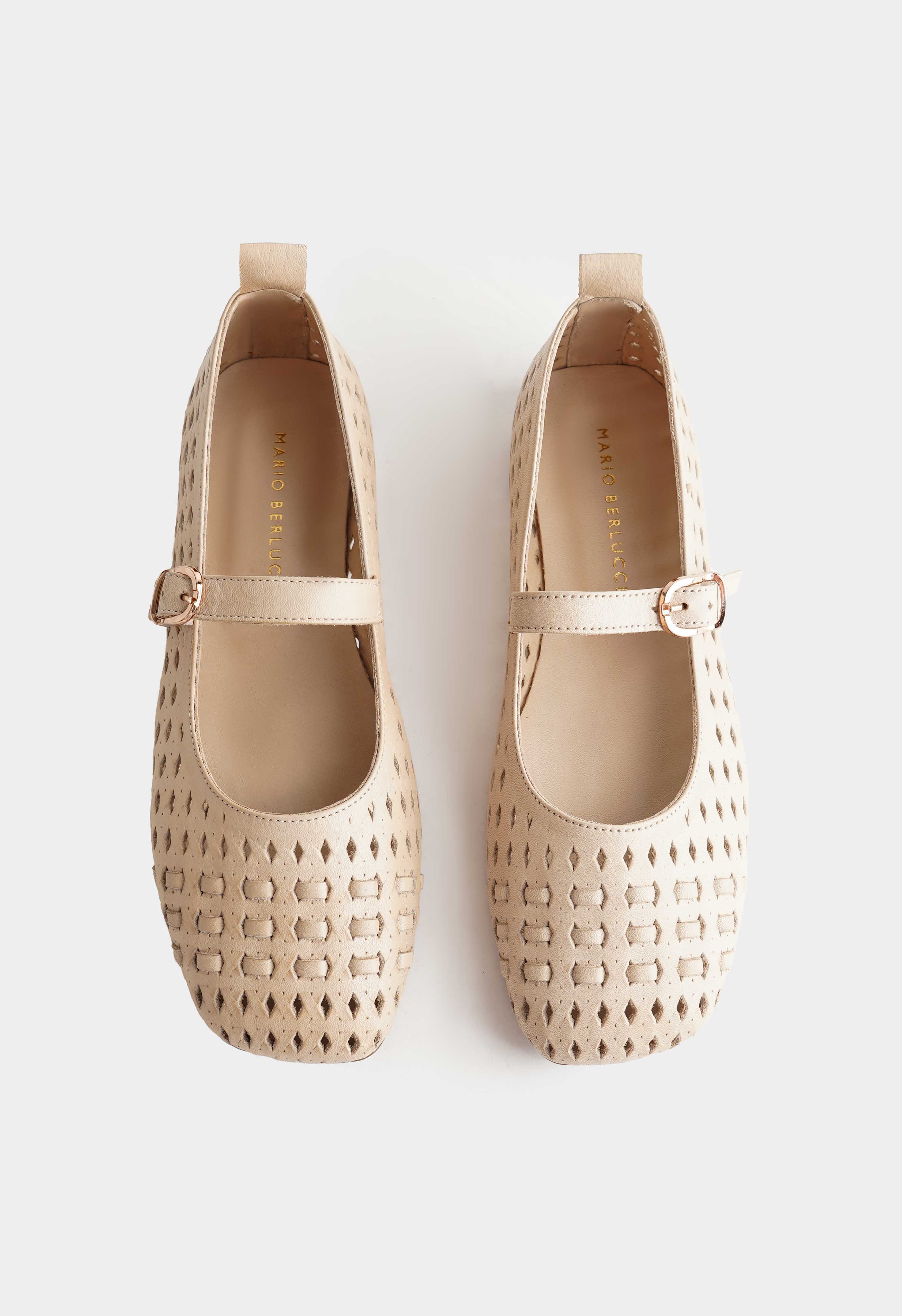 Бежевые балетки из натуральной кожи – идеальное сочетание утонченности и повседневного комфорта. Перфорация придает модели легкость, а округлый мысок обеспечивает мягкую посадку и удобство на протяжении всего дня. Аккуратный ремешок с золотой пряжкой не только фиксирует стопу, но и добавляет образу элегантный акцент. Невысокий венский каблук делает силуэт женственным, в то время как гибкая подошва дарит свободу движений и комфорт при каждом шаге.