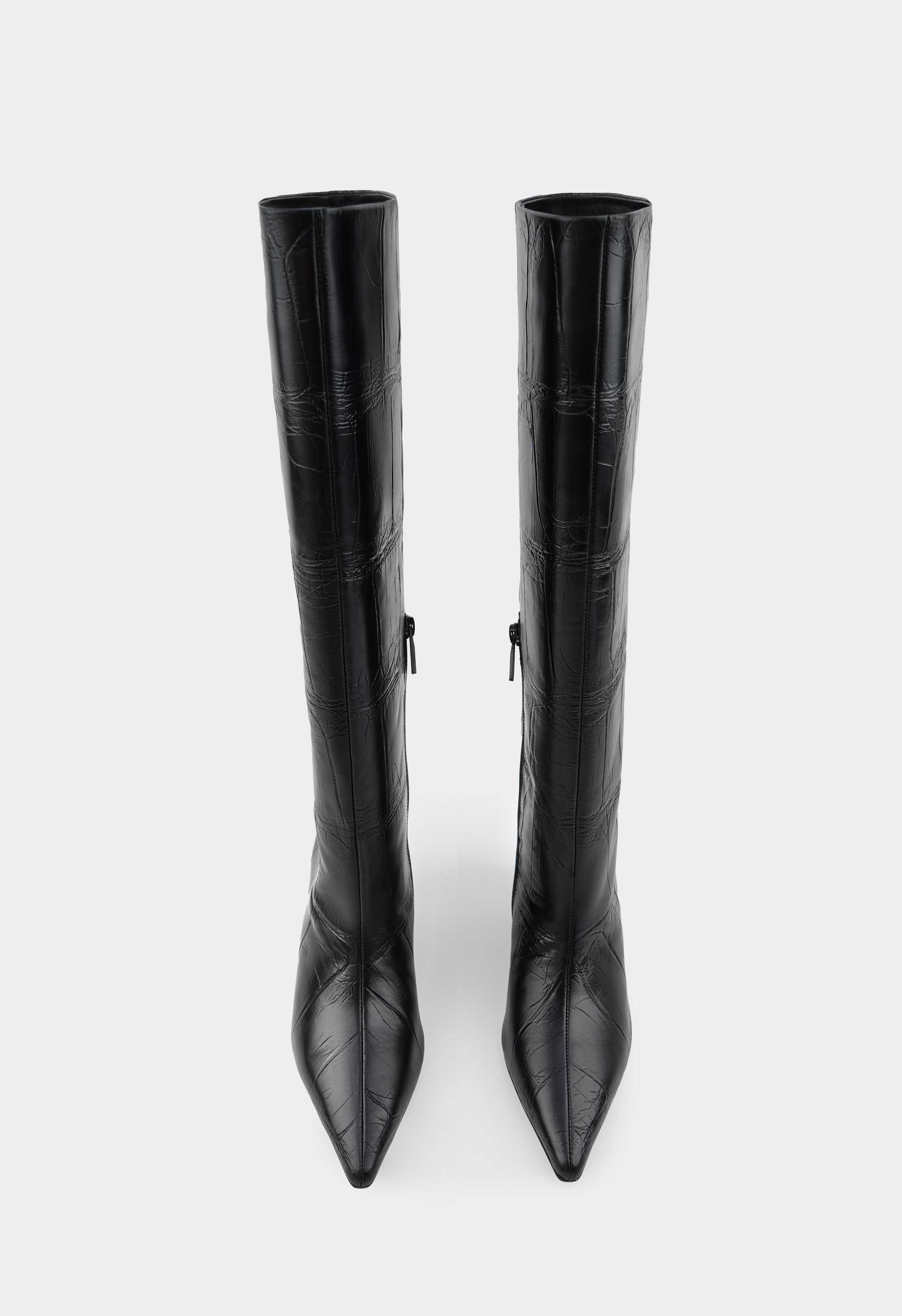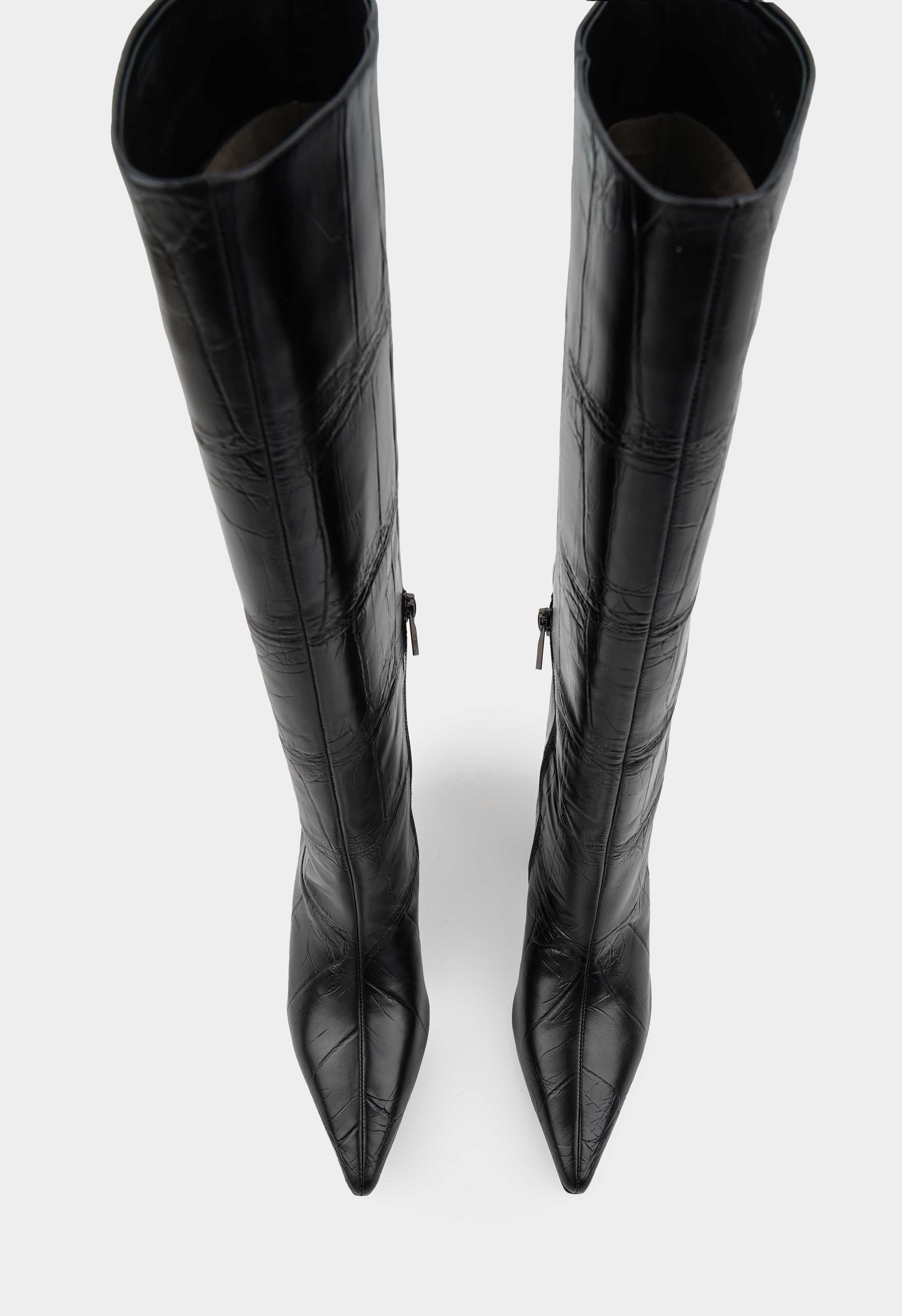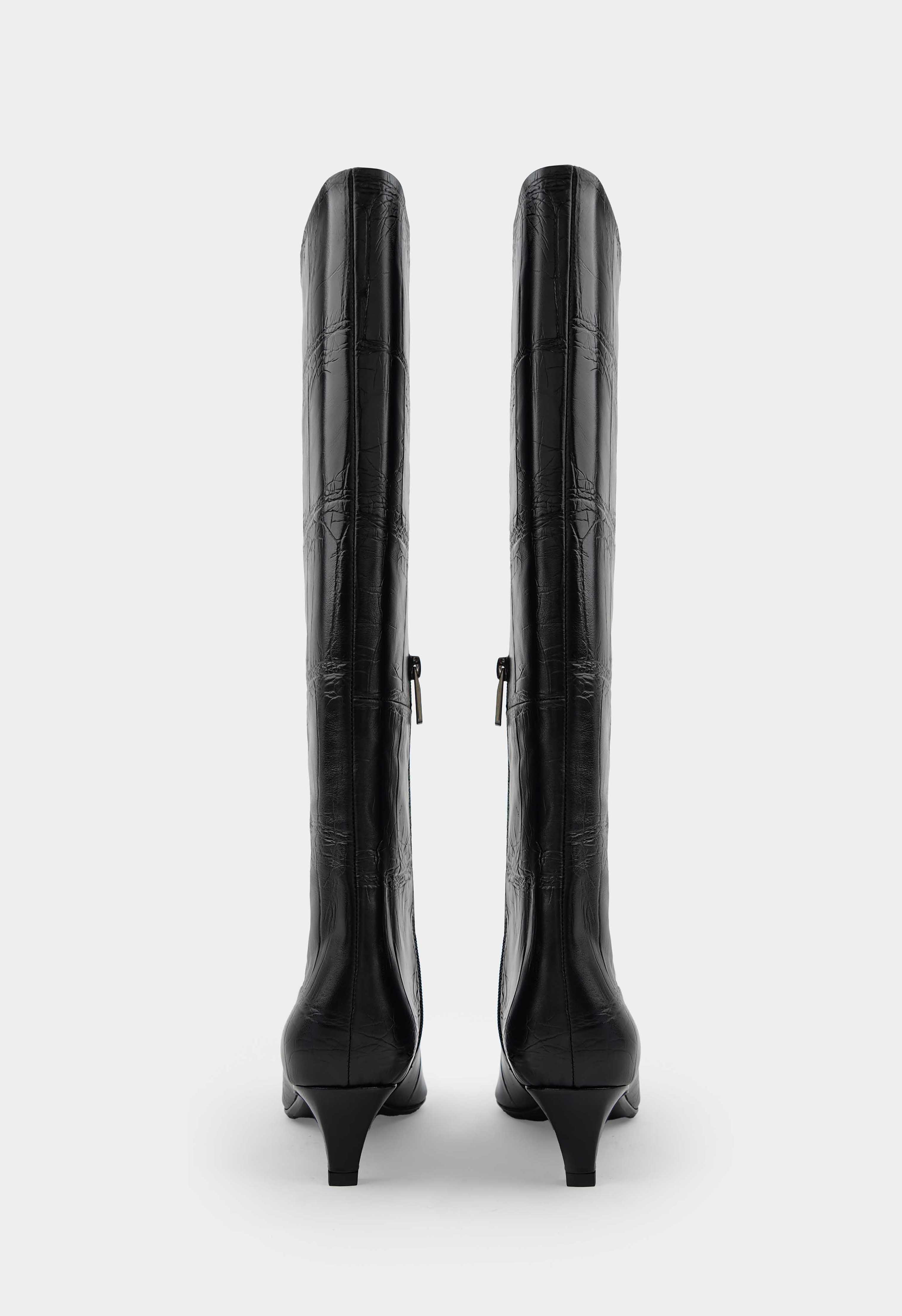Изысканные черные сапоги из натуральной тисненной кожи с элегантным заостренным мысом и утонченным каблуком kitten heel создают образ безупречного стиля. Гибкая подошва обеспечивает удивительную легкость при ходьбе, а мягкая байковая подкладка дарит комфорт в прохладную погоду. Стильная молния с фурнитурой металлик добавляет модели современный акцент, подчеркивая строгий вид этих сапог. Универсальная пара станет идеальным выбором для деловых встреч и вечерних выходов.