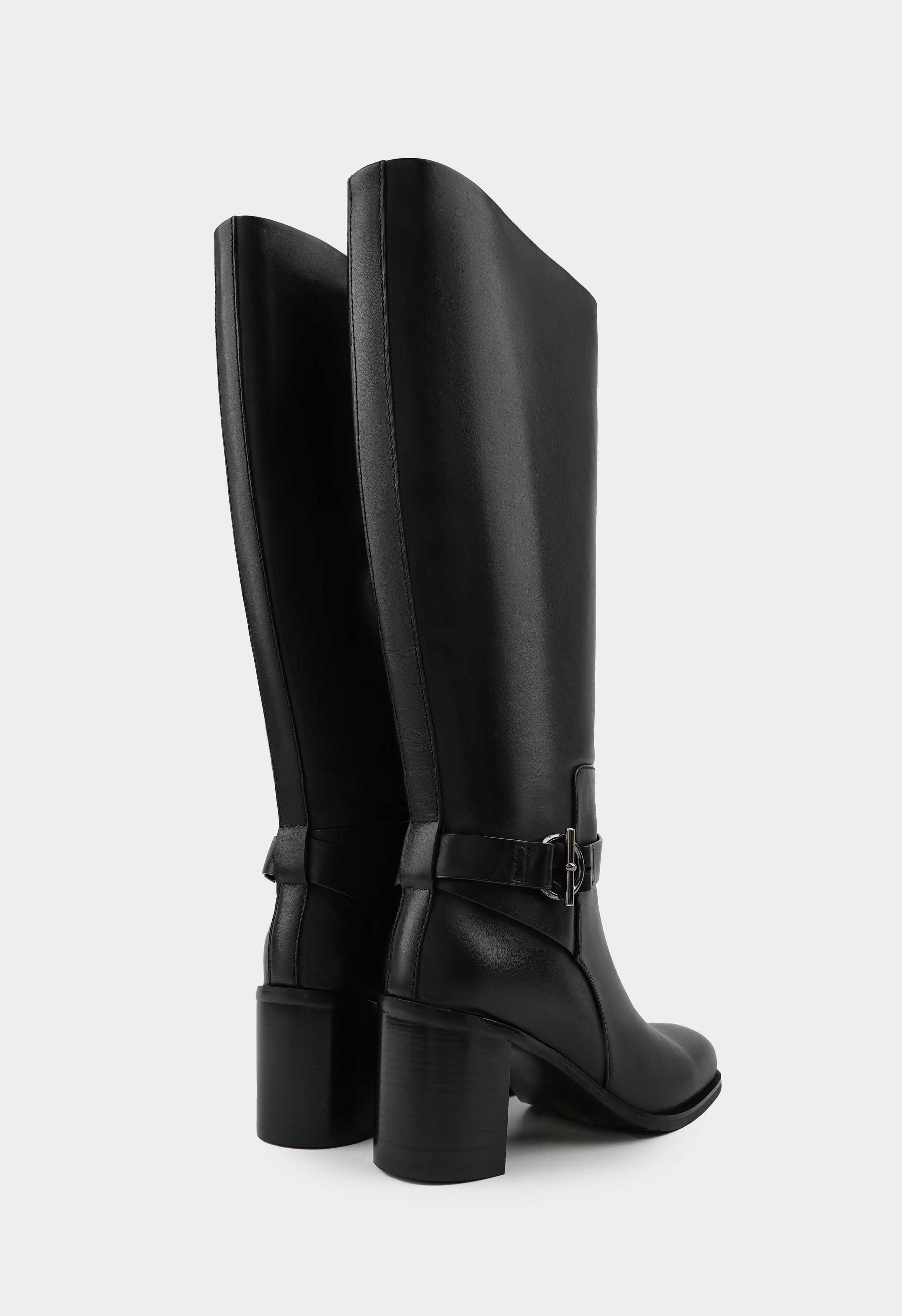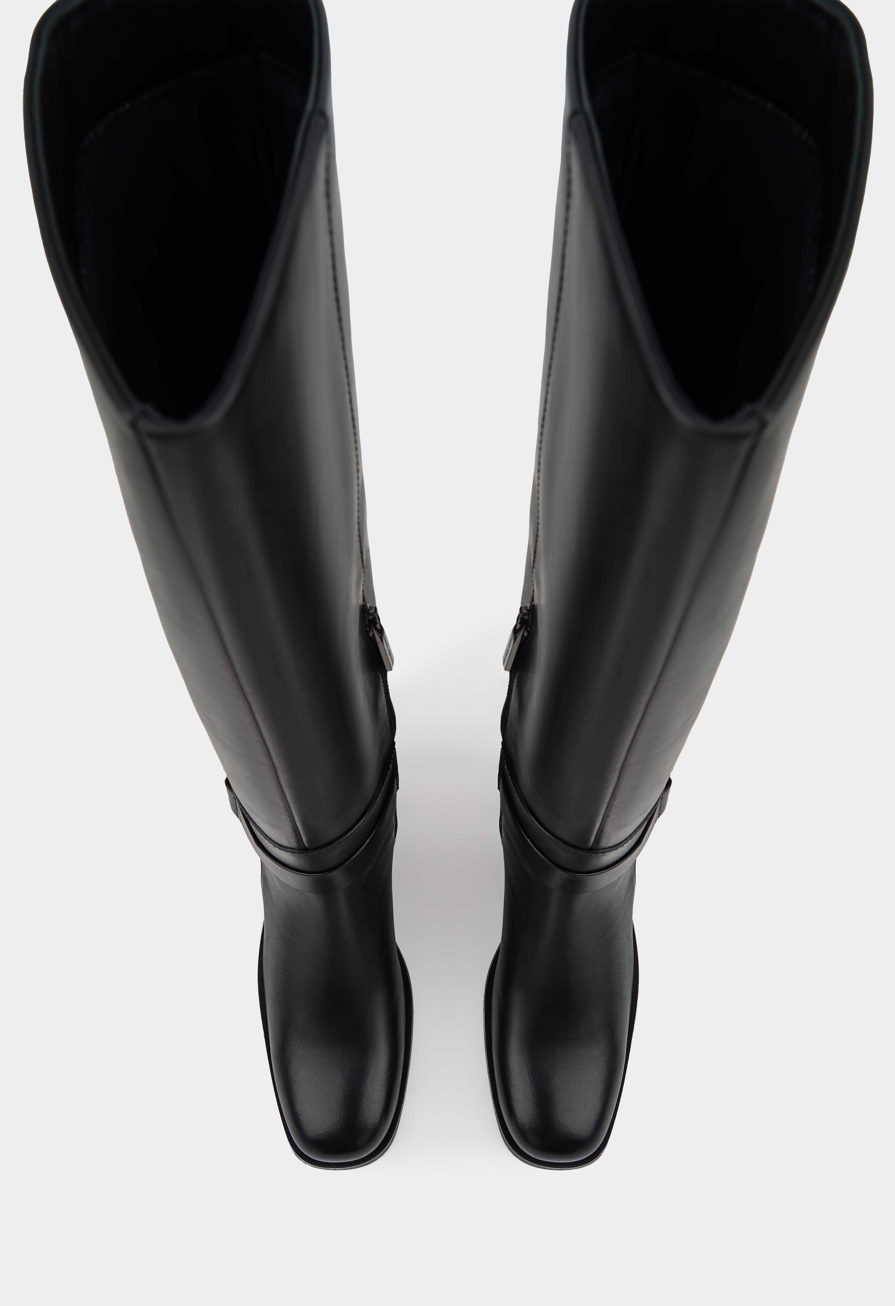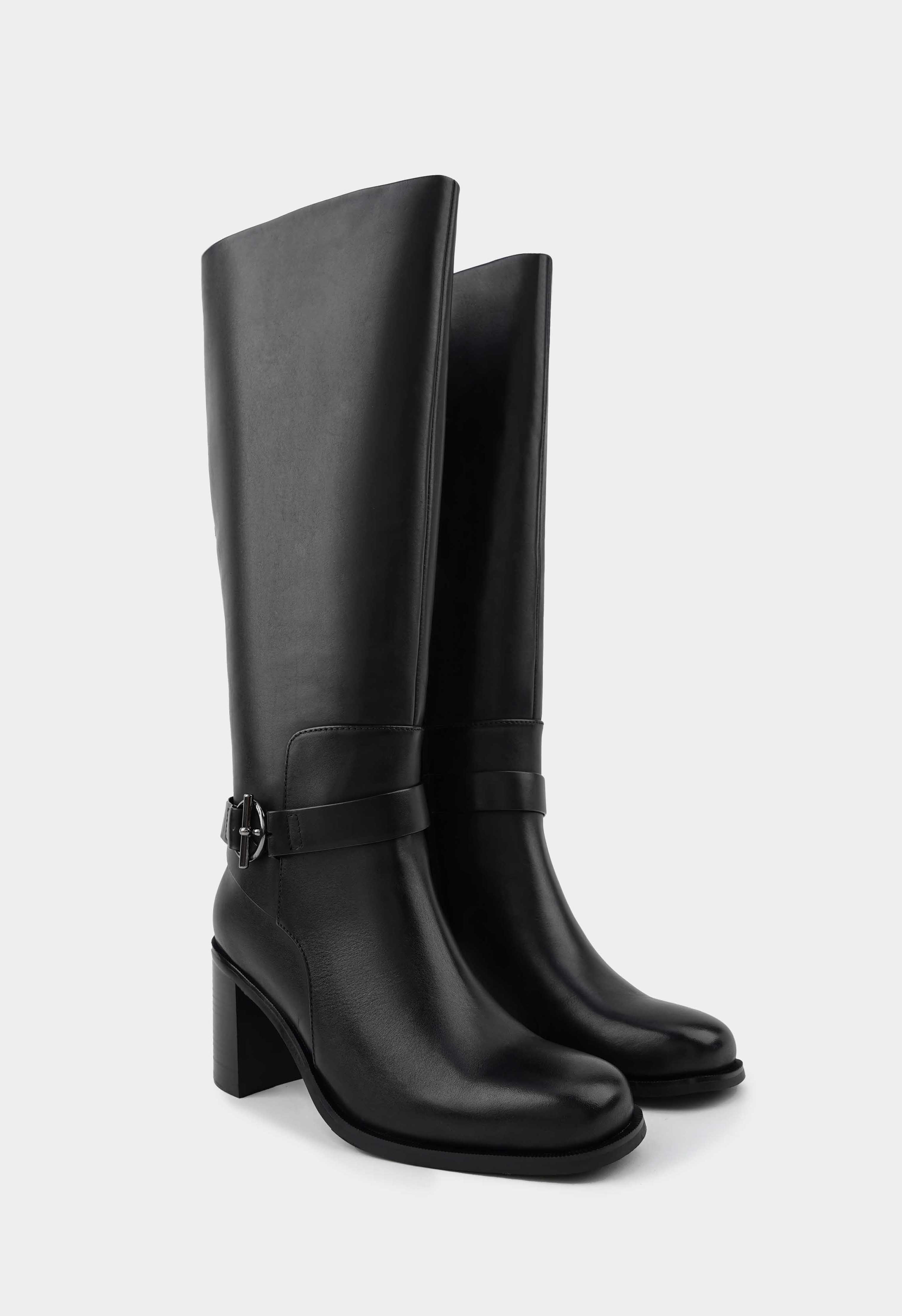 Современные черные сапоги из натуральной кожи с округлым мыском и стильной фурнитурой металлик создают утонченный образ. Гибкая подошва и устойчивый широкий каблук обеспечивают комфорт при ходьбе по городским улицам, а удобная боковая молния и мягкая байковая подкладка делают каждую носку приятной. Универсальная модель легко сочетается с разными стилями – от делового костюма до повседневных образов.