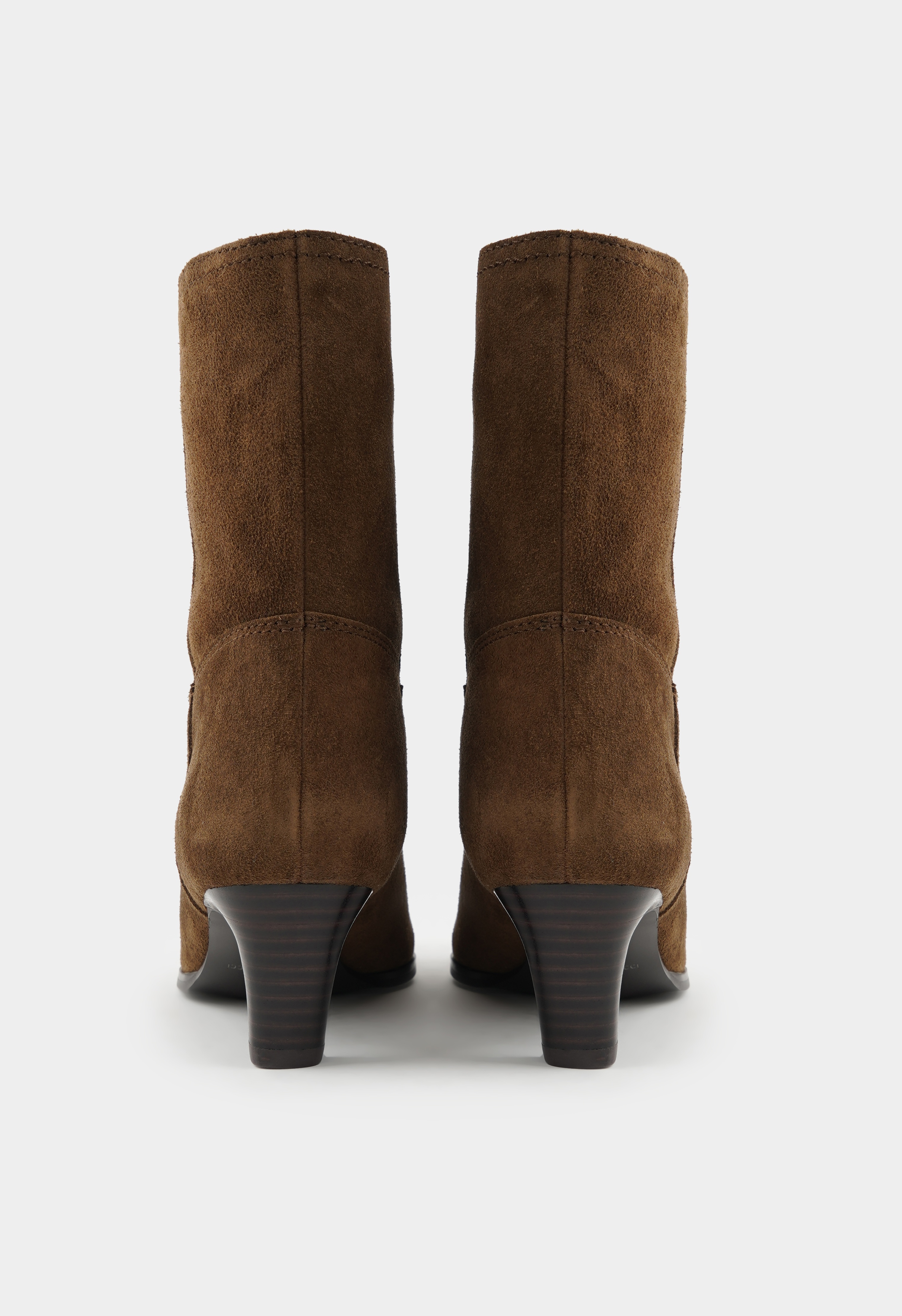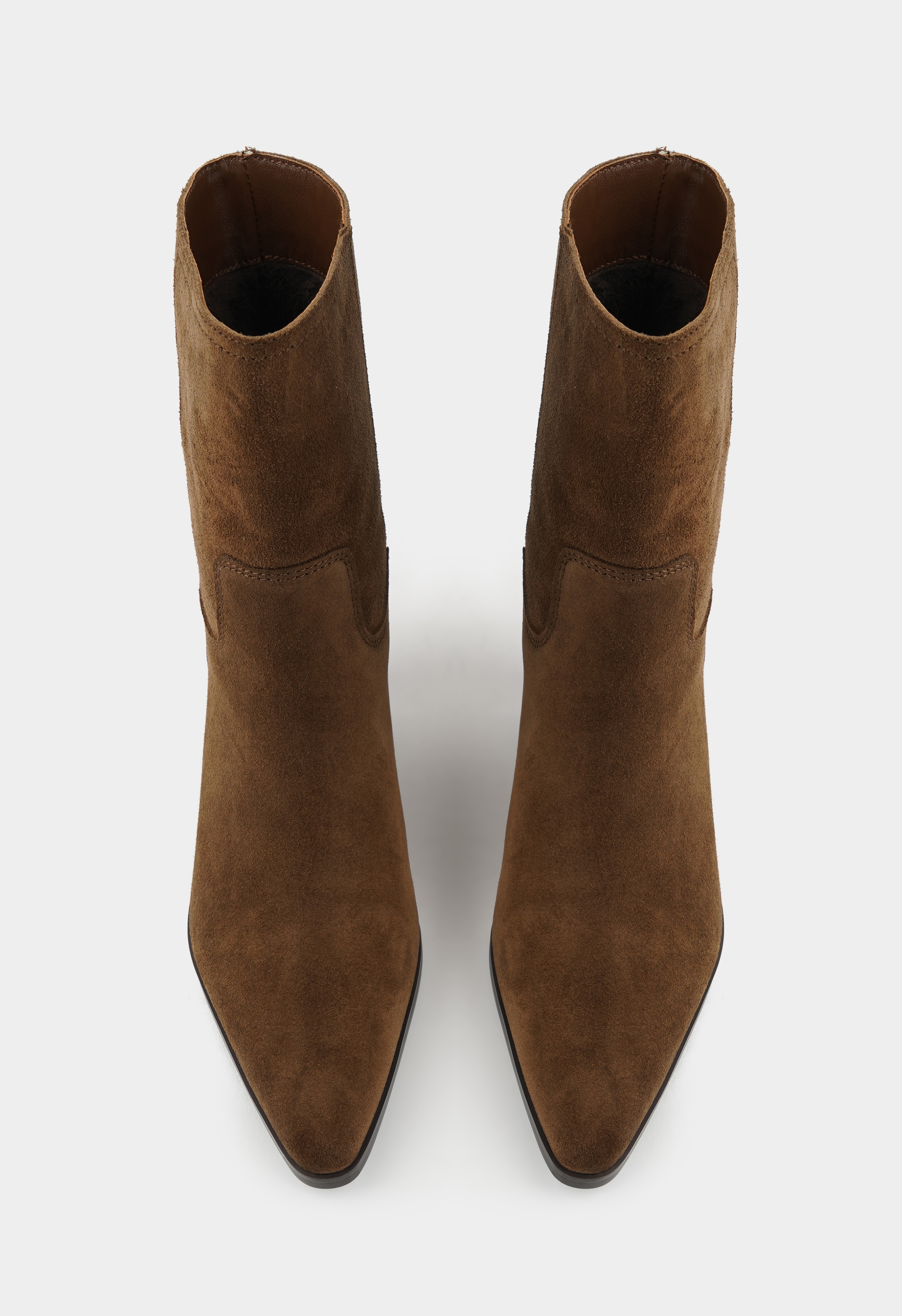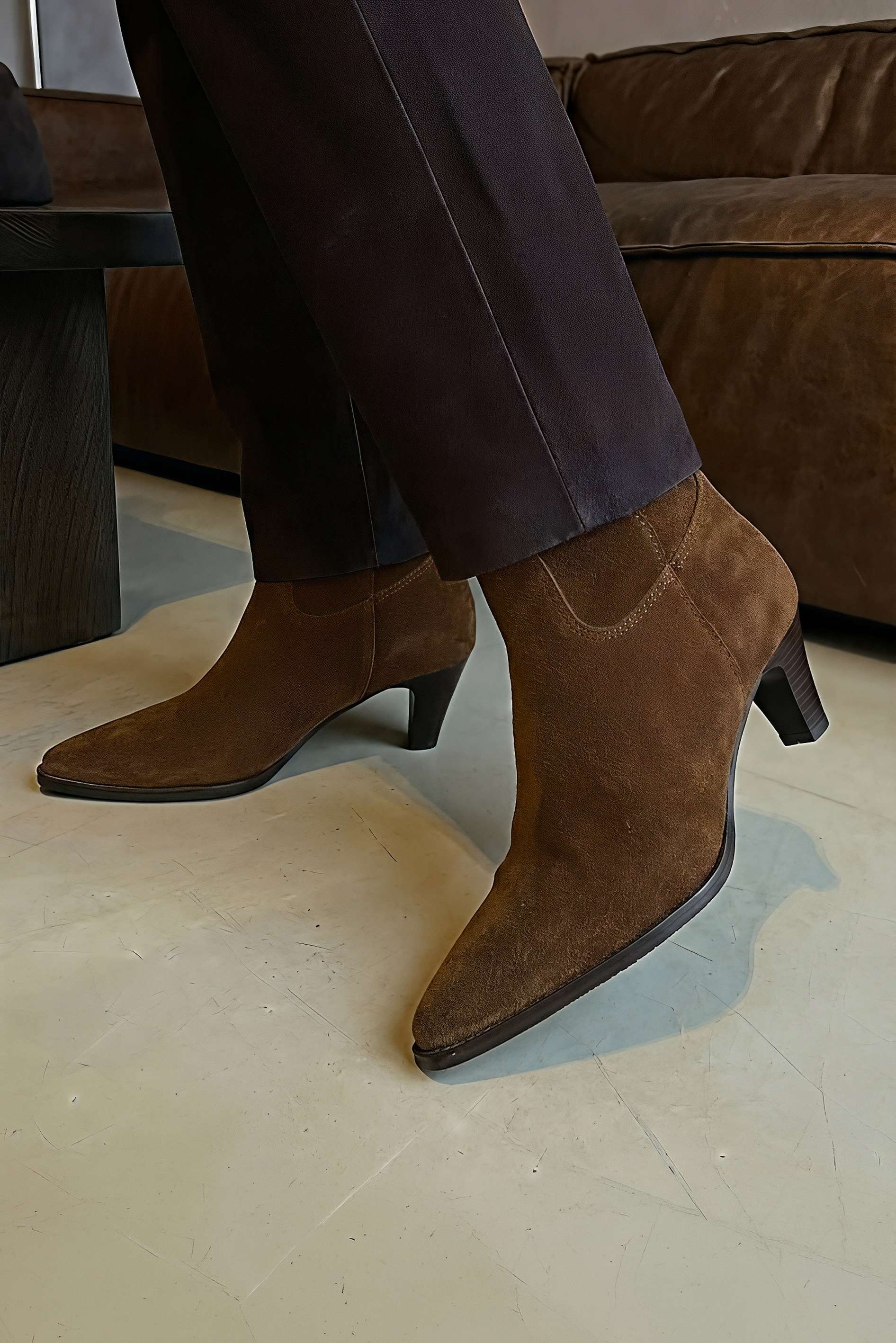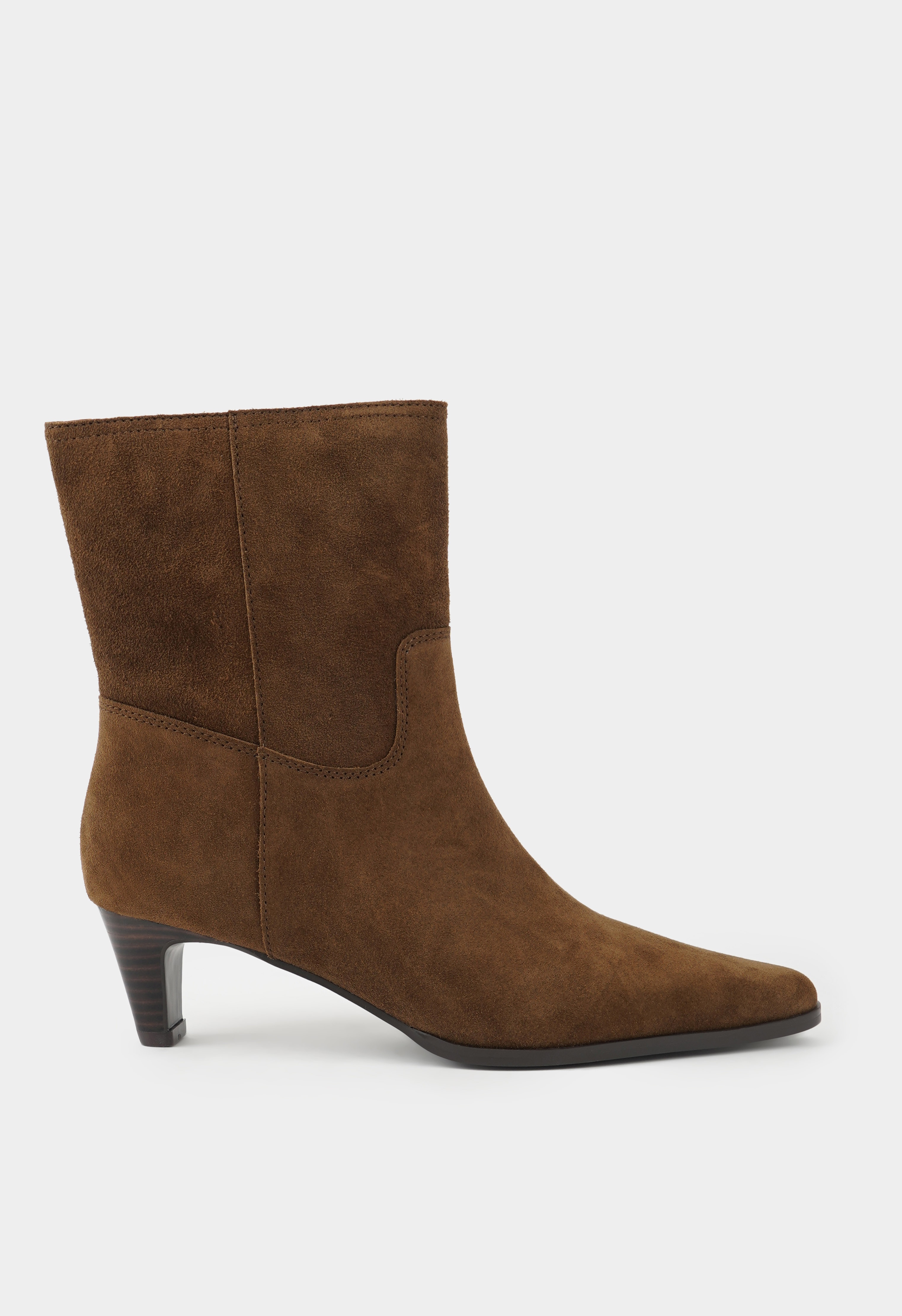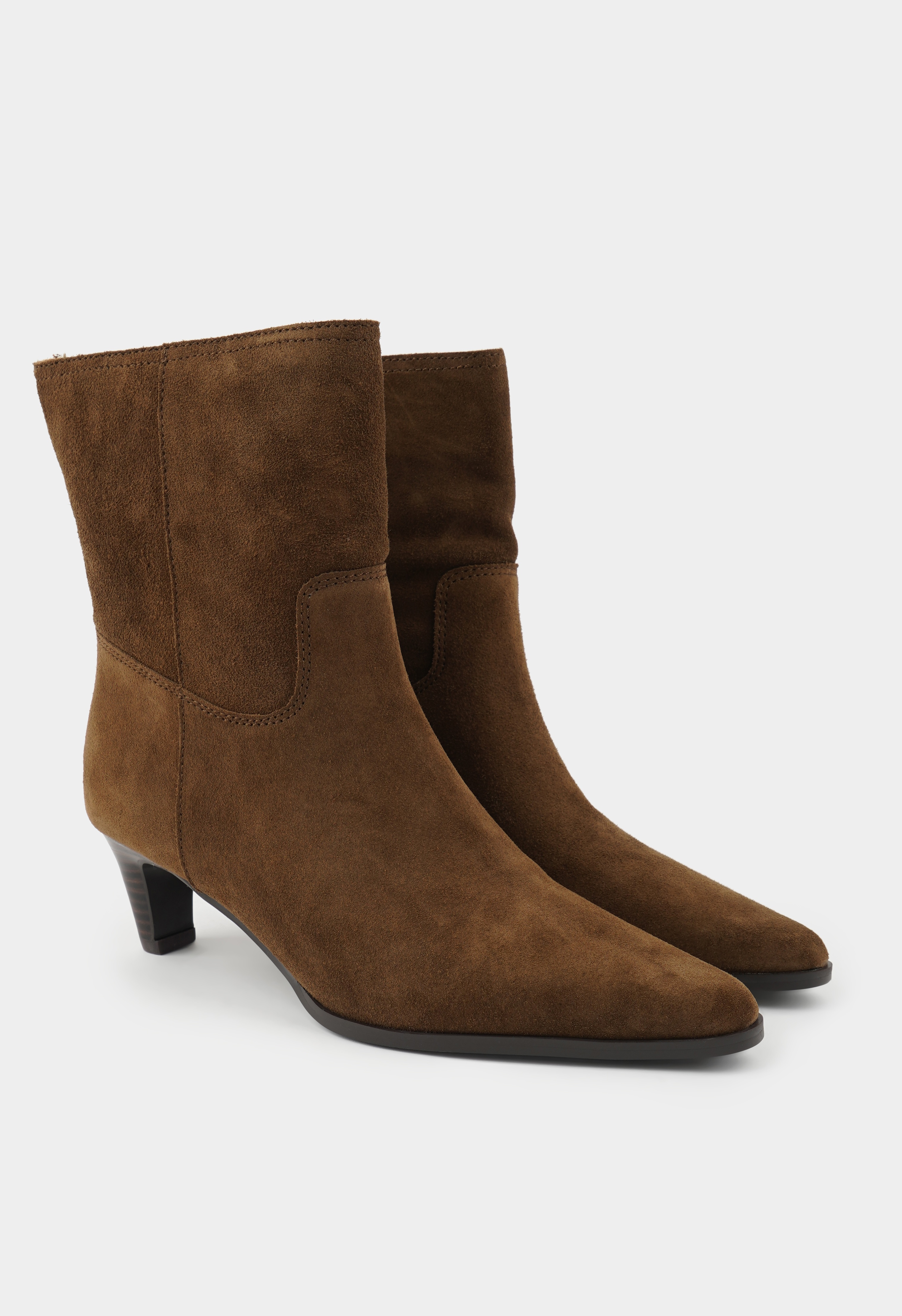 Ботильоны из натуральной замши коричневого цвета с байкой внутри – это эффектная модель, которая сочетает комфорт и яркий акцент в образе. Жесткая подошва и оригинальный каблук «запятая» обеспечивают устойчивость, а заостренный мысок придает утонченность и визуально вытягивает силуэт. Базовый дизайн превращает ботильоны в изюминку гардероба, которая уместна как в повседневных луках, так и в вечерних выходах.