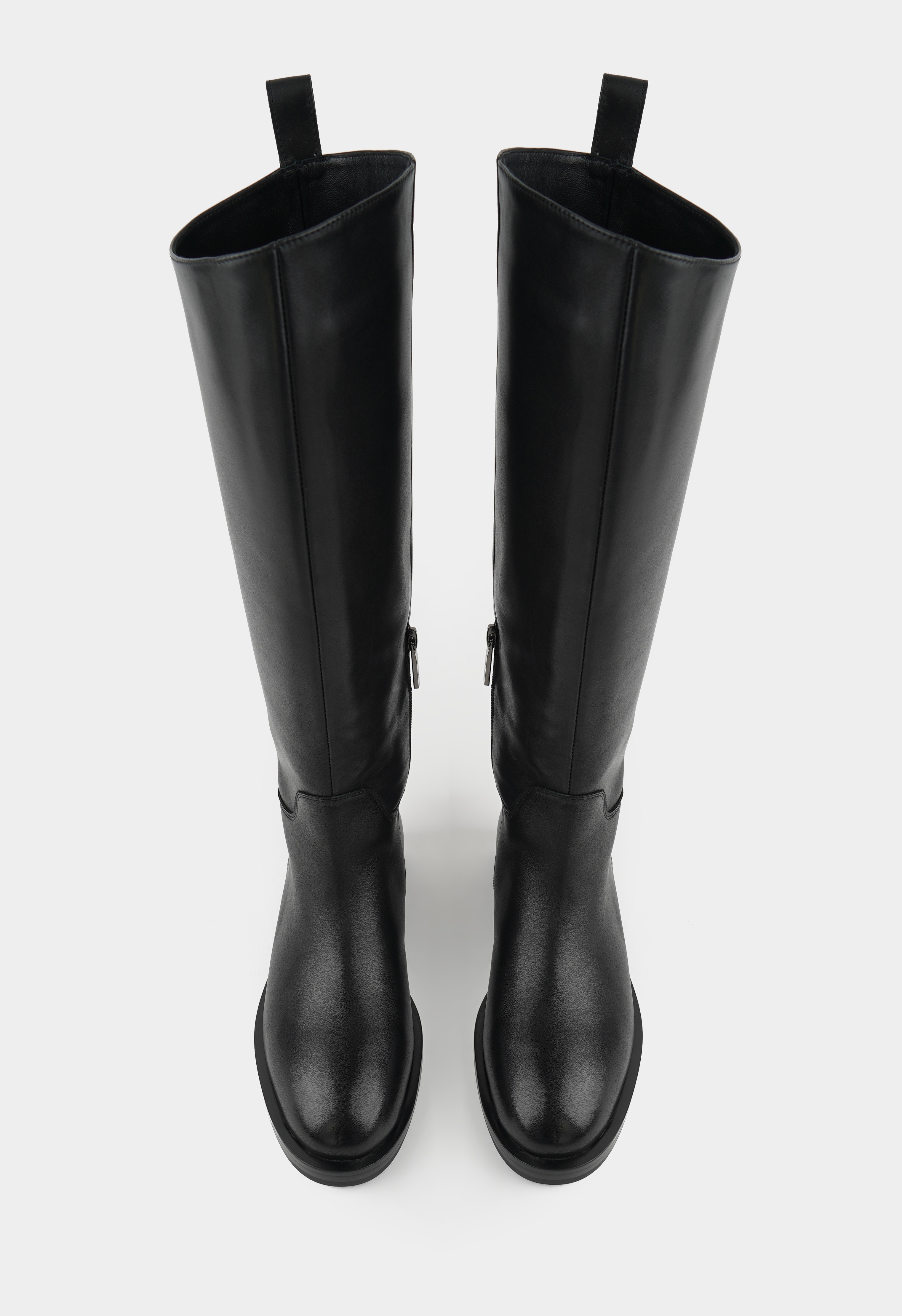 Сапоги черного цвета из натуральной кожи с мягкой байковой подкладкой – настоящая находка для тех, кто ценит стиль и комфорт одновременно. Округлый мысок, широкий каблук и дополнительная меховая стелька обеспечивают удобство на каждом шаге, а аккуратная металлическая фурнитура и молния добавляют современный, утонченный акцент. Жесткая подошва гарантирует надежную устойчивость, делая обувь практичной для повседневной носки, в то время как лаконичный дизайн легко сочетается с любыми образами, подчеркивая вашу уверенность и вкус.