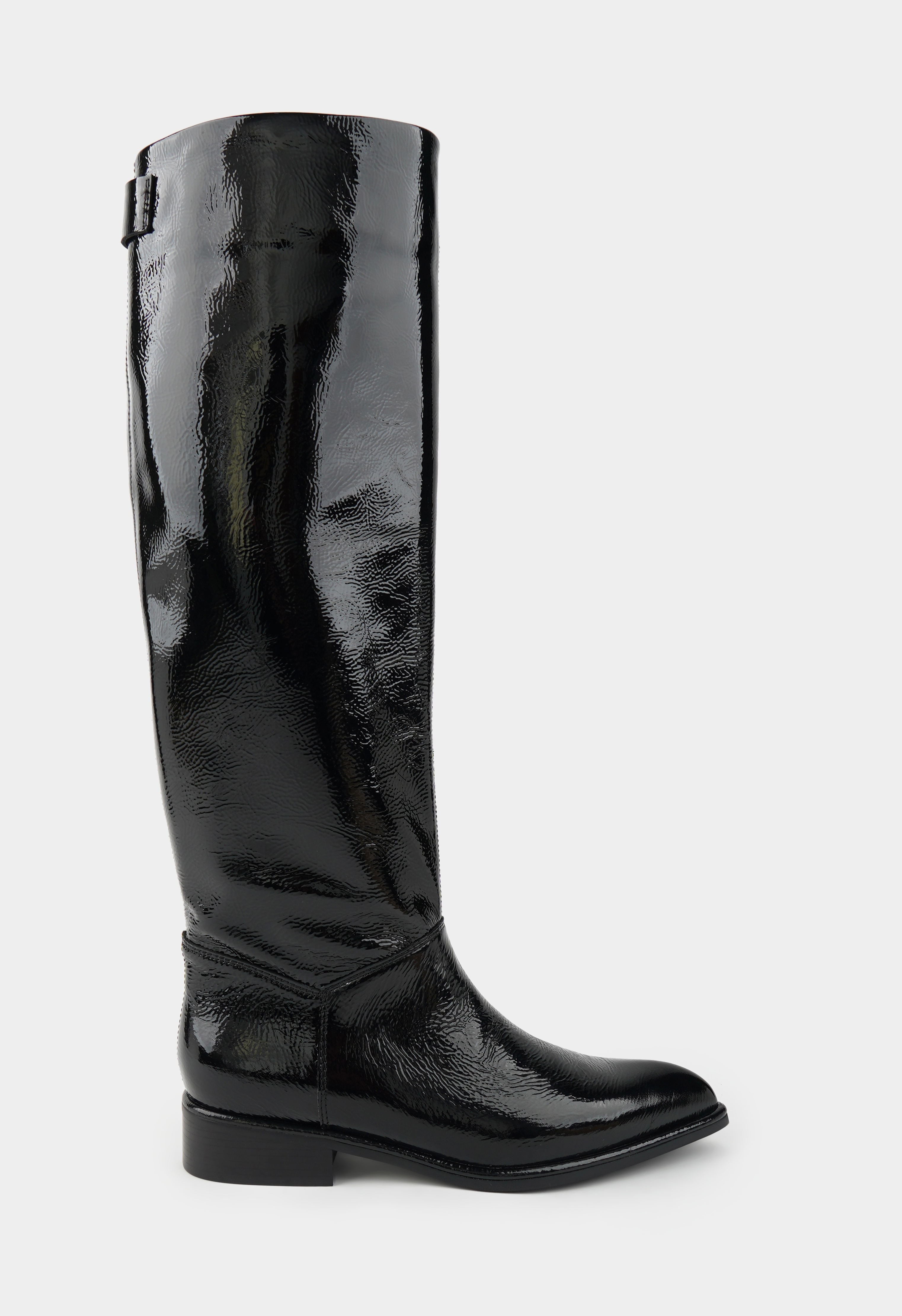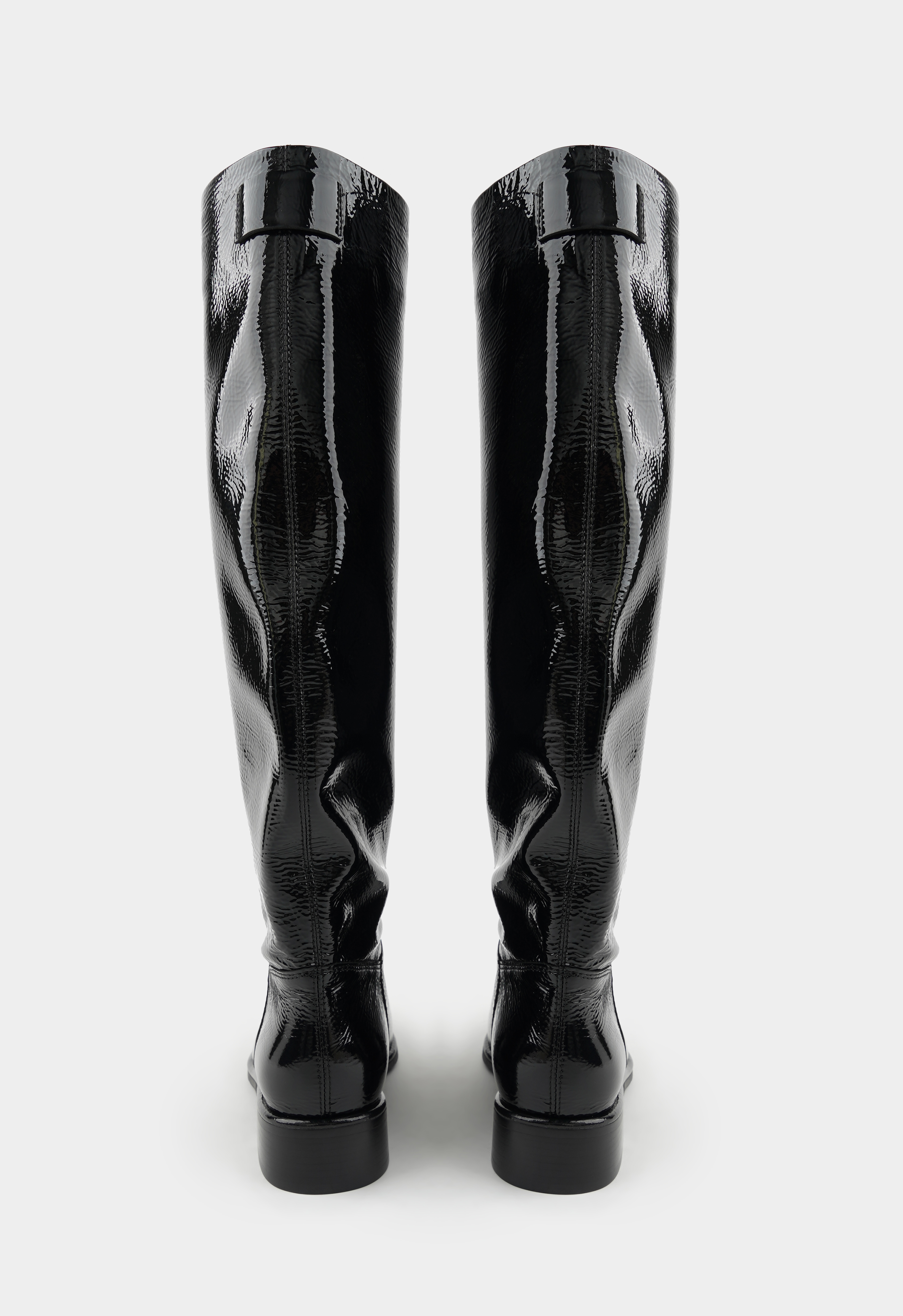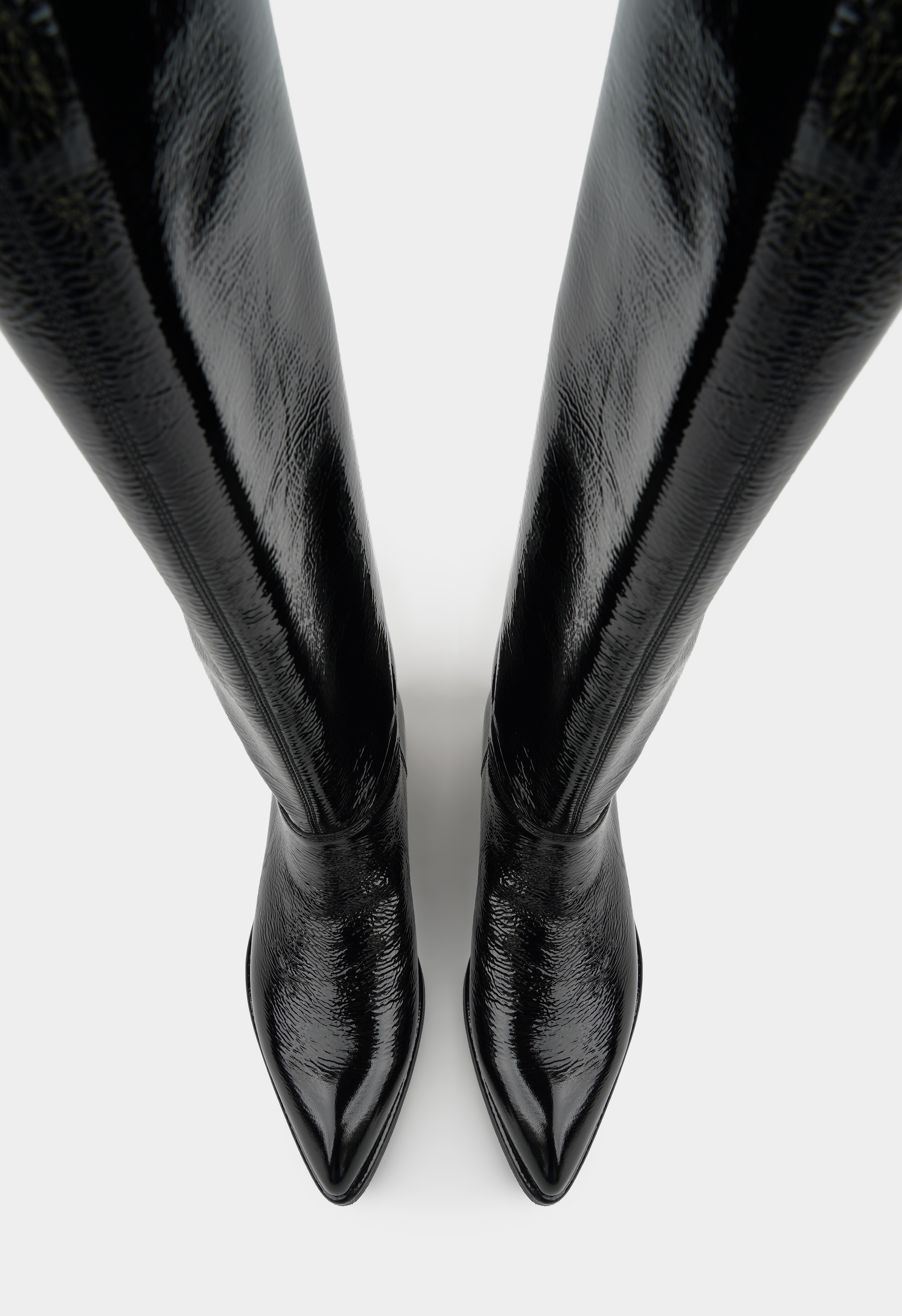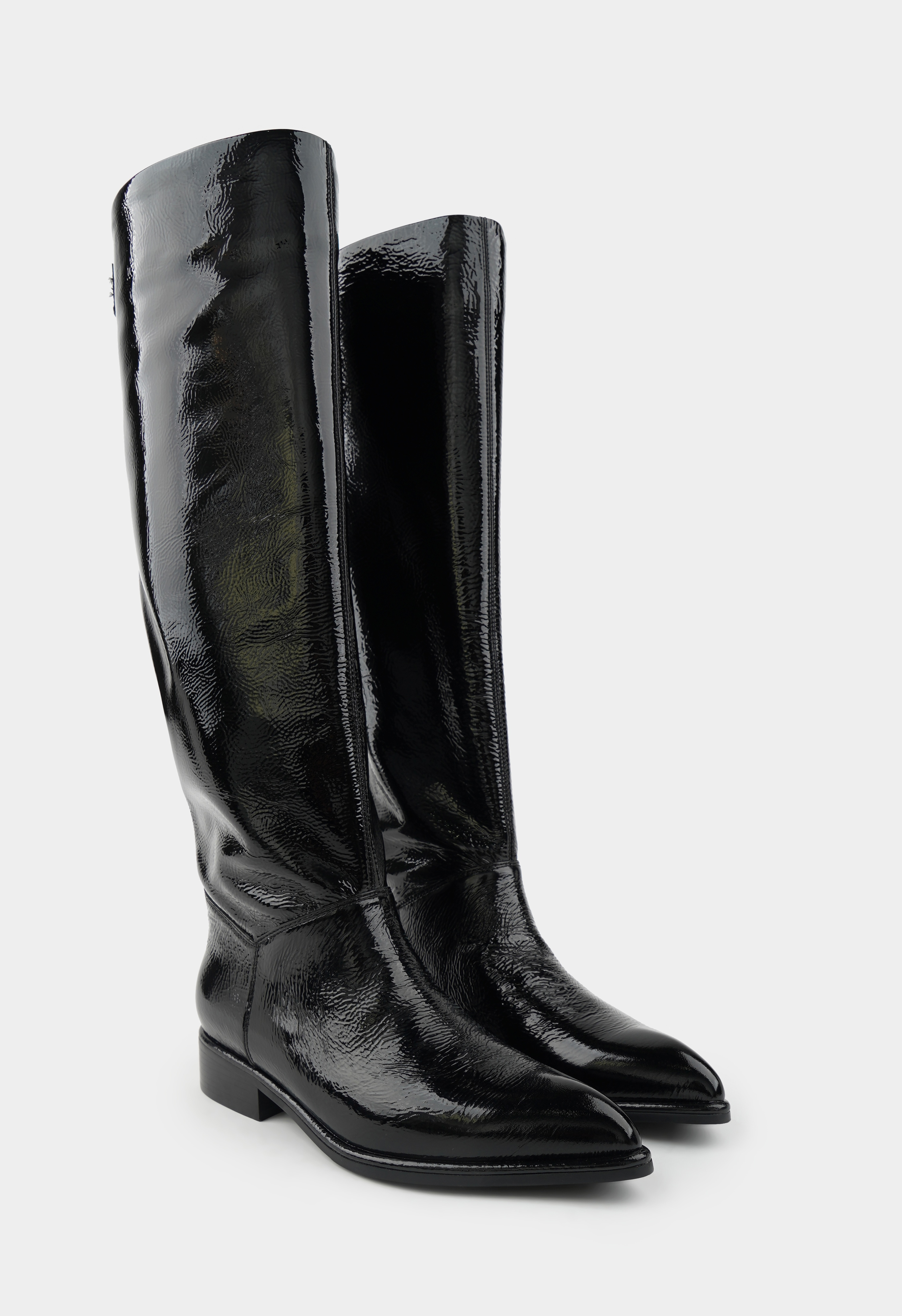 Черные сапоги из натуральной лаковой кожи с подкладкой из байки – это идеальный баланс элегантности и практичности. Заостренный мысок придает образу изящность, а широкий каблук обеспечивает комфорт и стабильность при каждом шаге. Гибкая подошва делает обувь удобной для долгих прогулок. Эта модель легко вписывается в повседневный гардероб и дополнит как классические, так и более смелые образы, подчеркивая актуальность образа.