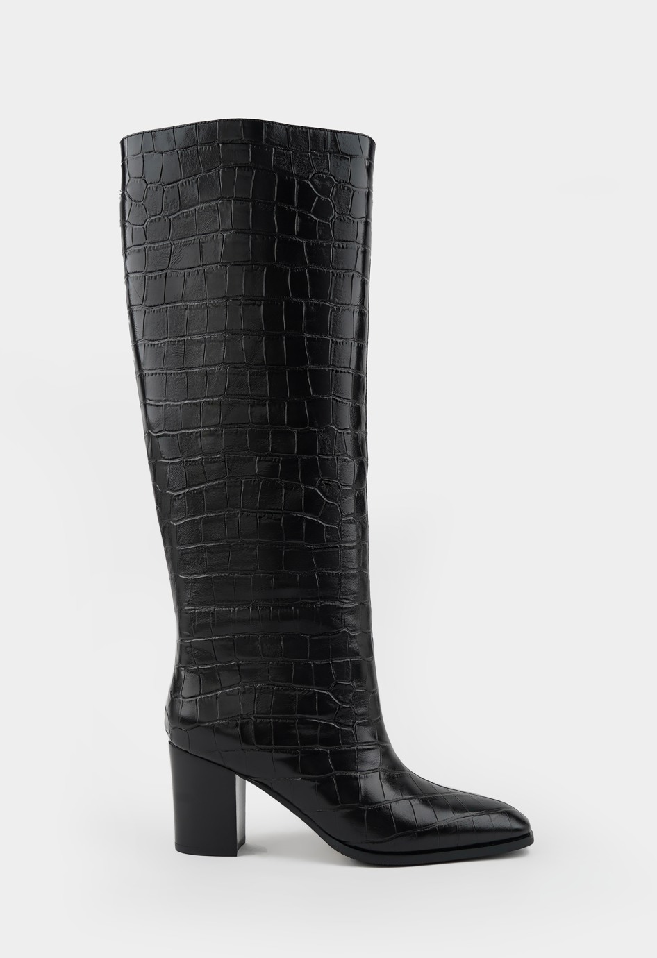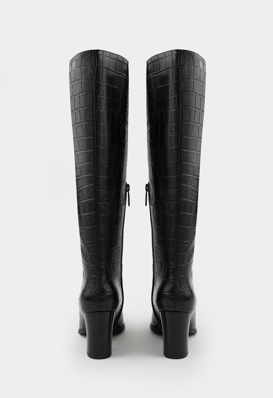 Изысканные сапоги черного цвета с эффектным каблуком-столбиком и элегантным заостренным мыском, выполненные из натуральной кожи. Удобная гибкая подошва и мягкая байковая подкладка обеспечивают комфорт при длительной носке, а стильная фурнитура металлик с боковой молнией добавляет образу современный вид. Универсальная модель станет идеальным дополнением как для делового гардероба, так и для вечернего выхода, прекрасно сочетаясь с любыми женственными образами.