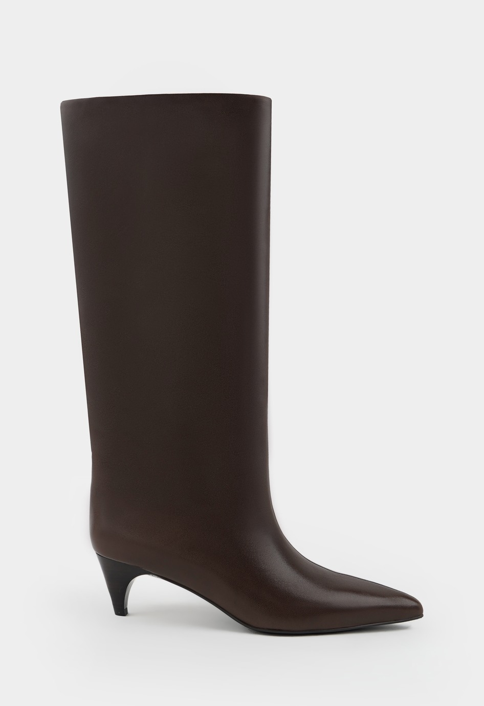 Сапоги коричневого цвета из натуральной кожи – воплощение элегантности и комфорта в одной паре. Мягкая, податливая кожа красиво подчеркивает форму ноги, а подкладка из байки дарит ощущение тепла и уюта в любую погоду. Благодаря гибкой подошве шаг становится легким и естественным, заостренный мысок придает модели изысканность, в то время как каблук kitten heel добавляет утонченный акцент и обеспечивает устойчивость. Эти сапоги легко дополнят как повседневные, так и более нарядные образы, подчеркивая вашу уверенность и безупречный вкус.