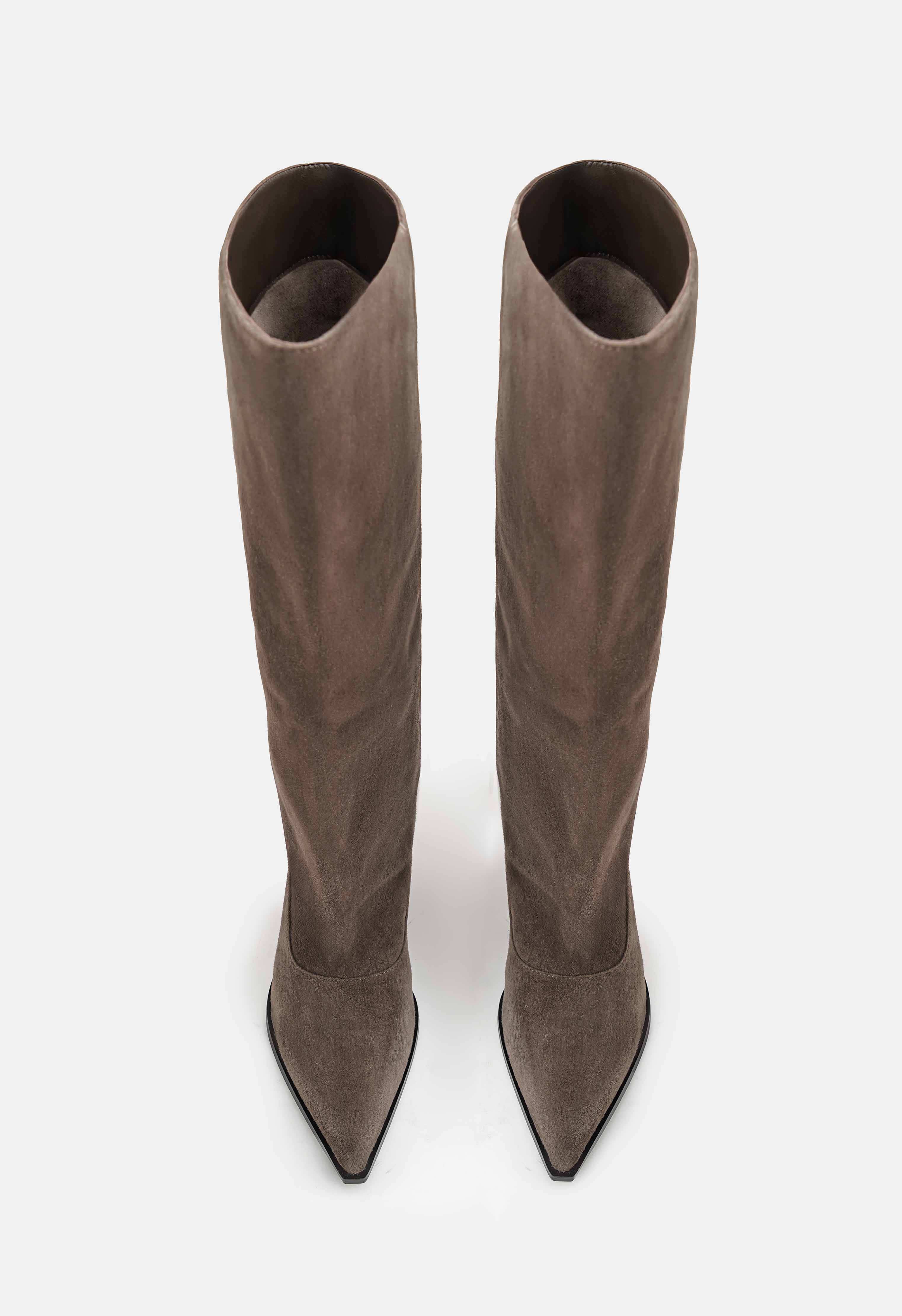 Элегантные сапоги из велюра серого цвета с байкой внутри – сочетание элегантности и комфорта для стильных женщин. Гибкая подошва и каблук-рюмка обеспечивают удобство и уверенность в каждом шаге, а заостренный мысок придает образу изысканность и современный характер. Мягкий внутренний слой сохраняет тепло, делая обувь комфортной в холодные дни. Эти сапоги легко вписываются в повседневные и более нарядные образы, подчеркивая ваш стиль и чувство уверенности в любой ситуации.
