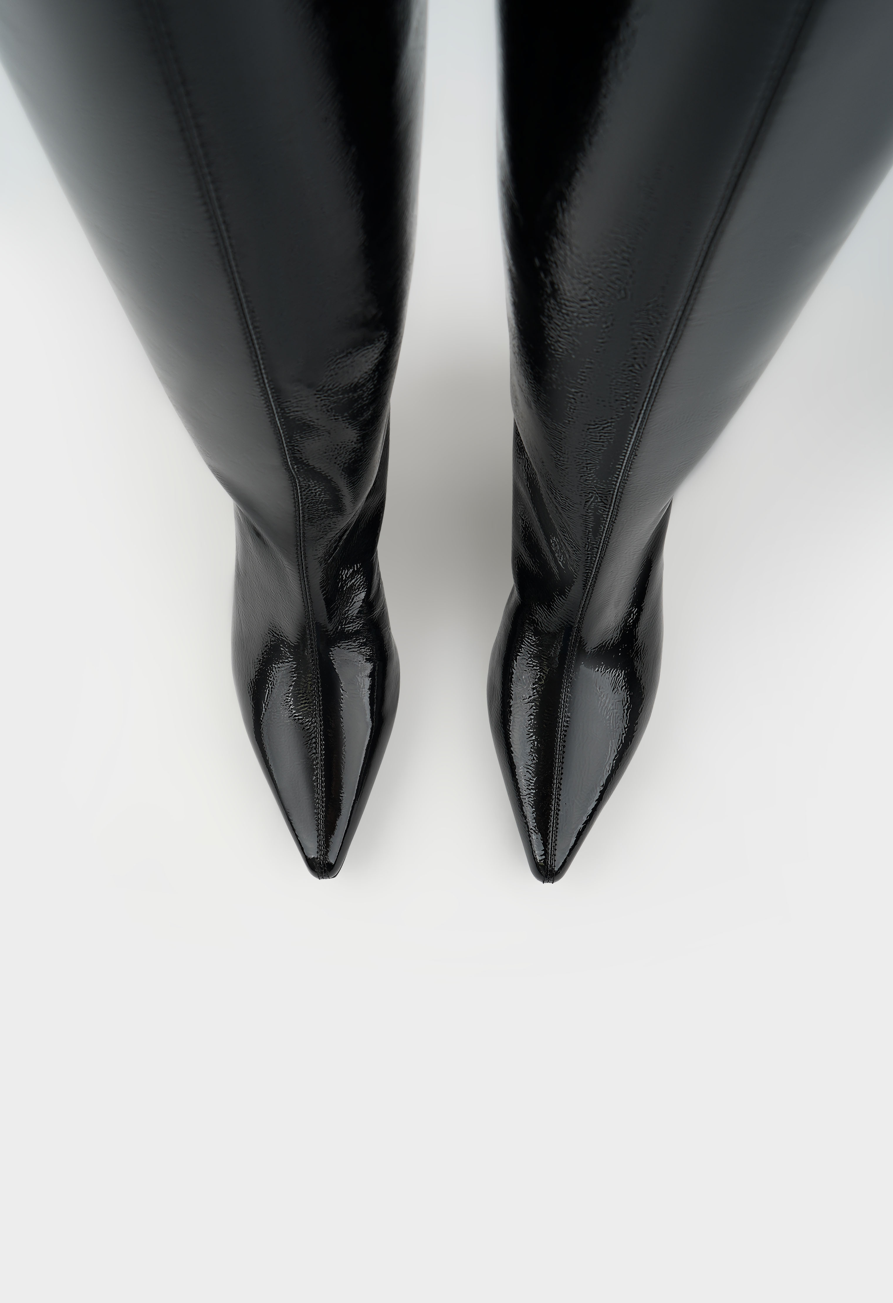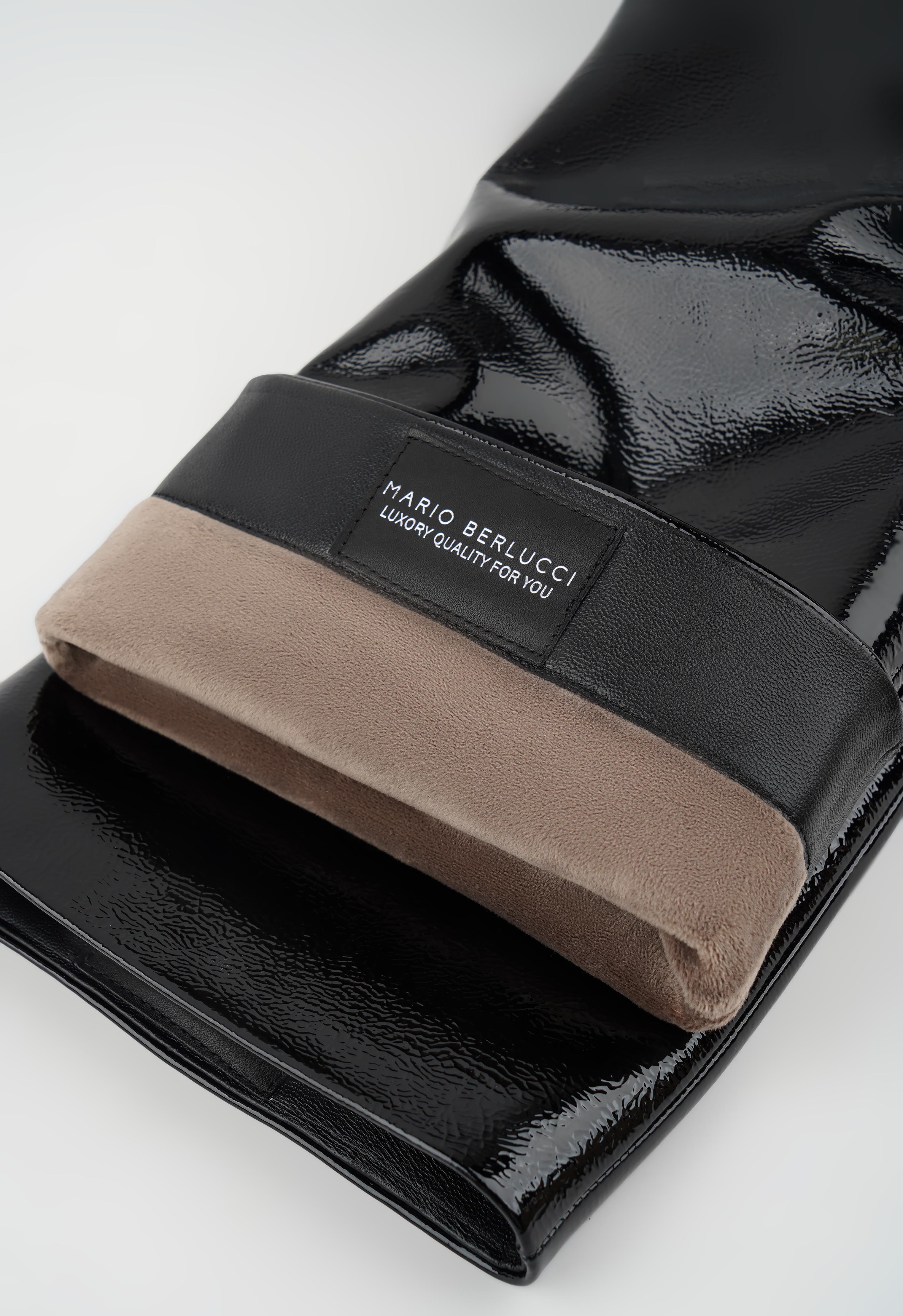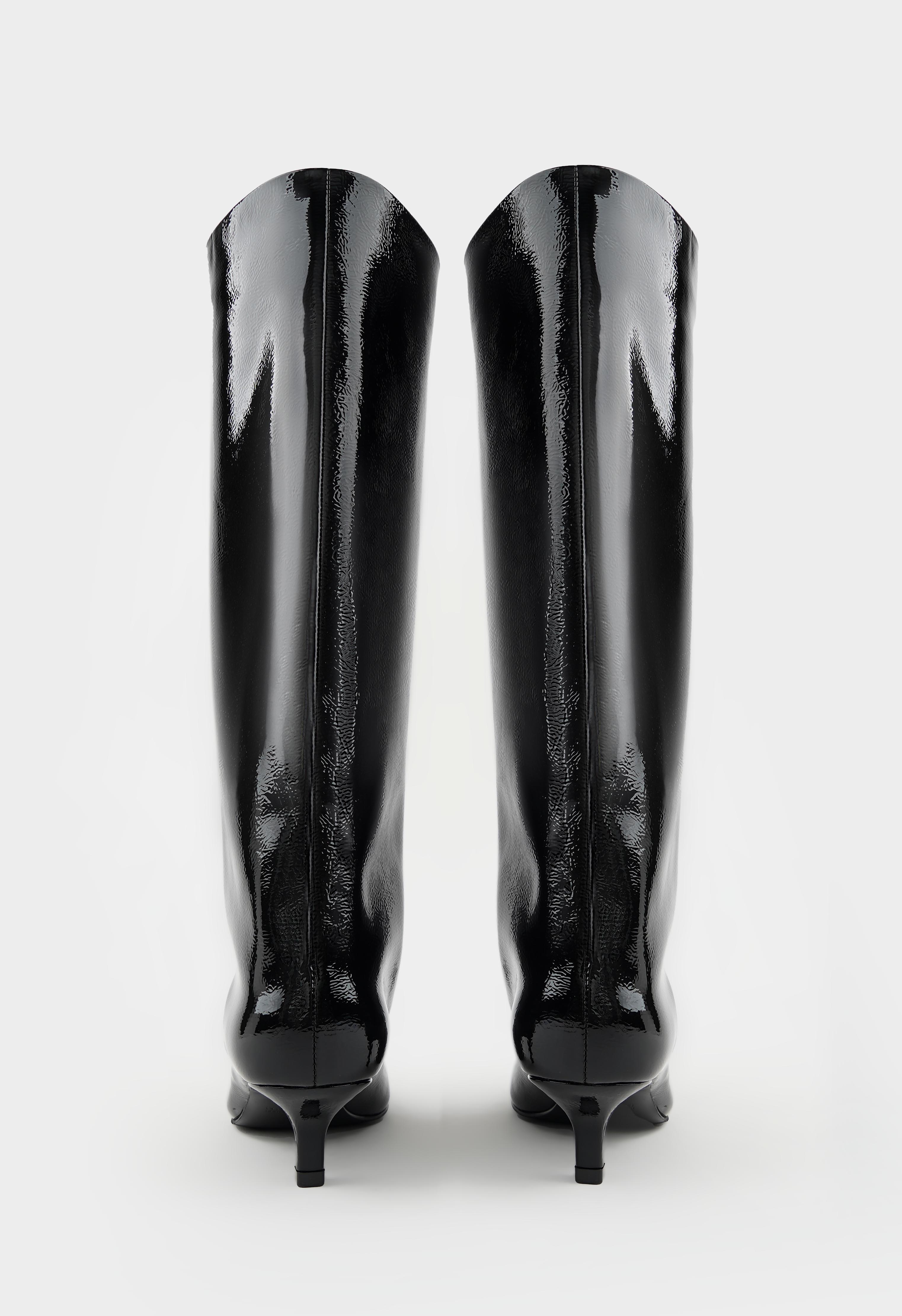 Сапоги из натуральной лаковой кожи черного цвета с подкладкой из байки – идеальный союз элегантности и комфорта. Заостренный мысок и изящный каблук kitten heel создают утонченный силуэт, а гибкая подошва обеспечивает легкость и удобство при каждом шаге. Металлическая фурнитура добавляет стильный современный акцент, делая обувь заметной деталью образа. Эта модель прекрасно дополнит как повседневные, так и более нарядные комплекты, подчеркивая женственность и уверенность в любой ситуации.