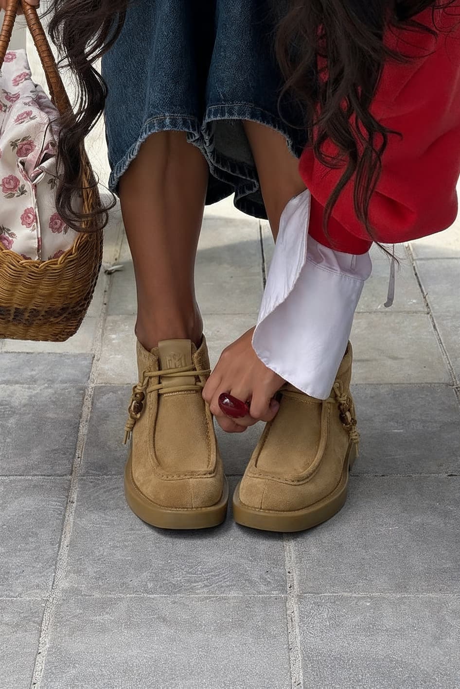 Бежевые ботинки из натуральной замши с теплой байковой подкладкой – идеальный выбор для стильных и уютных осенне-зимних образов. Округлый мысок и массивная платформа придают модели современный характер, а жесткая подошва обеспечивает надежную поддержку и устойчивость на любых поверхностях. Бежевая фурнитура и аккуратная шнуровка добавляют утонченности и позволяют удобно отрегулировать посадку. Эти ботинки прекрасно дополнят повседневные образы с джинсами, брюками или юбками, подчеркивая ваш вкус и заботу о комфорте в любую погоду.