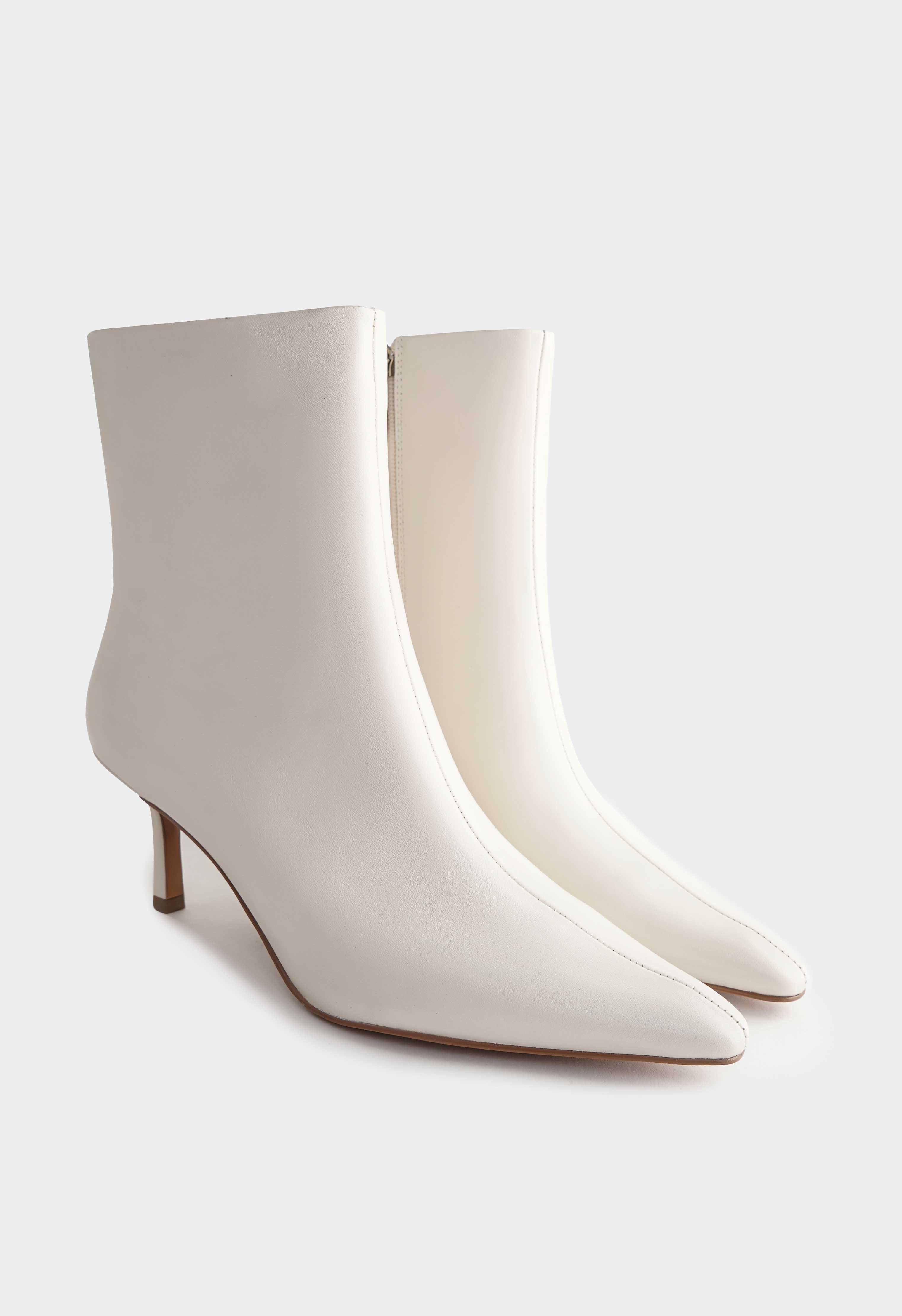 Белые ботильоны из натуральной кожи на молнии – чистая элегантность без лишнего декора, которая всегда выглядит уместно и дорого. Заостренный мысок придает силуэту графичность и визуально вытягивает ногу, а тонкая шпилька добавляет изящной высоты и делает походку более легкой. Гладкая кожа смотрится строго и аккуратно, металлик-фурнитура добавляет сдержанный акцент и подчеркивает качество исполнения. Гибкая подошва поддерживает комфортный шаг и помогает уверенно чувствовать себя в городе.