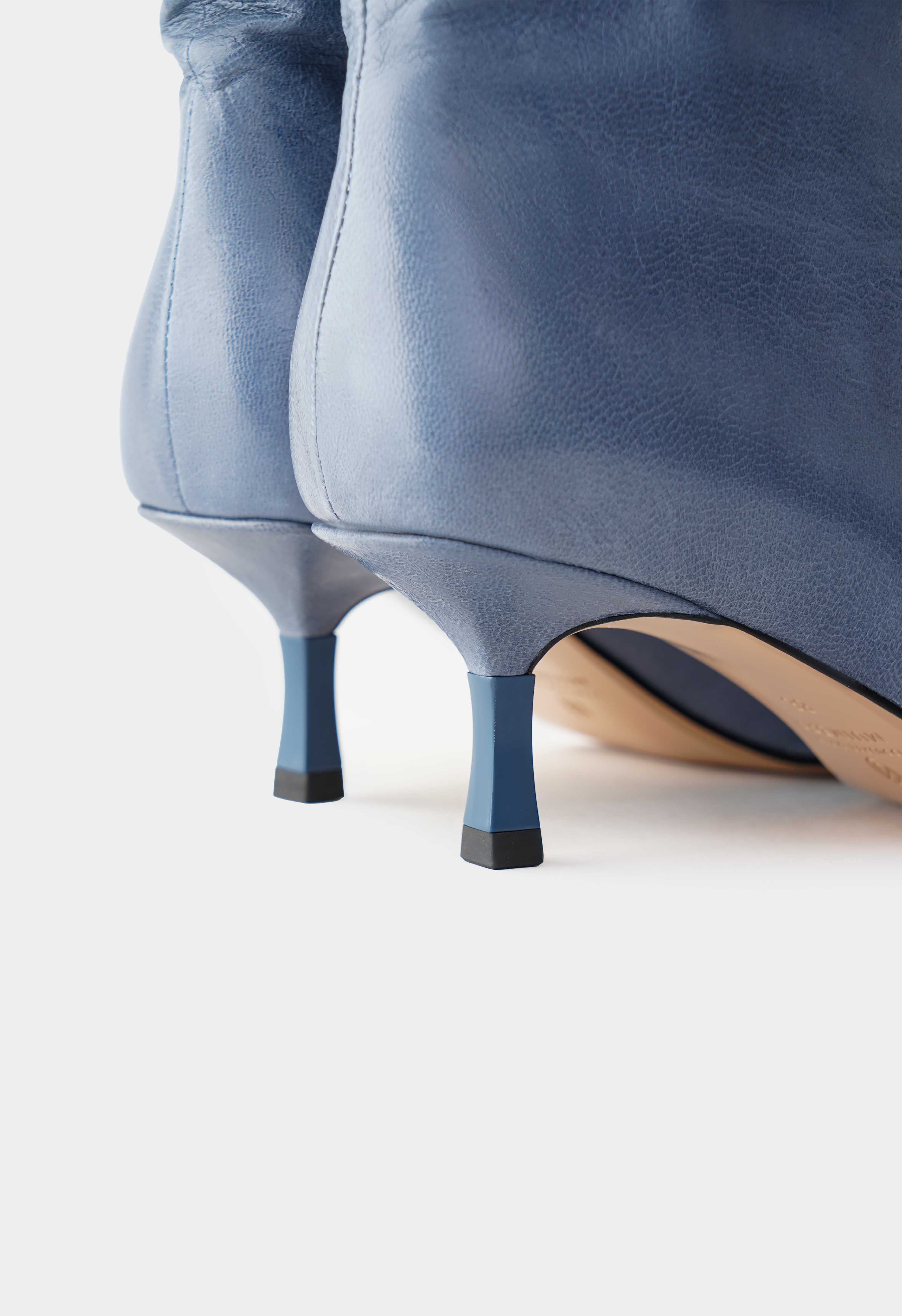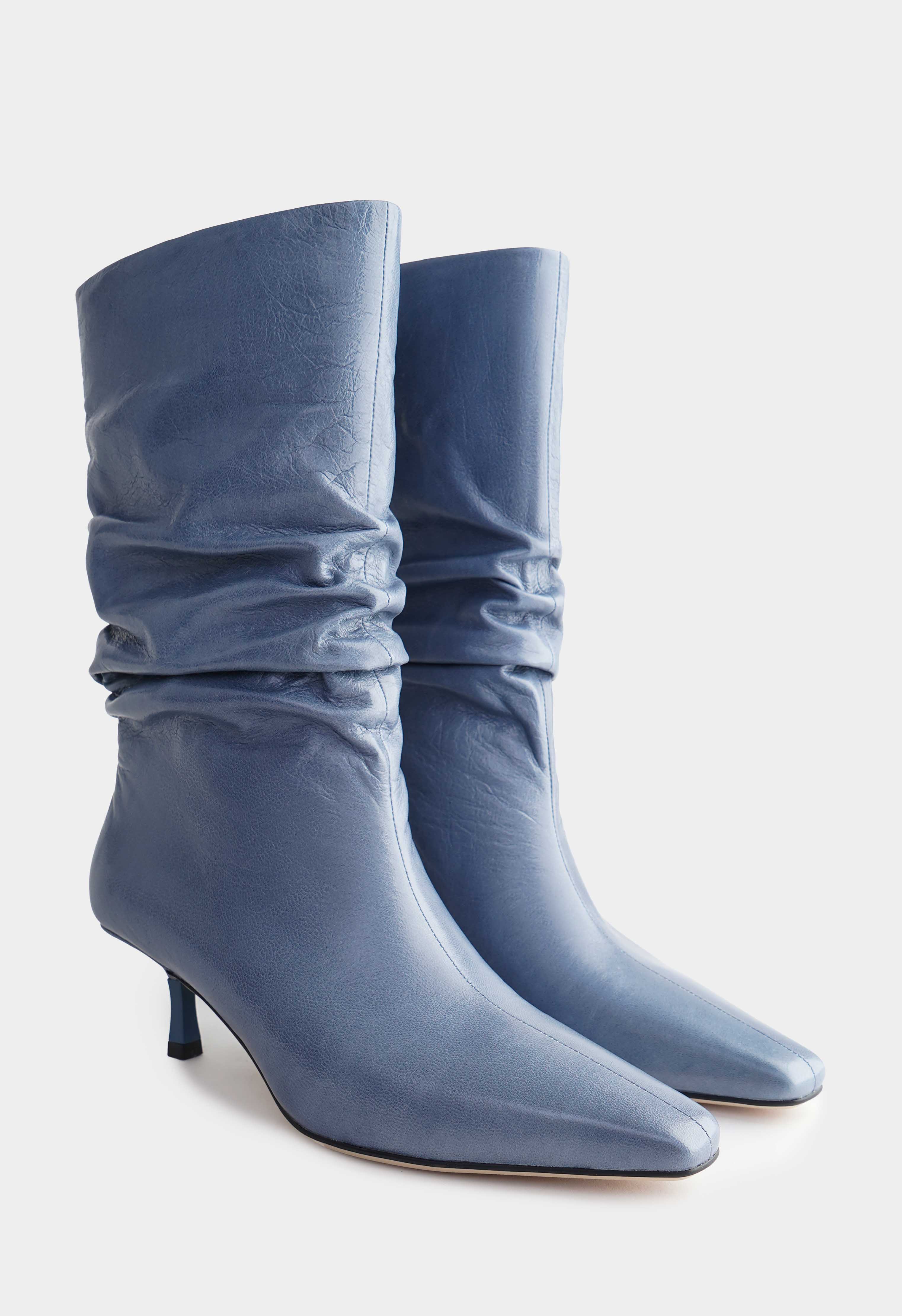 Высокие ботильоны в благородном голубом оттенке – эффектная пара, которая сразу выделяет образ и смотрится очень дорого. Натуральная кожа с мягкими складками красиво ложится по голенищу, в то время как квадратный мысок подчеркивает аккуратный силуэт. Изящная шпилька визуально вытягивает ноги и делает походку более легкой, при этом модель остается комфортной для города. Внутри теплая байка дарит уют в прохладную погоду, а гибкая подошва поддерживает мягкий шаг и удобство в течение дня.
