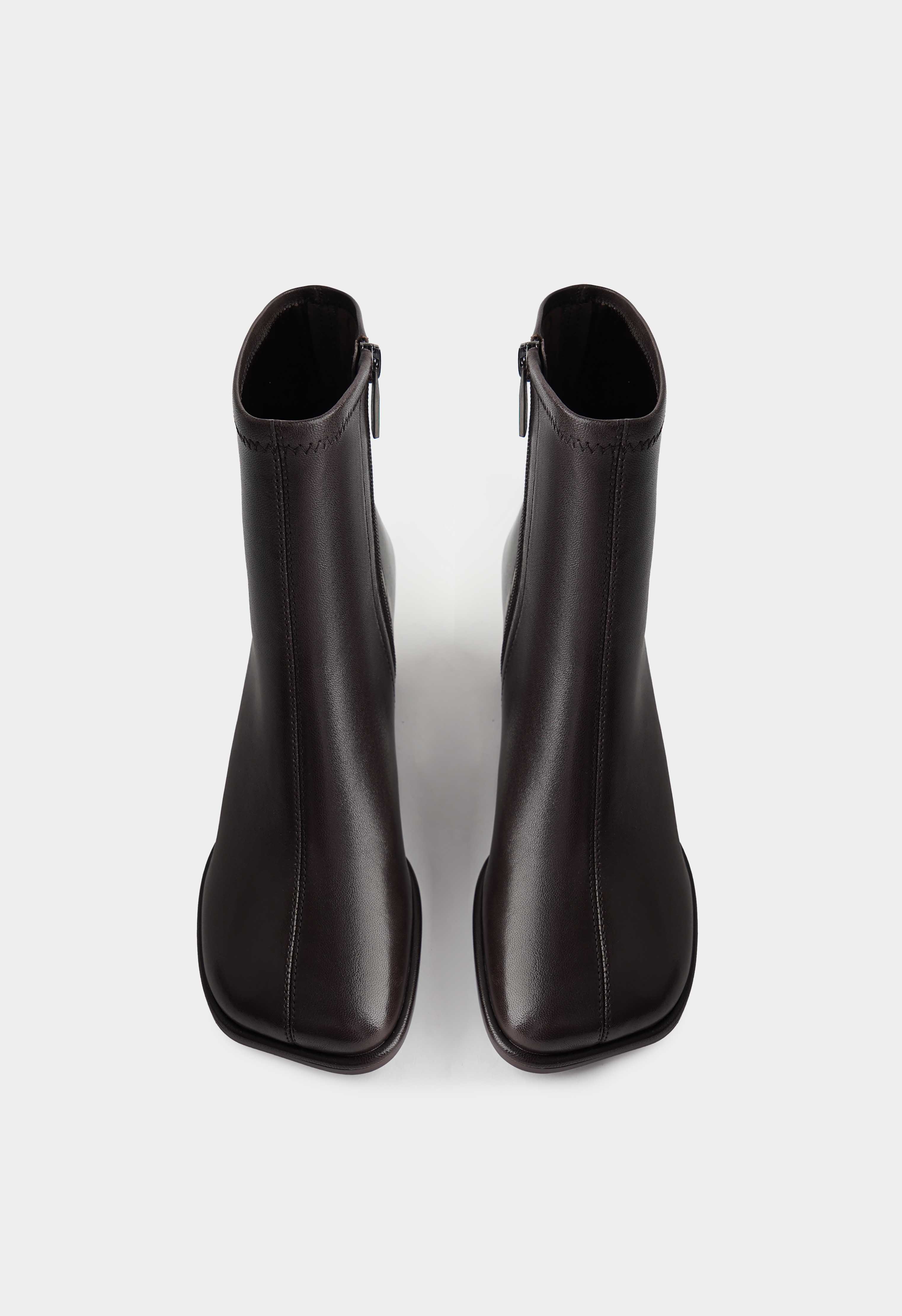 Коричневые ботильоны из натуральной кожи – аккуратная пара с чистым силуэтом и благородным оттенком, которая легко вписывается в базовый гардероб. Квадратный мысок добавляет современную геометрию и делает посадку более комфортной, а устойчивый каблук-столбик с выразительной фактурой смотрится солидно и дает уверенную опору. Молния сбоку обеспечивает удобное надевание, металлик-фурнитура добавляет сдержанный акцент и подчеркивает качество исполнения. Жесткая подошва держит форму и поддерживает стабильный шаг.