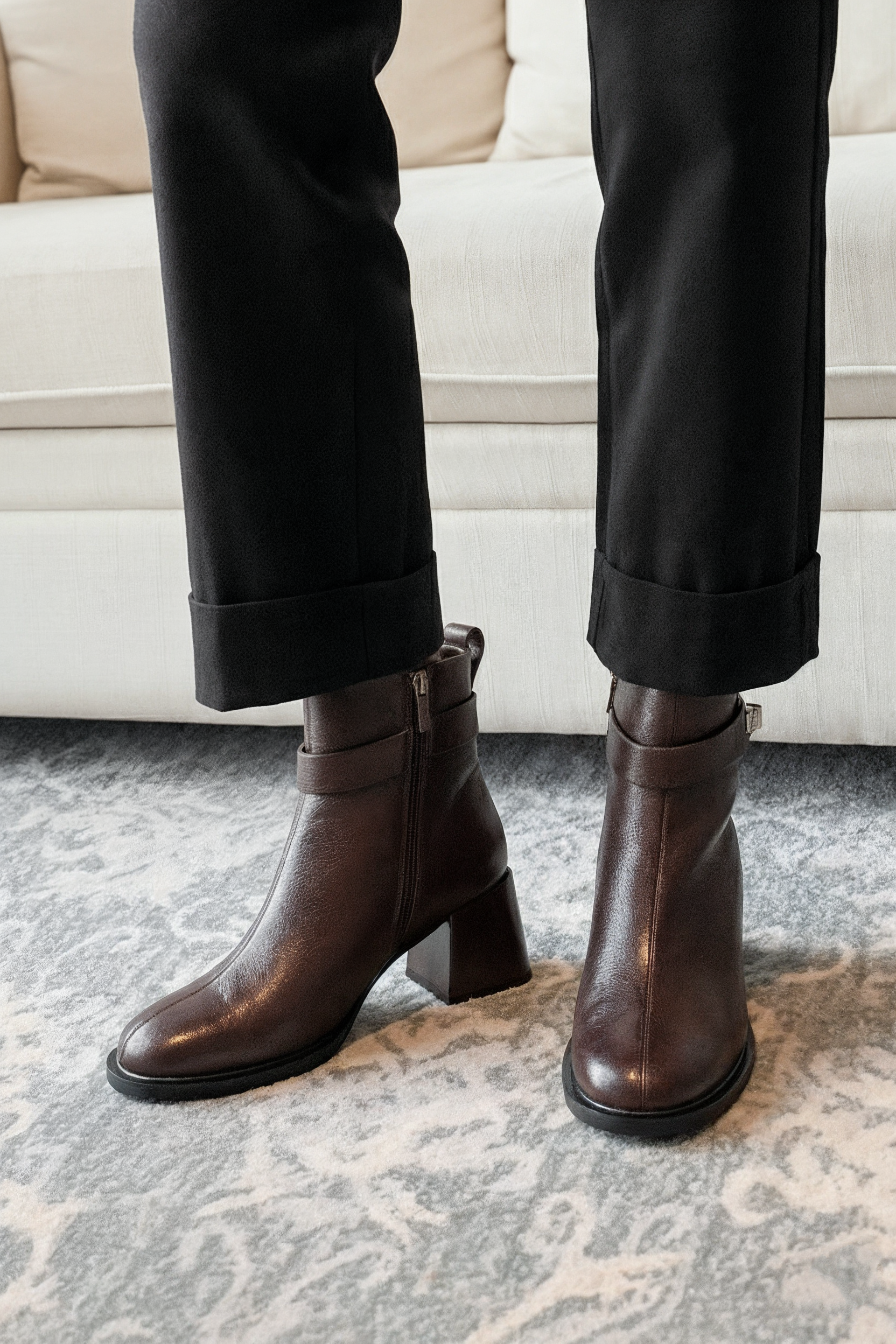 Коричневые ботильоны из натуральной кожи с подкладкой из мягкого натурального меха – элегантная и удобная модель для холодного сезона. Гибкая подошва и трапециевидный каблук обеспечивают легкость и уверенность при каждом шаге, а округлый мысок делает обувь практичной для повседневной носки. Молния облегчает обувание, в то время как серебряная фурнитура добавляет современный акцент, подчеркивая стиль и утонченность модели. Эти ботильоны станут универсальной парой, гармонично сочетая комфорт, практичность и элегантность в любом образе.