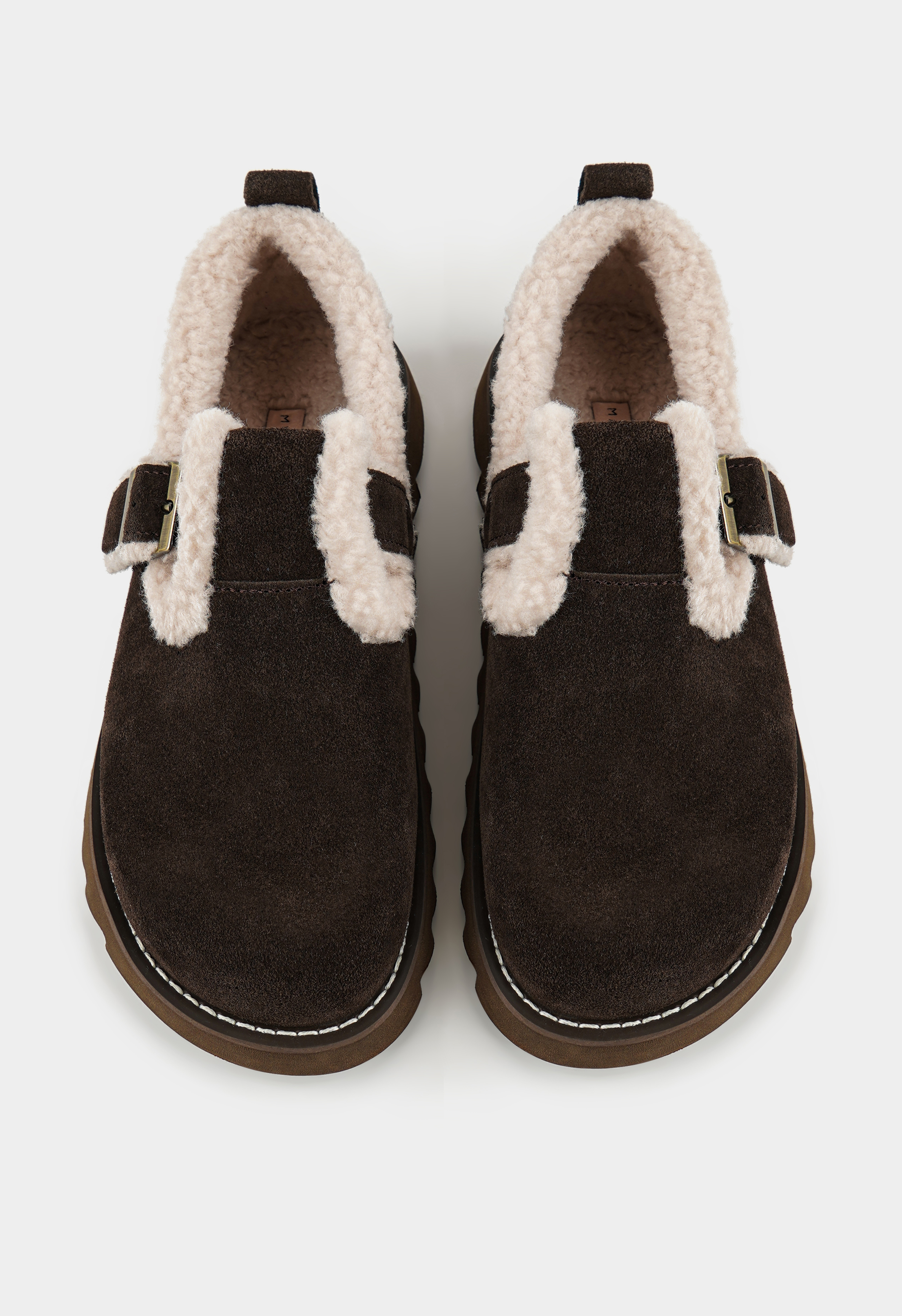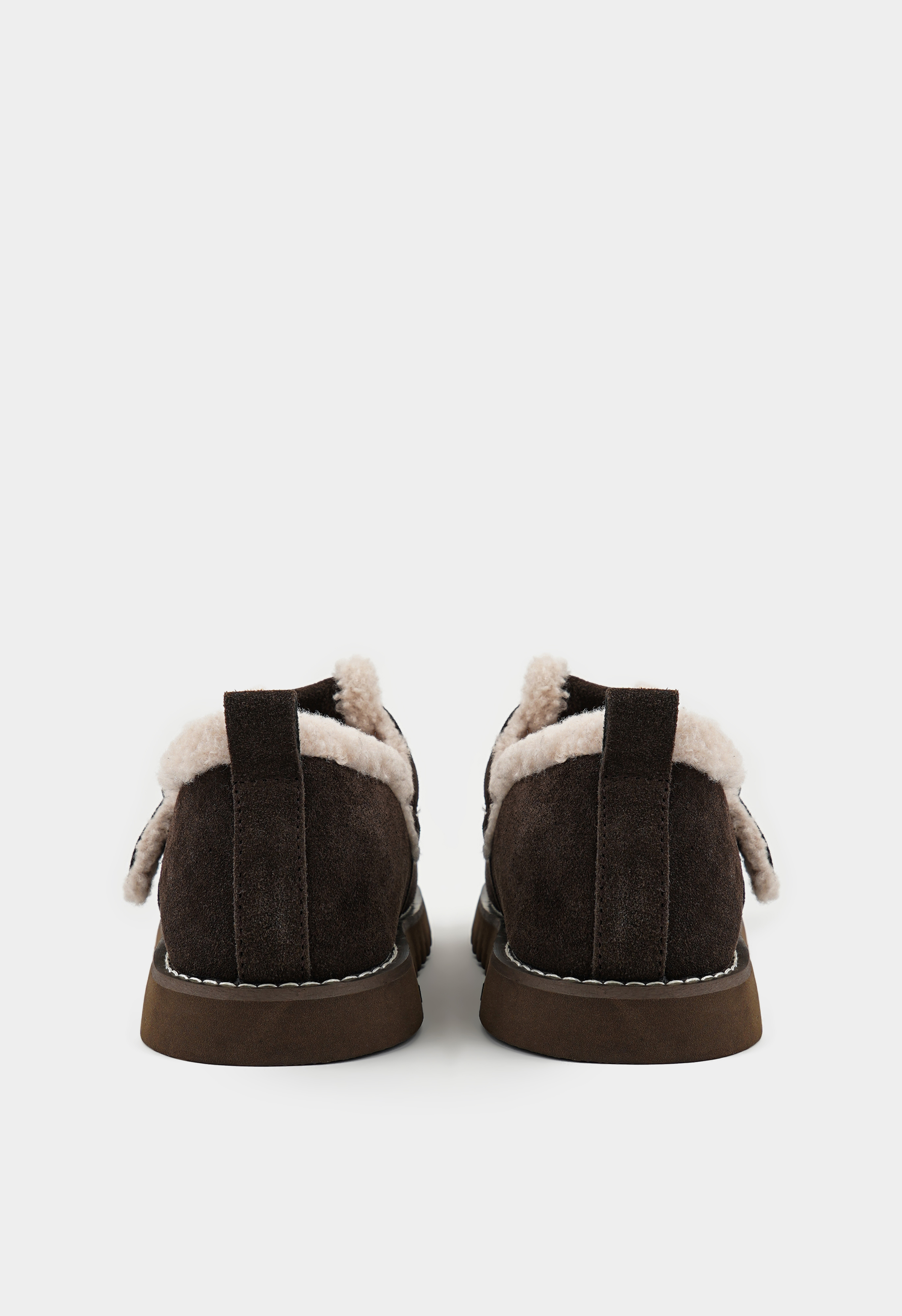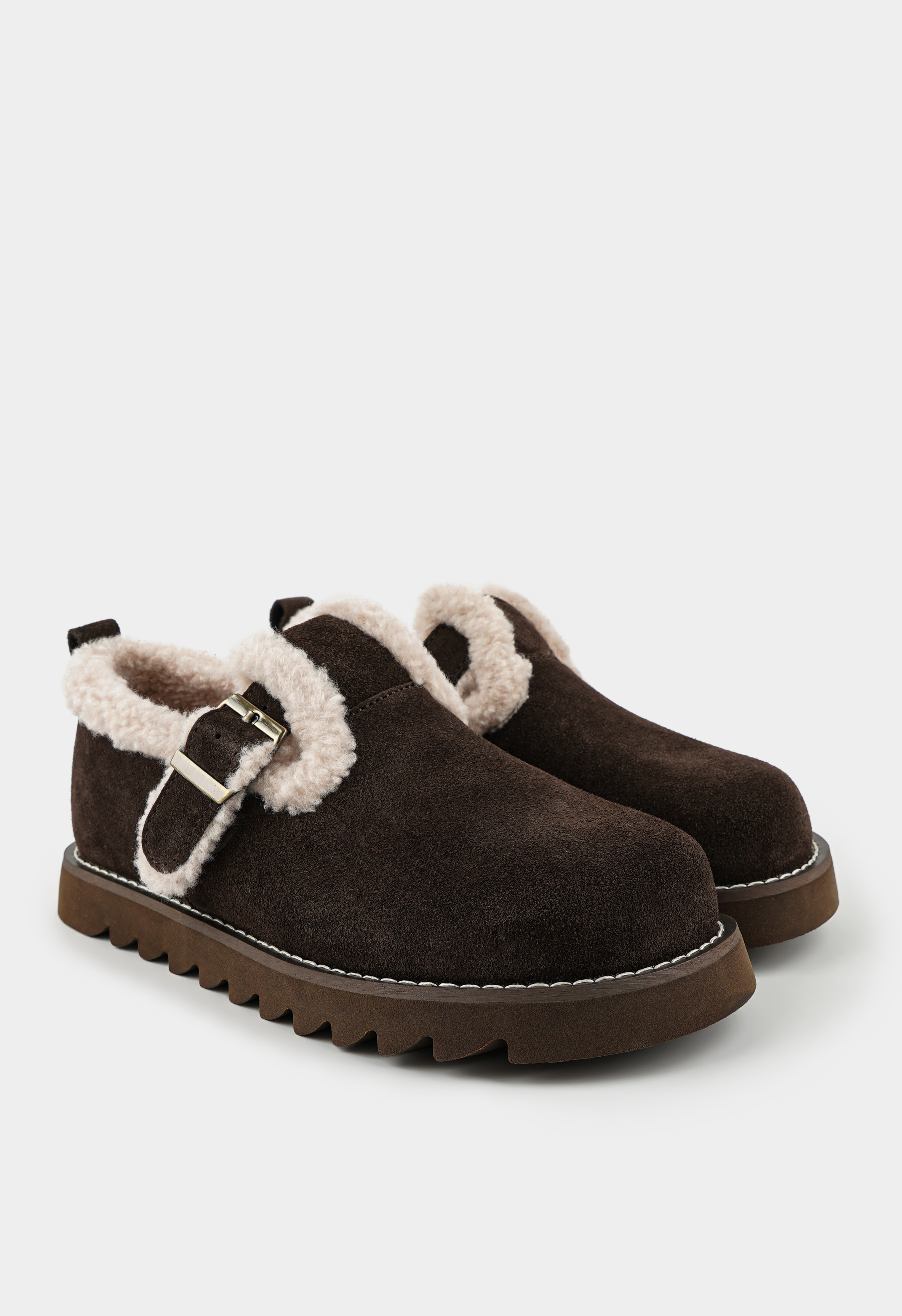 Женские полуботинки коричневого цвета – стильное сочетание элегантности и комфорта, созданное для тех, кто ценит качество в каждой детали. Верх выполнен из мягкой натуральной замши, которая придает обуви благородный вид и приятную фактуру, а внутренняя отделка из натуральной шерсти дарит уют и тепло в прохладные дни. Гибкая подошва обеспечивает легкость шага, округлый мысок делает посадку максимально комфортной, в то время как изящная пряжка в цвете металлик добавляет утонченный блеск. Устойчивая платформа визуально удлиняет силуэт и делает модель идеальной для активного ритма жизни.