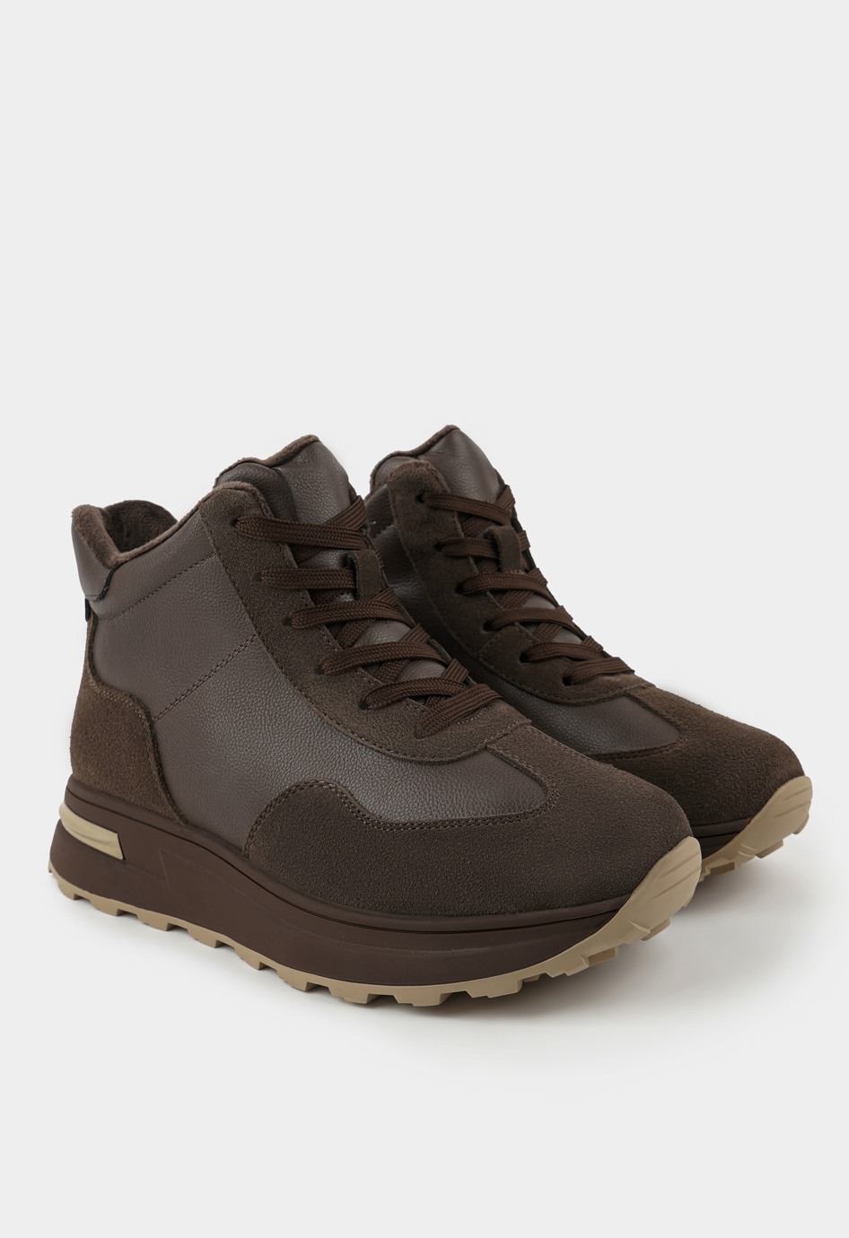 Комфортные ботинки в коричневом цвете созданы для тех, кто хочет чувствовать уверенность и уют в любую погоду. Сочетание натуральной кожи и замши придает модели выразительный, фактурный вид и повышает износостойкость, а внутренняя отделка из шерсти обеспечивает мягкость и приятное тепло. Жесткая подошва гарантирует устойчивость, округлый мысок делает обувь удобной даже при длительной ходьбе, в то время как сочетание молнии и шнуровки позволяет легко подгонять посадку. Эффектная фурнитура в цвете металлик добавляет современный акцент, платформа делает шаг легким и придает силуэту стильную динамику.