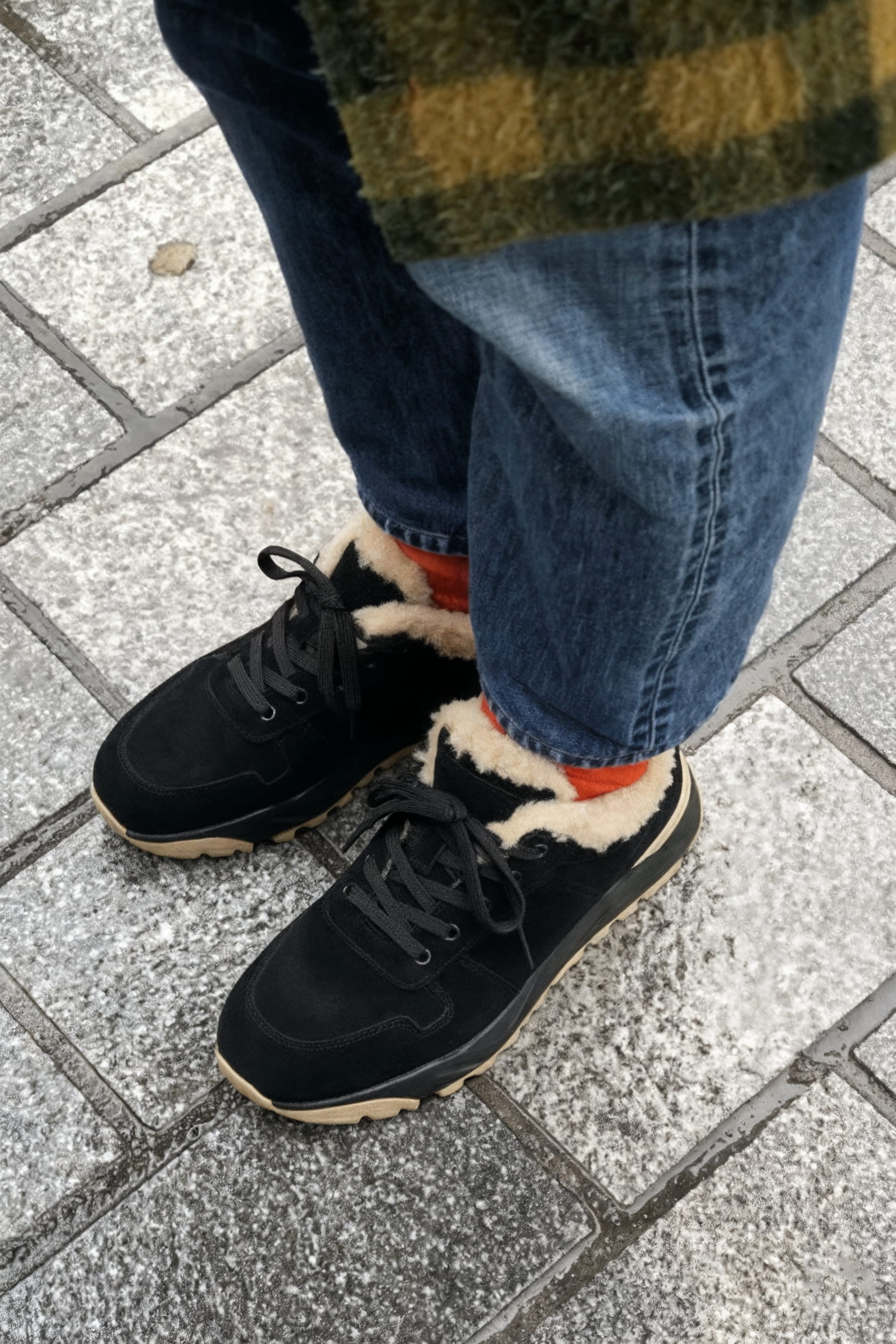 Черные кроссовки из натуральной замши с теплой подкладкой из натуральной шерсти – это сочетание спортивного стиля и зимнего комфорта. Жесткая подошва и устойчивая платформа обеспечивают надежность и поддержку, а округлый мысок и классическая шнуровка делают модель удобной для долгих прогулок и активных дней. Металлическая фурнитура добавляет современный акцент и подчеркивает стильный характер обуви. Эти кроссовки станут универсальной парой на каждый день – они одинаково хорошо смотрятся с джинсами, спортивным образом или уютным зимним пальто, создавая актуальный и уверенный образ.