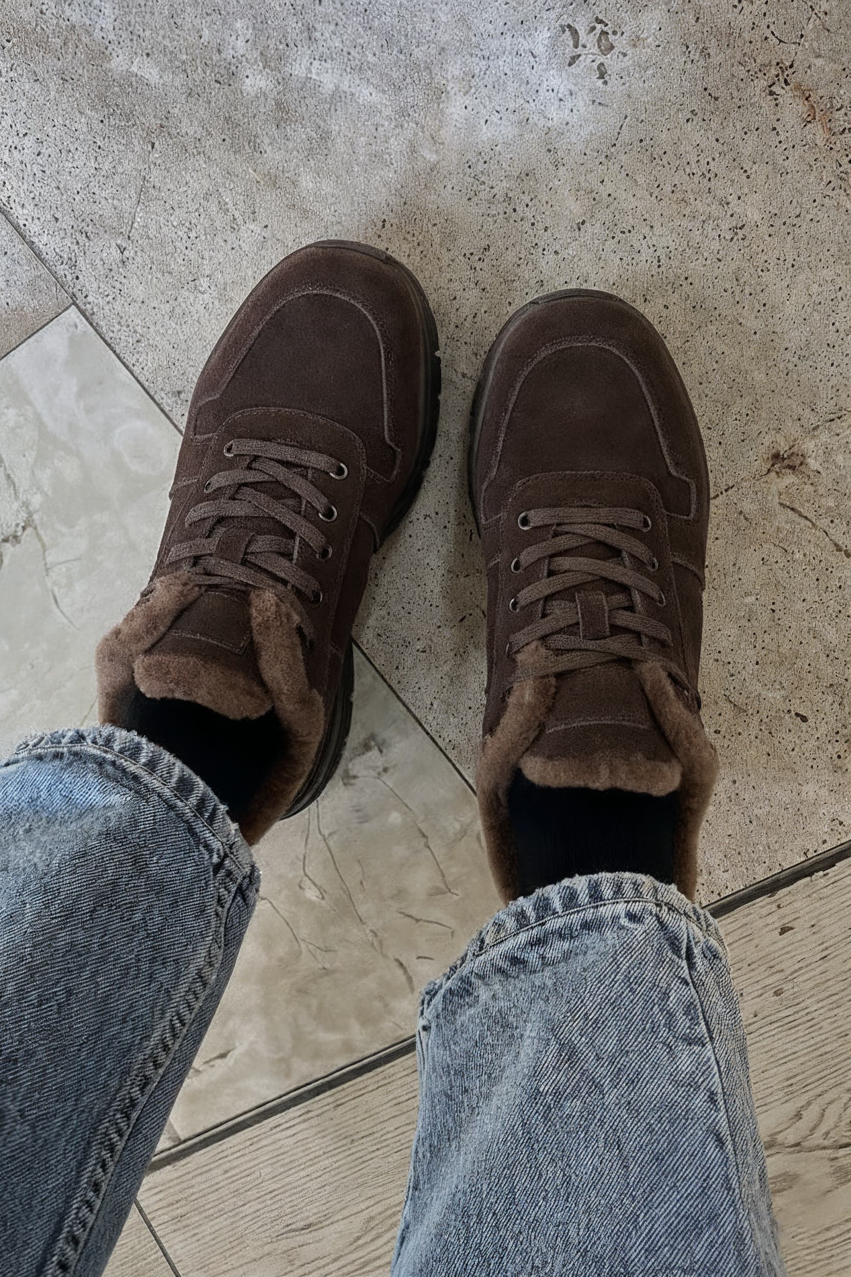 Эти кроссовки из натуральной замши в коричневом цвете – идеальный союз стиля и комфорта. Мягкая внутренняя отделка из натуральной шерсти заботится о ваших ногах, а жесткая подошва и устойчивая платформа обеспечивают уверенную походку каждый день. Округлый мысок и аккуратная шнуровка с металлической фурнитурой придают модели современный и утончённый вид, делая её универсальной для прогулок, работы или встреч с друзьями. Эта модель не только удобна, но и легко вписывается в любой образ, добавляя нотку элегантности и уверенности вашей повседневной жизни.