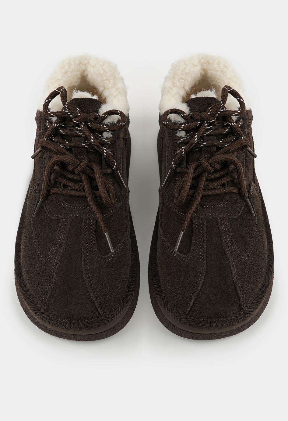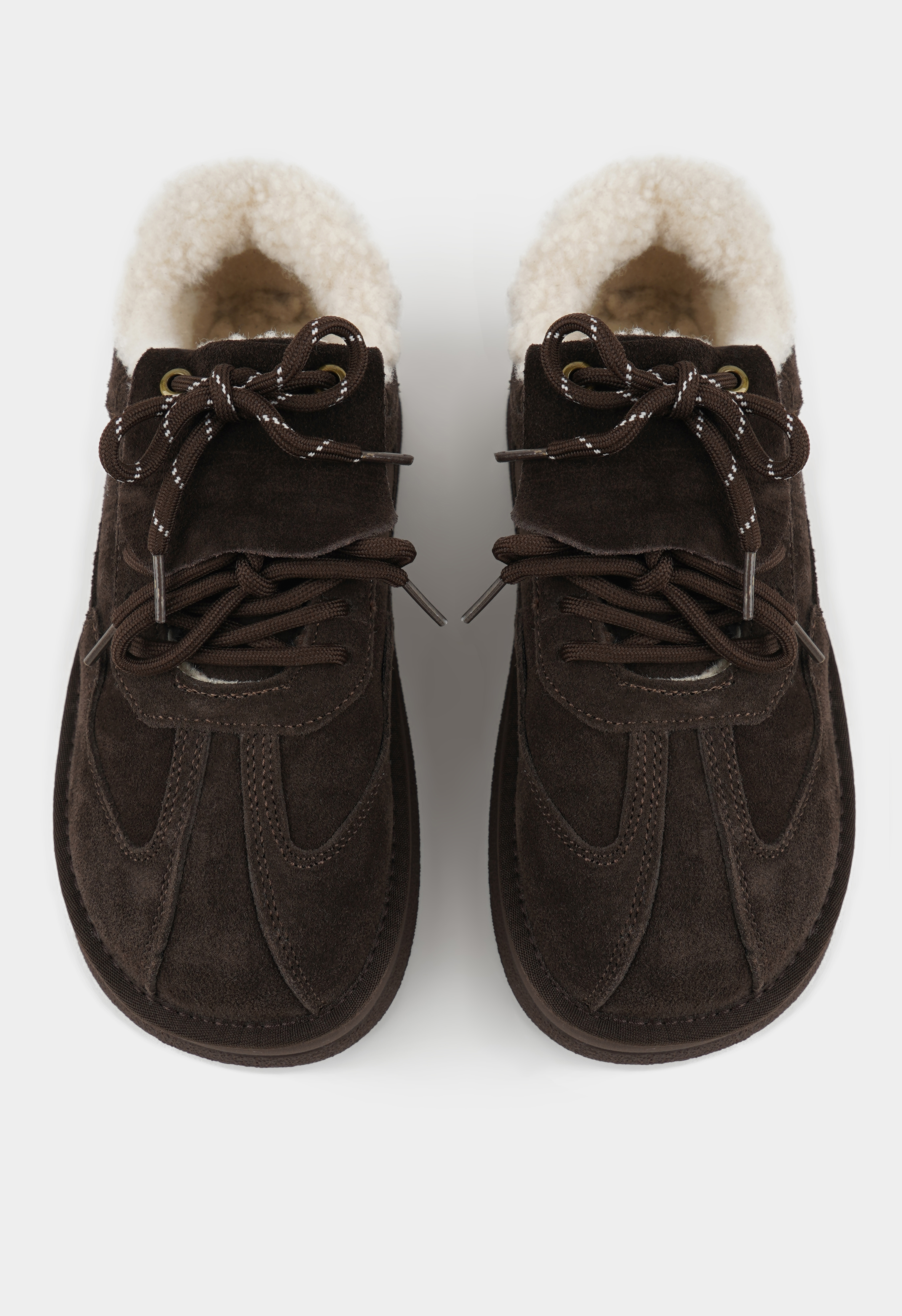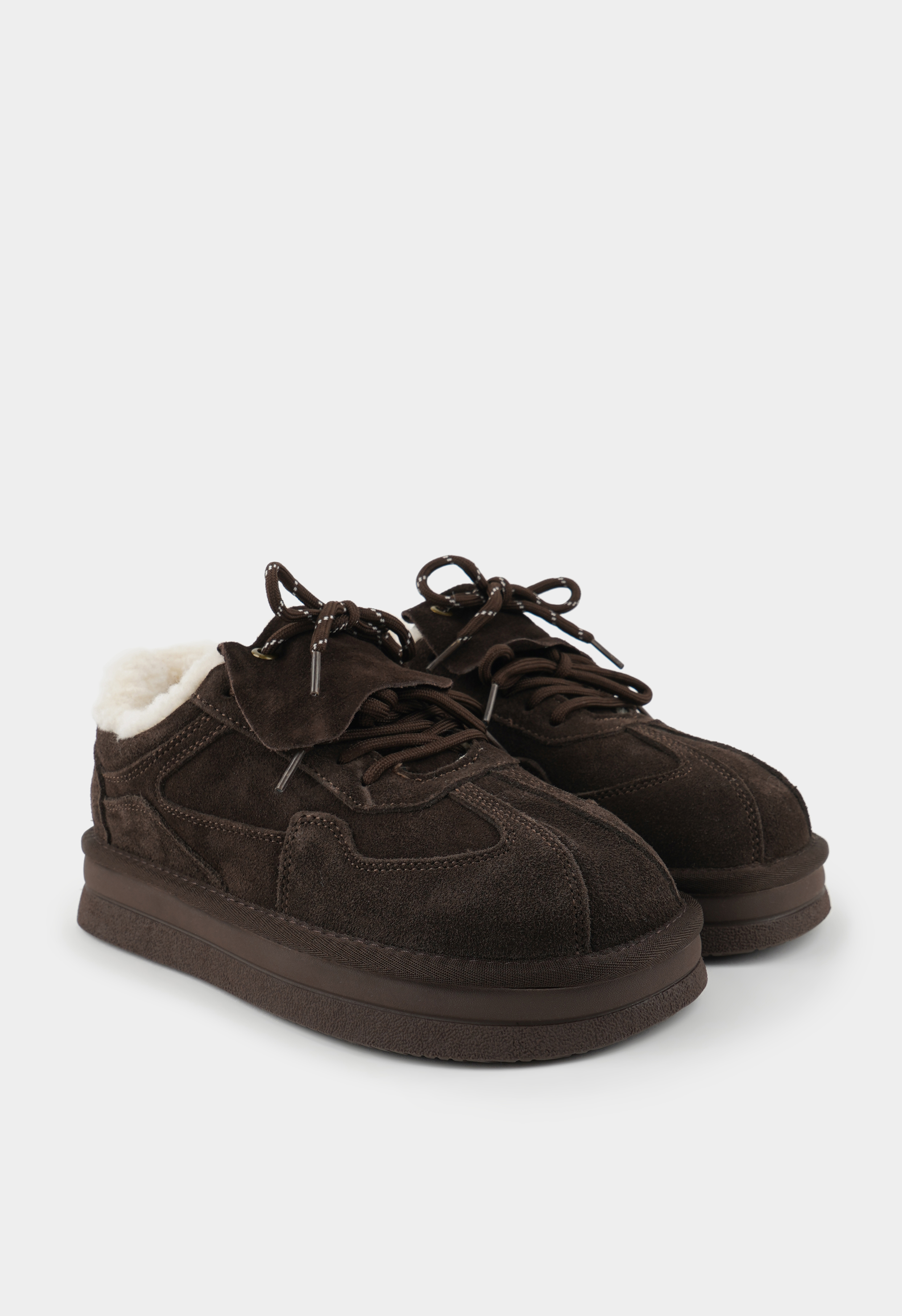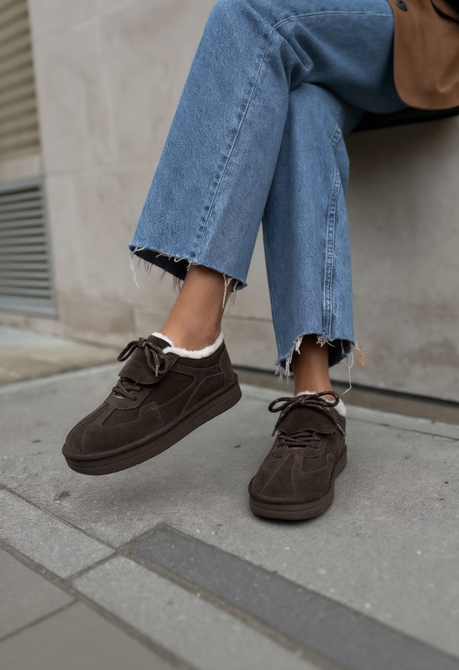 Актуальные полуботинки коричневого цвета станут стильным акцентом вашего зимнего гардероба, сочетая практичность и элегантность. Модель выполнена из мягкой натуральной замши, внутренняя отделка из натуральной шерсти обеспечивает комфорт и тепло в любую погоду. Жесткая подошва гарантирует устойчивость на разных поверхностях, округлый мысок делает обувь удобной для повседневной носки, а бронзовая фурнитура и аккуратная шнуровка добавляют утонченные детали в дизайн. Благодаря платформе шаг остается уверенным и легким, а образ – современным и гармоничным.