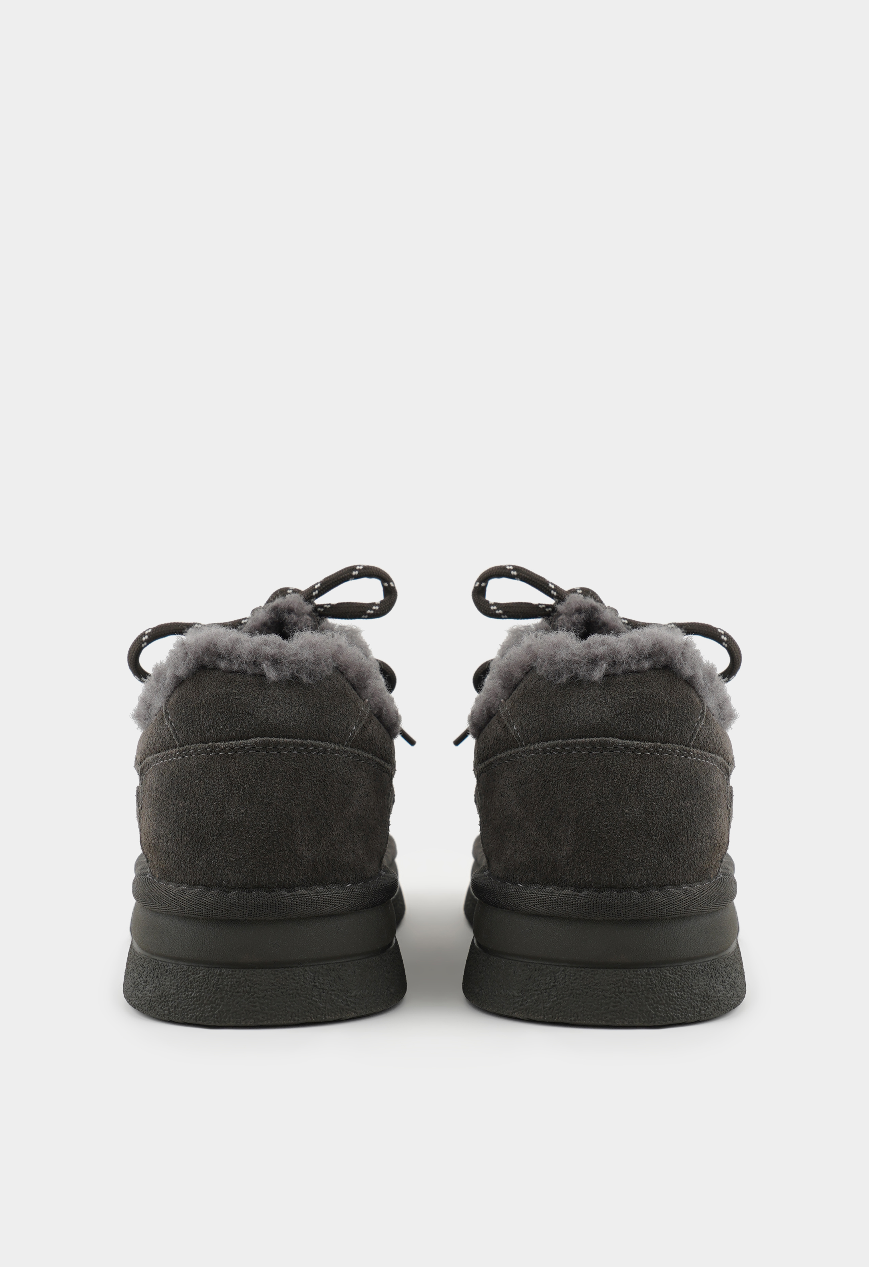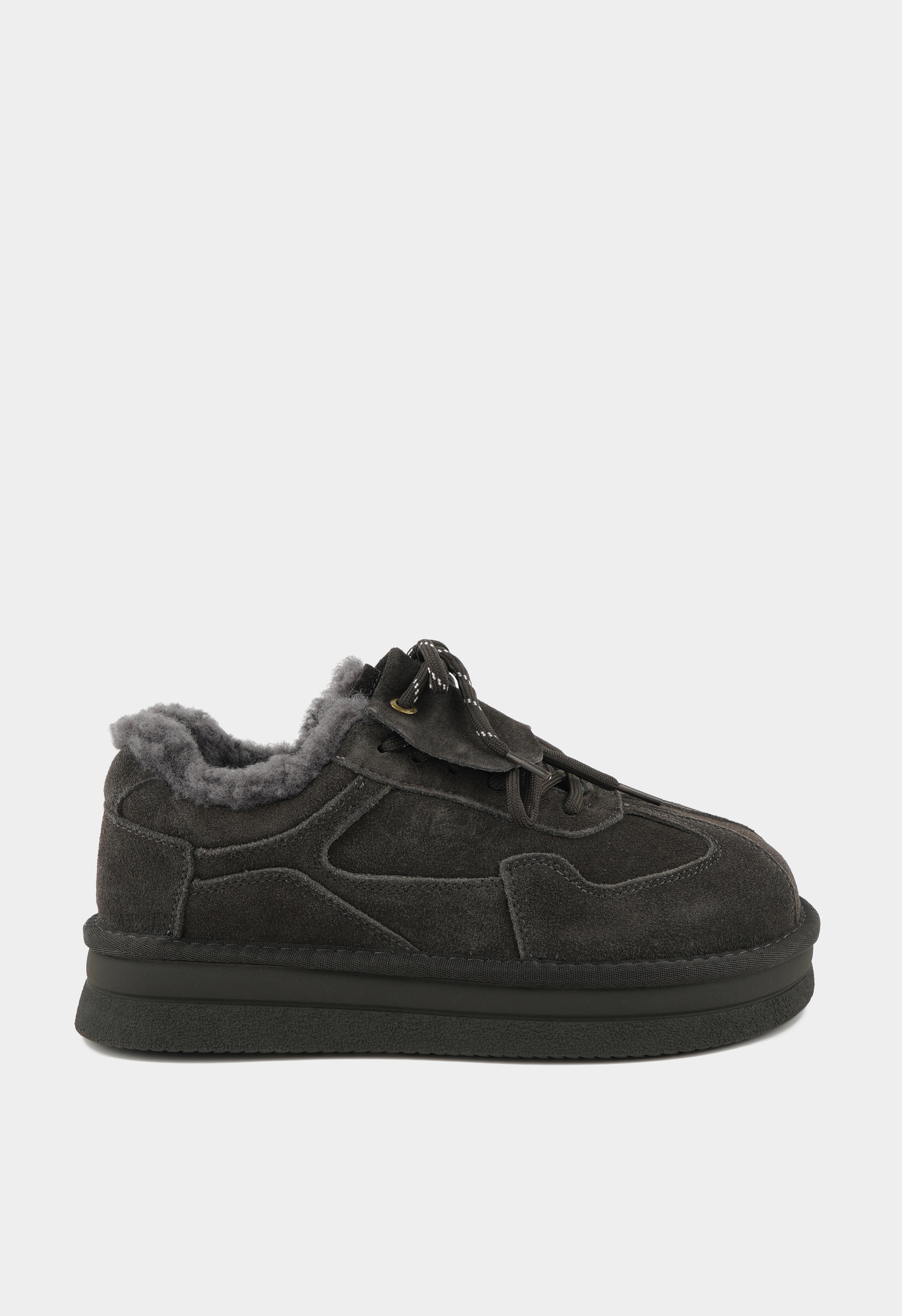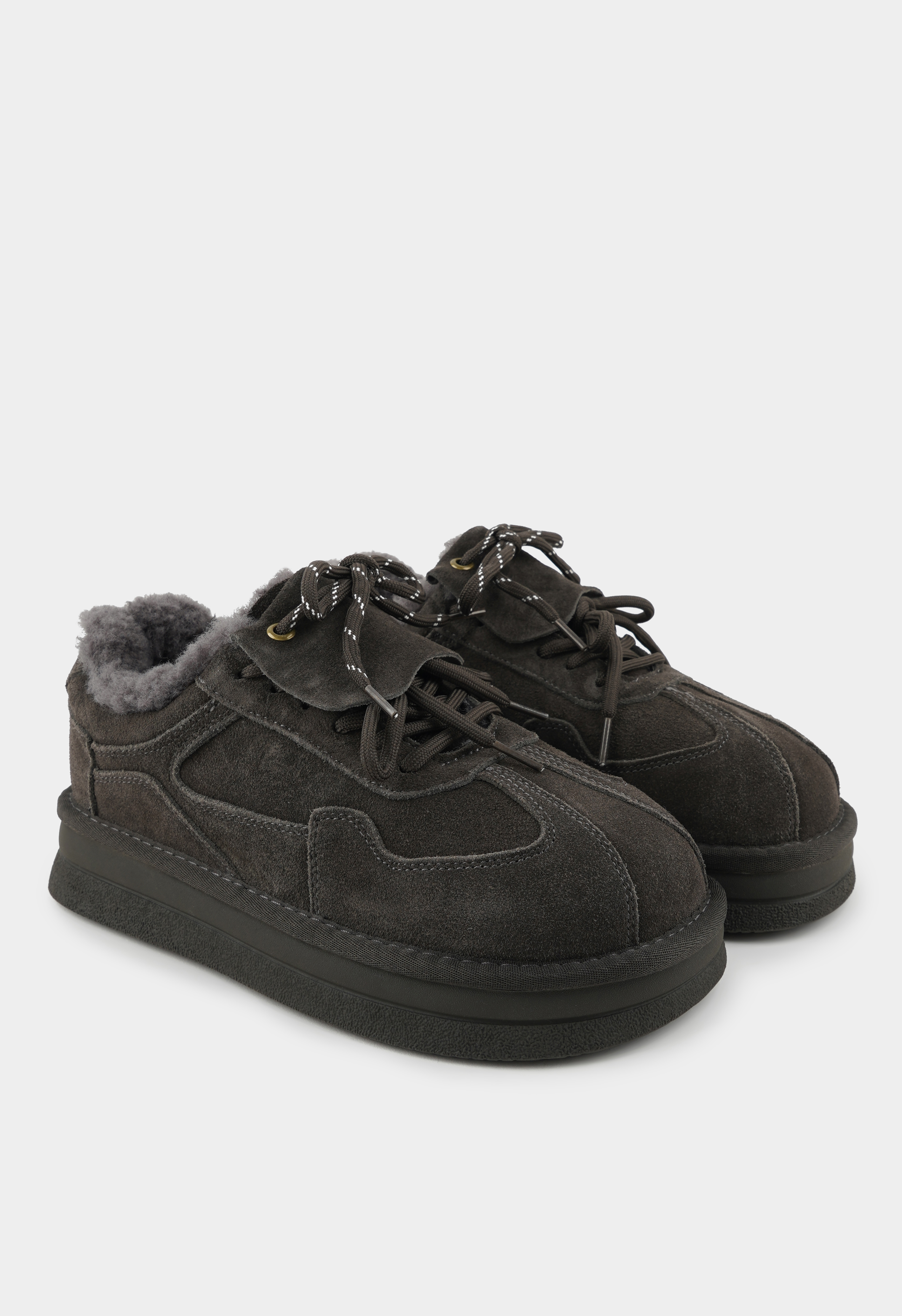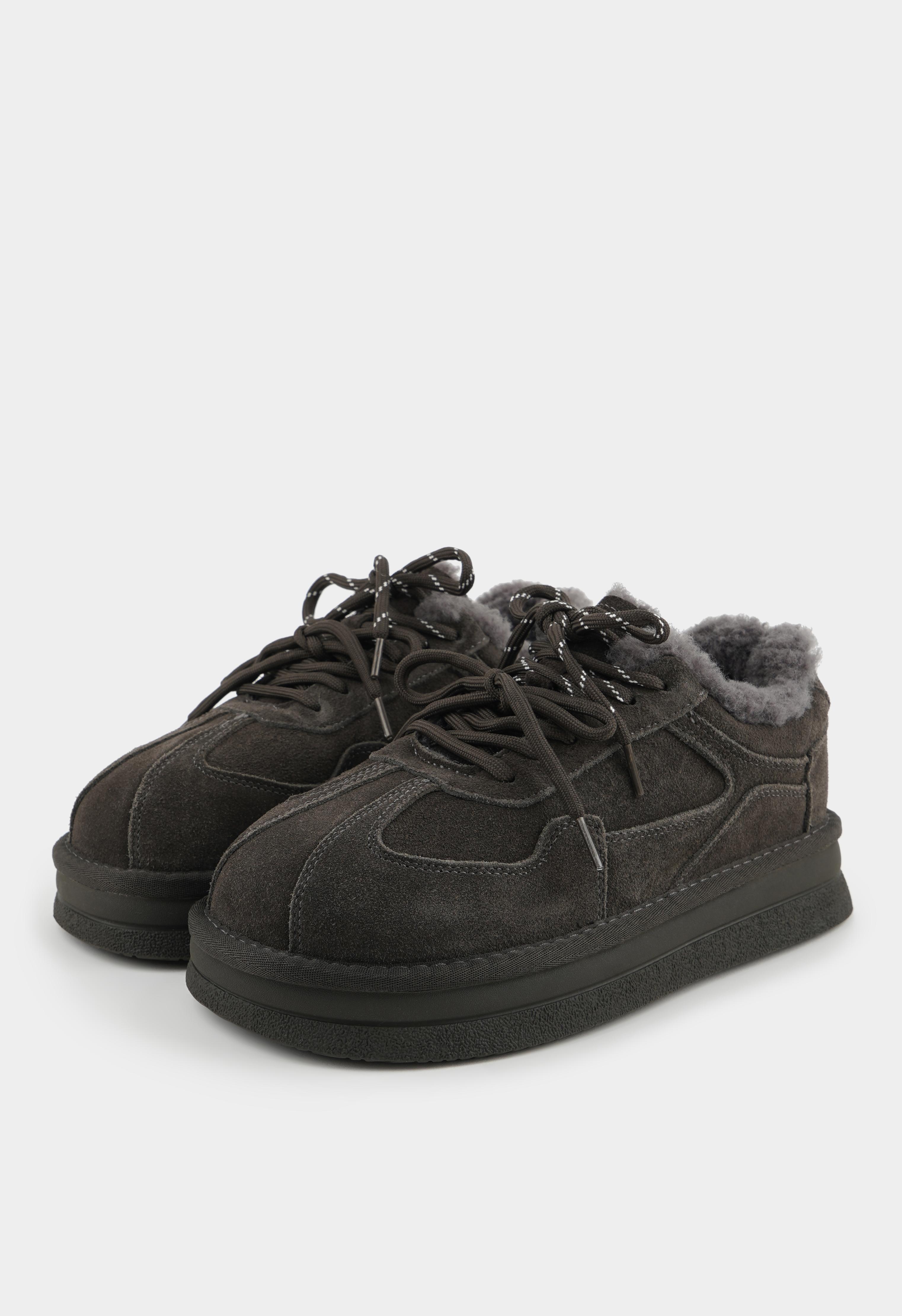 Актуальные полуботинки серого цвета станут стильным акцентом вашего зимнего гардероба, сочетая практичность и элегантность. Модель выполнена из мягкой натуральной замши, внутренняя отделка из натуральной шерсти обеспечивает комфорт и тепло в любую погоду. Жесткая подошва гарантирует устойчивость на разных поверхностях, округлый мысок делает обувь удобной для повседневной носки, а бронзовая фурнитура и аккуратная шнуровка добавляют утонченные детали в дизайн. Благодаря платформе шаг остается уверенным и легким, а образ – современным и гармоничным.